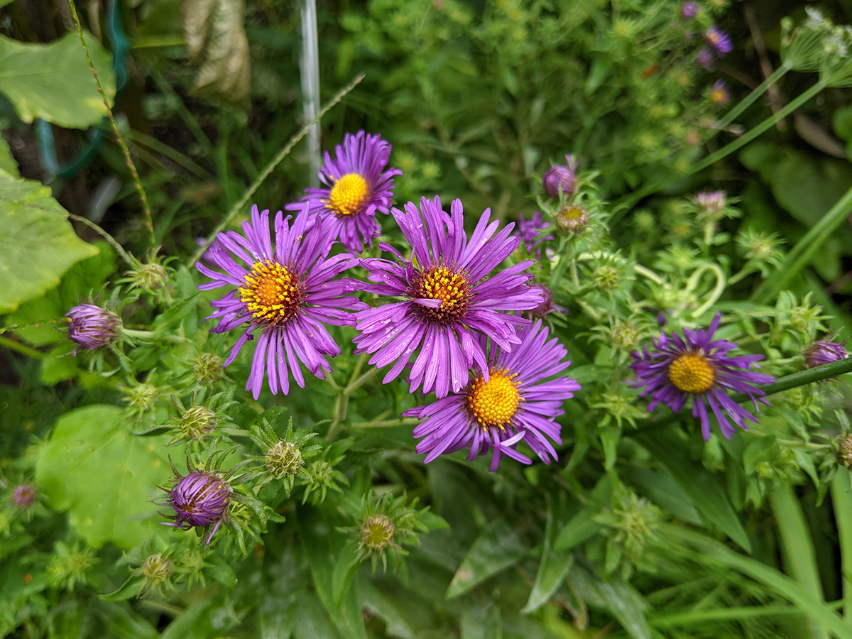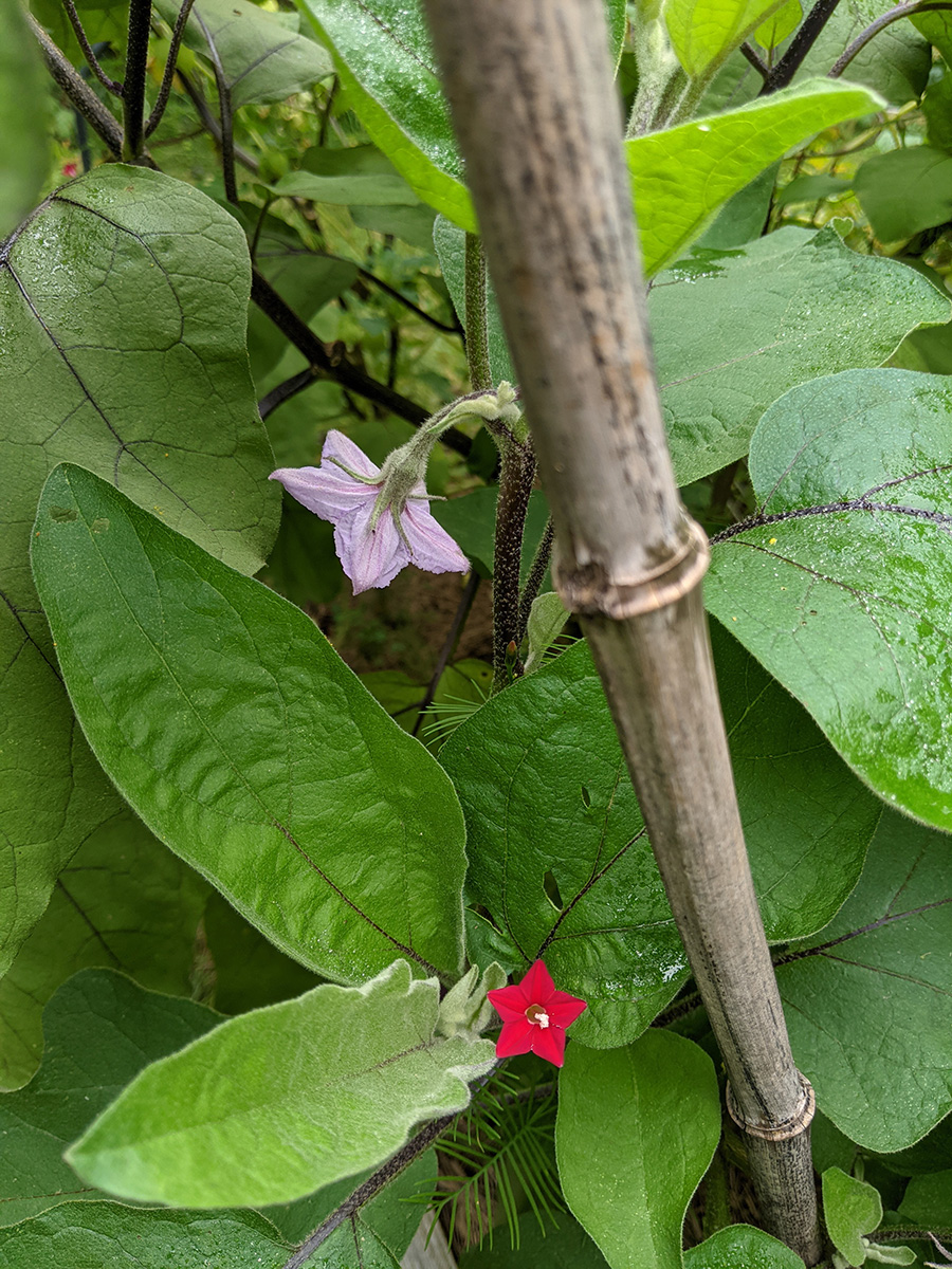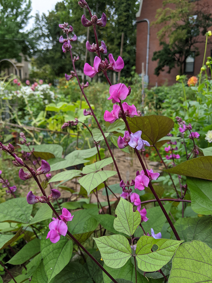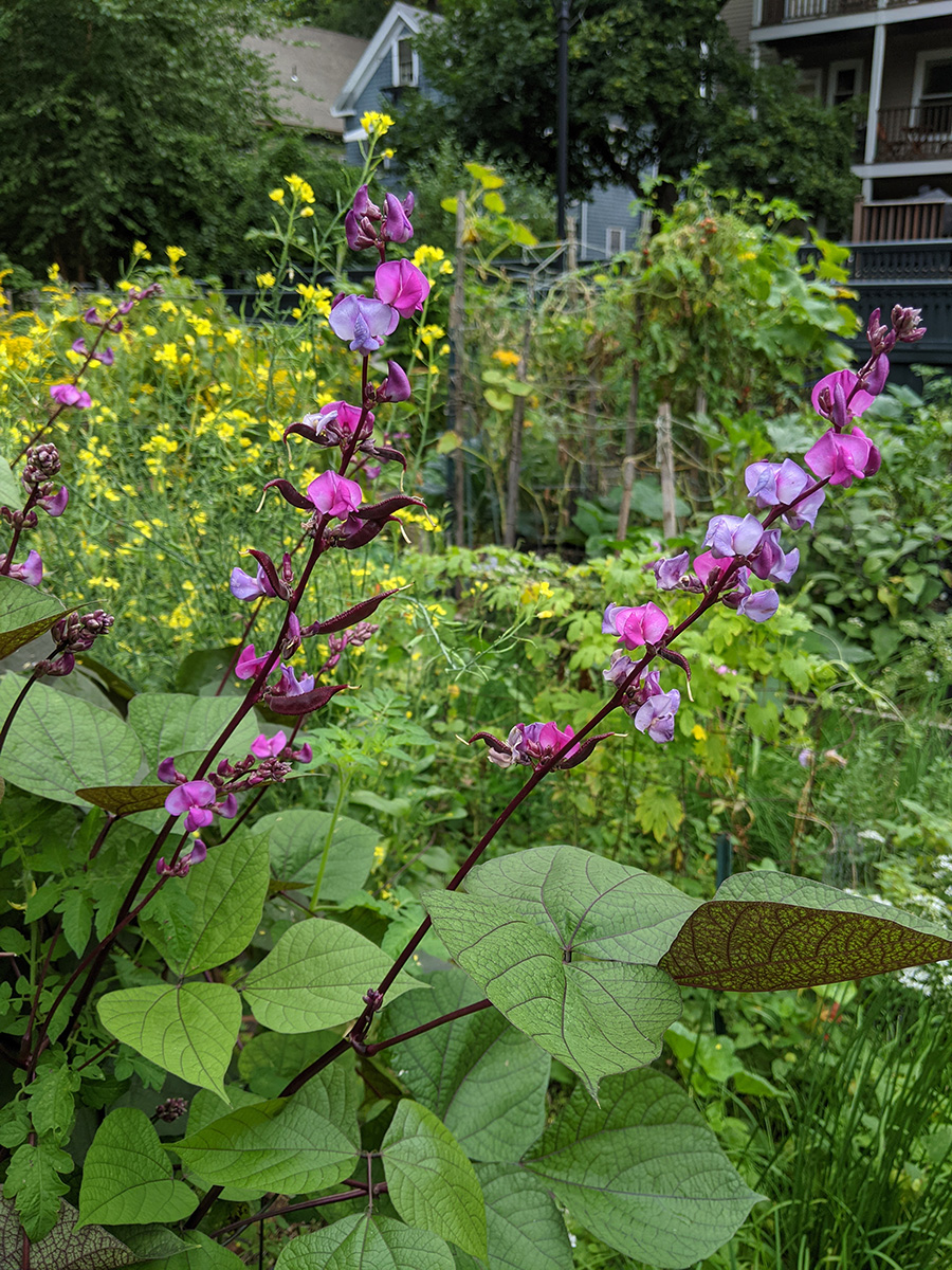 i haven't been to my community garden since wednesday (today being saturday). that bitter melon? it burst, spilling its seeds onto the ground. that was actually a good thing, because the slimy red seed coat seemed to have washed off and all i had to do was collect the seeds themselves. i seem to have a profusion of violet colored flowers in my plot: the hyacinth beans, the chinese asters, the regular asters (a migrant), and my striped mallows (which miraculously continue to flower). there are also white garlic chive flowers (though they're season are coming to an end), yellow goldenrods, and red nasturtiums. late in the season, my garden seems to have a second life. the hyacinth beans are doing especially well, a happy accident. i believe i'm the only gardener who's growing these beans this year. i wasn't planning on eating them, but i'm growing enough that i'll have more seeds than i know what to do with, so if i collected some to eat i still have plenty left over.