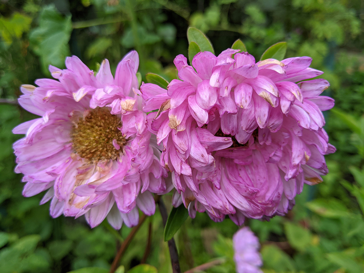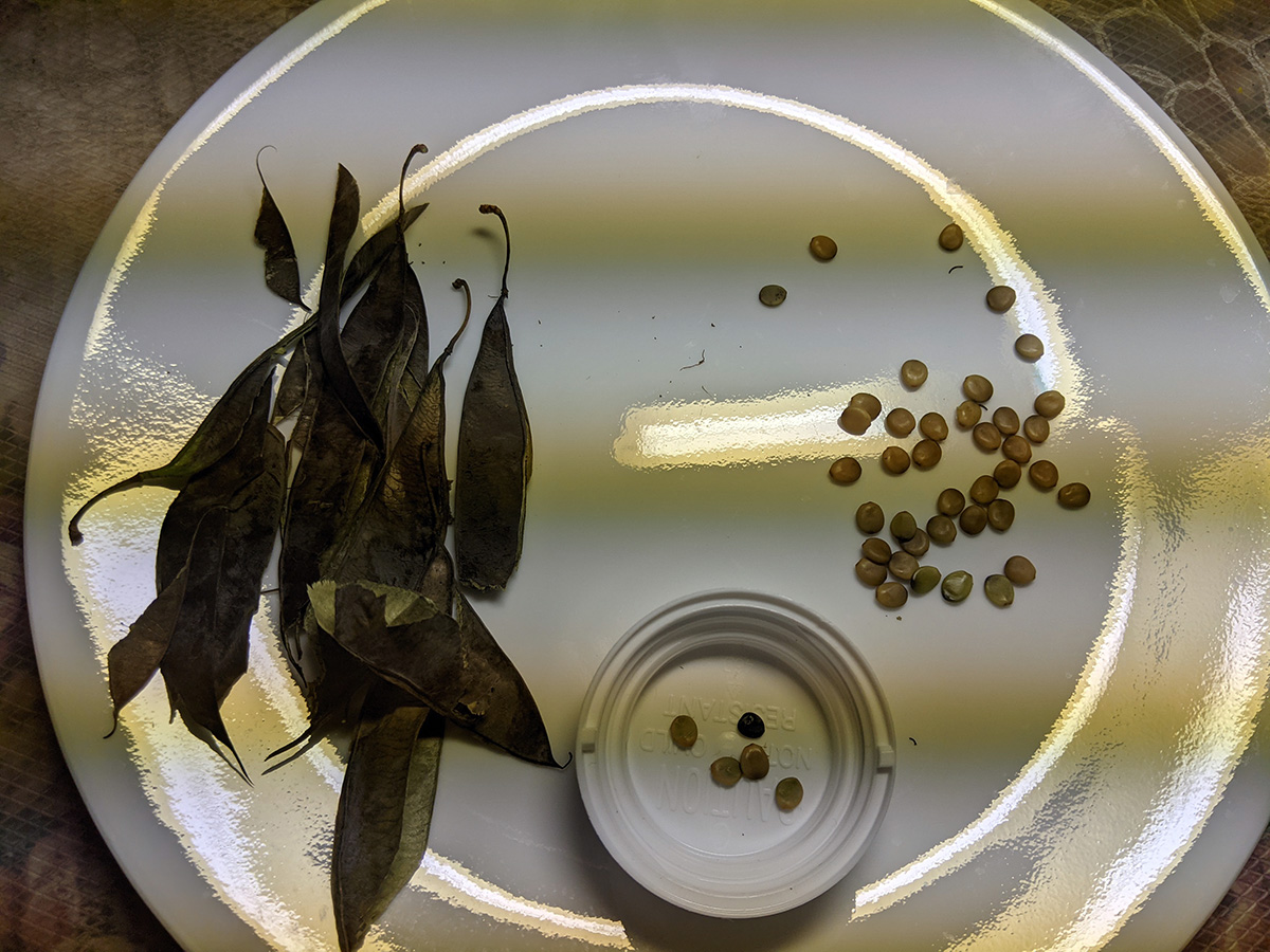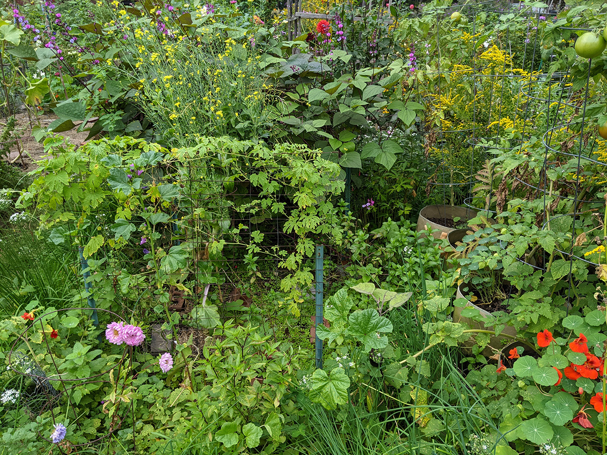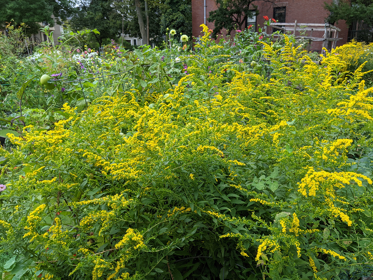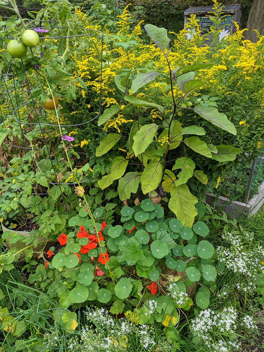 i haven't been to my community garden since wednesday (today being saturday). that bitter melon? it burst, spilling its seeds onto the ground. that was actually a good thing, because the slimy red seed coat seemed to have washed off and all i had to do was collect the seeds themselves. i seem to have a profusion of violet colored flowers in my plot: the hyacinth beans, the chinese asters, the regular asters (a migrant), and my striped mallows (which miraculously continue to flower). there are also white garlic chive flowers (though they're season are coming to an end), yellow goldenrods, and red nasturtiums. late in the season, my garden seems to have a second life. the hyacinth beans are doing especially well, a happy accident. i believe i'm the only gardener who's growing these beans this year. i wasn't planning on eating them, but i'm growing enough that i'll have more seeds than i know what to do with, so if i collected some to eat i still have plenty left over.