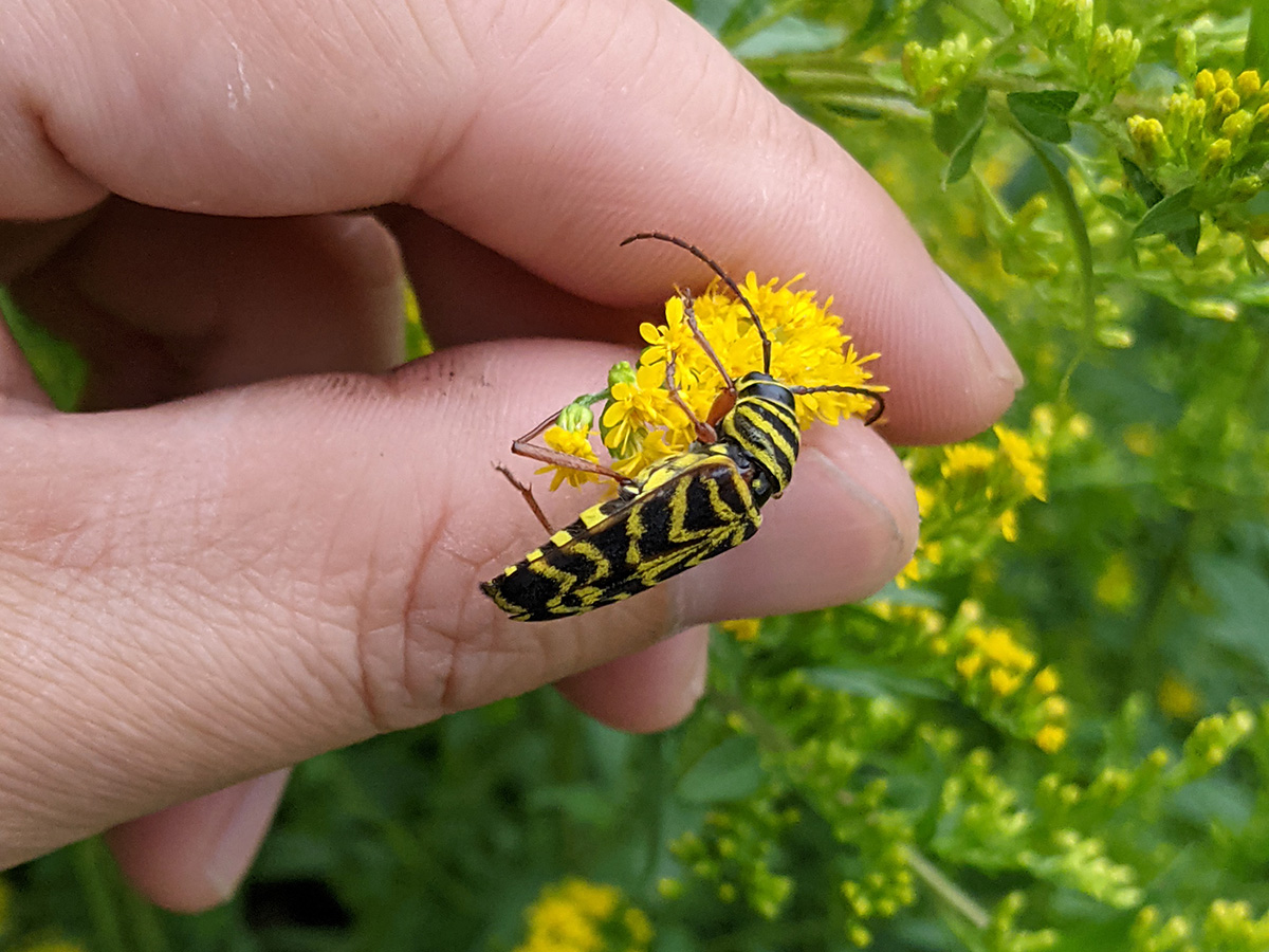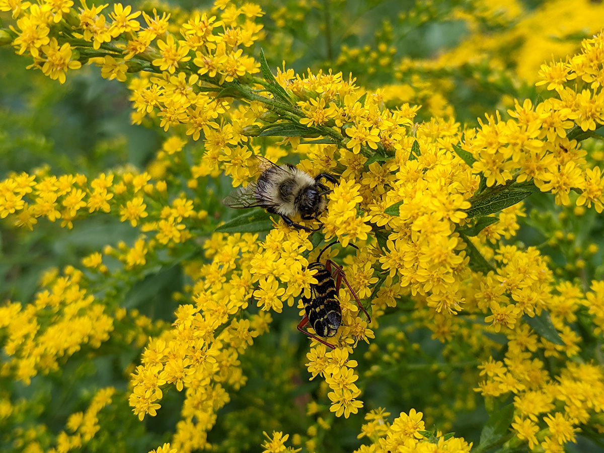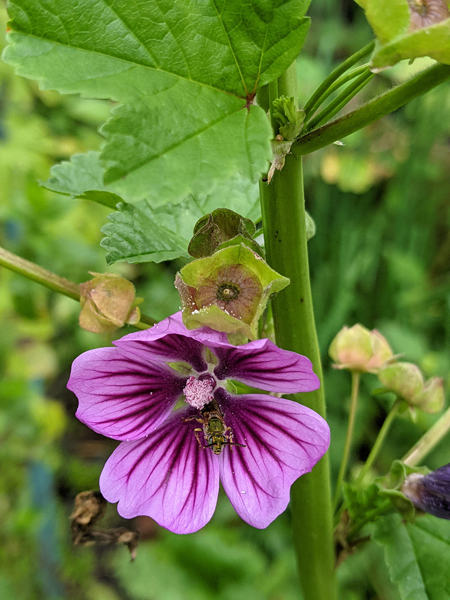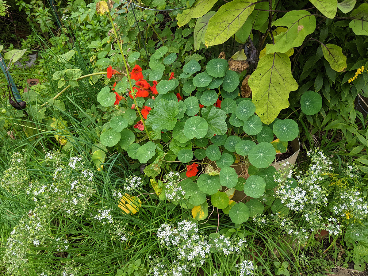 i haven't been to my community garden since wednesday (today being saturday). that bitter melon? it burst, spilling its seeds onto the ground. that was actually a good thing, because the slimy red seed coat seemed to have washed off and all i had to do was collect the seeds themselves. i seem to have a profusion of violet colored flowers in my plot: the hyacinth beans, the chinese asters, the regular asters (a migrant), and my striped mallows (which miraculously continue to flower). there are also white garlic chive flowers (though they're season are coming to an end), yellow goldenrods, and red nasturtiums. late in the season, my garden seems to have a second life. the hyacinth beans are doing especially well, a happy accident. i believe i'm the only gardener who's growing these beans this year. i wasn't planning on eating them, but i'm growing enough that i'll have more seeds than i know what to do with, so if i collected some to eat i still have plenty left over.