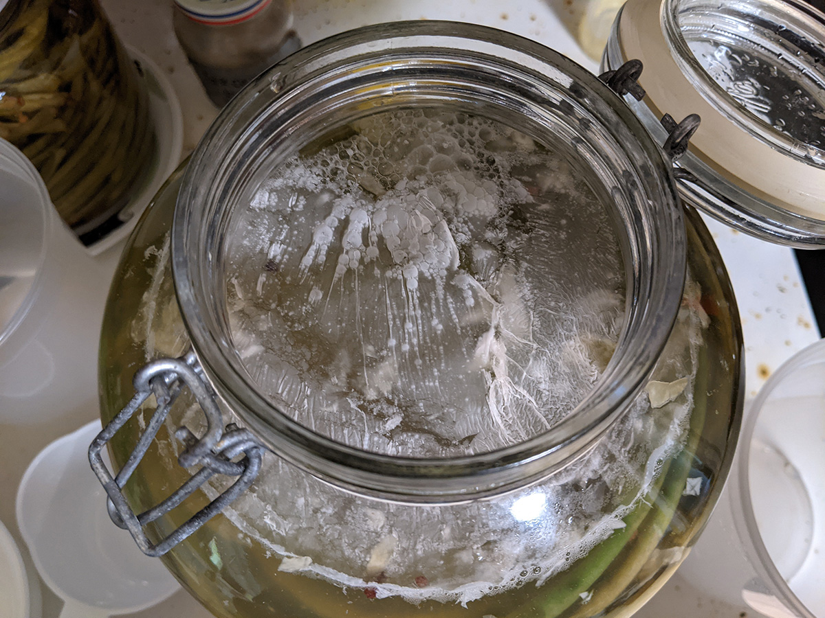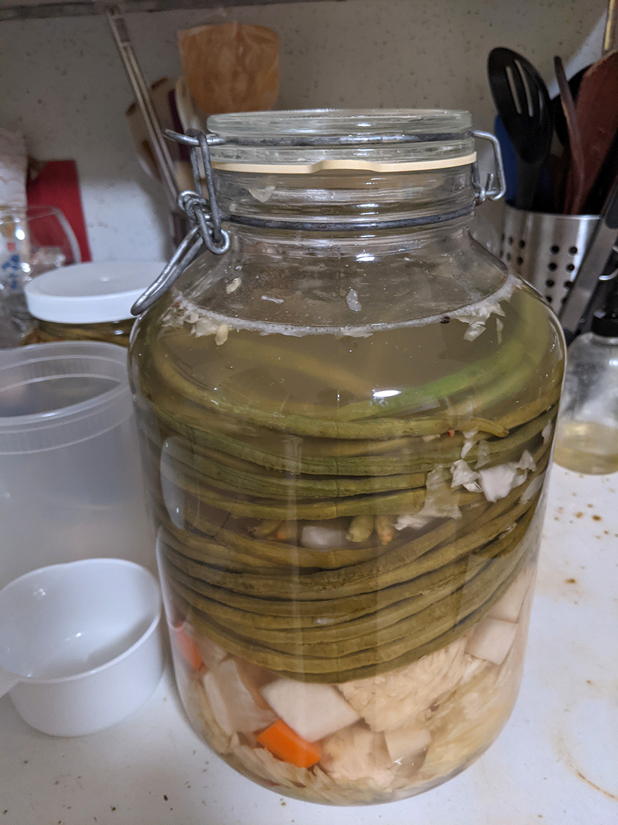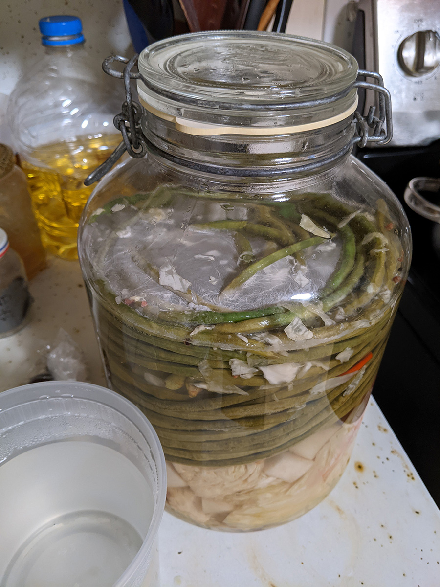 i noticed the paocai jar had a layer of mold floating on top. most likely because my mother added some more long beans, and they weren't all submerged, which caused the breakout. it's not actually mold, but a layer of yeast, which occasionally happens during fermentation and it's harmless, though it looks gross. i mixed 3 cups of boiling water with 1 ounce (measured) of sea salt. once the brine cooled to room temperature, i poured it into the jar to submerge the beans. i then skimmed off the yeast as much as i could.