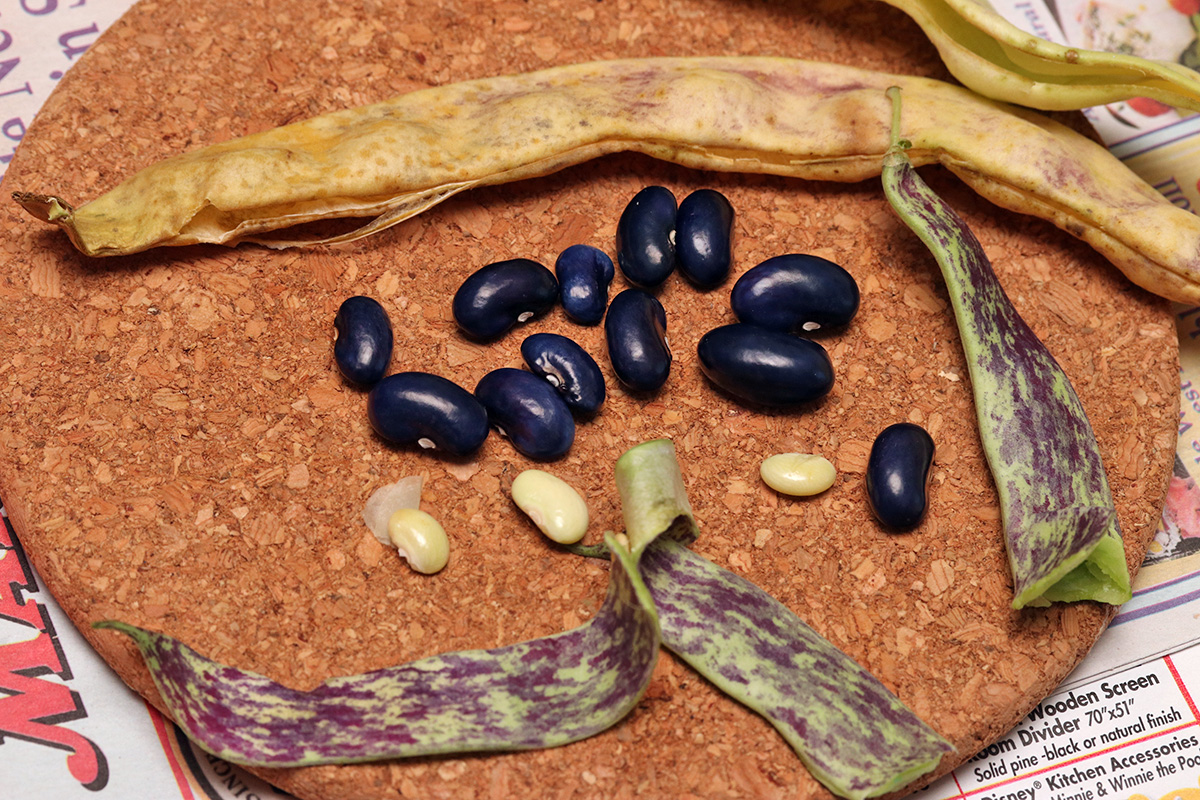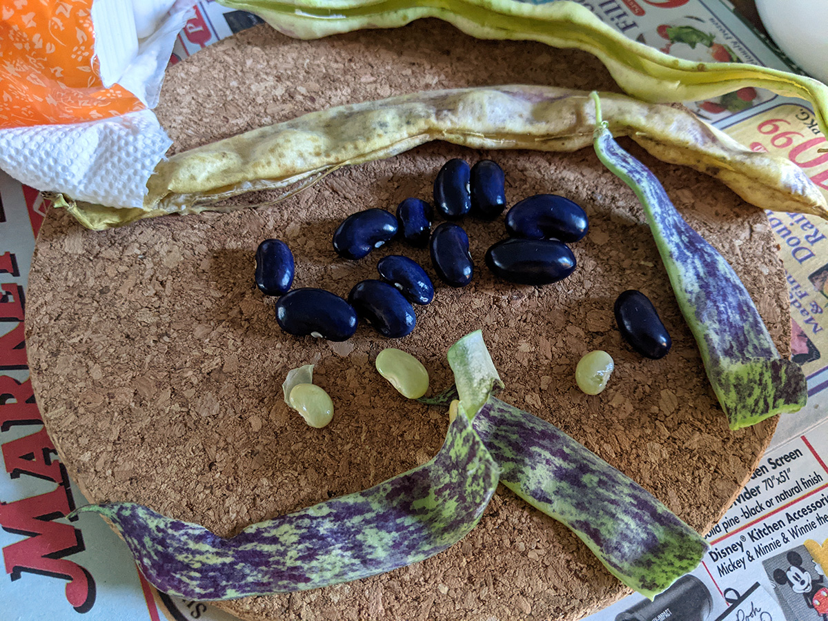 there were some blue beans on the dining table. at first i thought they were jelly beans, but when i looked again i realized they were actual beans. my father said my mother collected them. when i asked her where from, she said, "the place where all the butterflies." the watertown community garden? she secretly picked a few pods last weekend and only now found them in her purse. these blue beans might be nonna agnes' blue beans. as for the other seed pods with the splotching shells, they might be dragon tongue beans. we might try growing some of these blue beans next season. they're Phaseolus vulgaris so they shouldn't cross-pollinate with the long beans (Vigna unguiculata) or hyacinth beans (Lablab purpurea).
