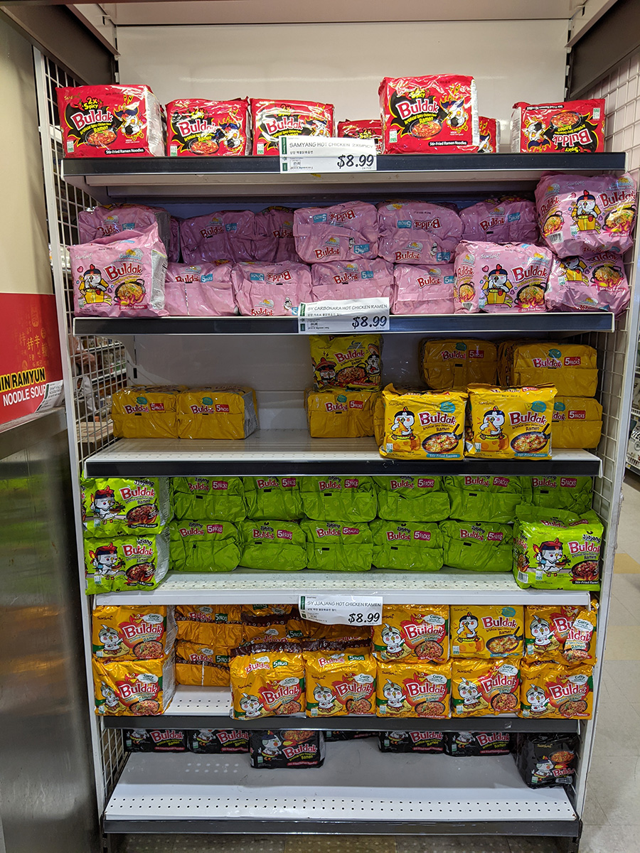 we left by 1:15pm, drove to the burlington h-mart. the place has a strong fishy smell, or it could just be the kimchi. you notice it at first, but then you get used to it. things at h-mart can be expensive, even korean staples you'd imagine would be the cheapest here. for example, buldak stir-fried noodles. at h-mart it's $8.99 for a 5-pak, while at market basket it's only $5.99. what it lacks in affordability, it makes up for in selection. something seems to be a little off with this burlington h-mart. boxes clog aisles, there's a leak in one of the frozen foods department that they just taped off instead of trying to fix, and i saw cartons of filipino ice cream that were all broken apart and expired but nobody seemed to care. are they having a hard time finding workers? let's just say this h-mart has seen better days. i wouldn't mind if it went out of business and maybe a ranch 99 takes its place, that'd be my dream-come-true.