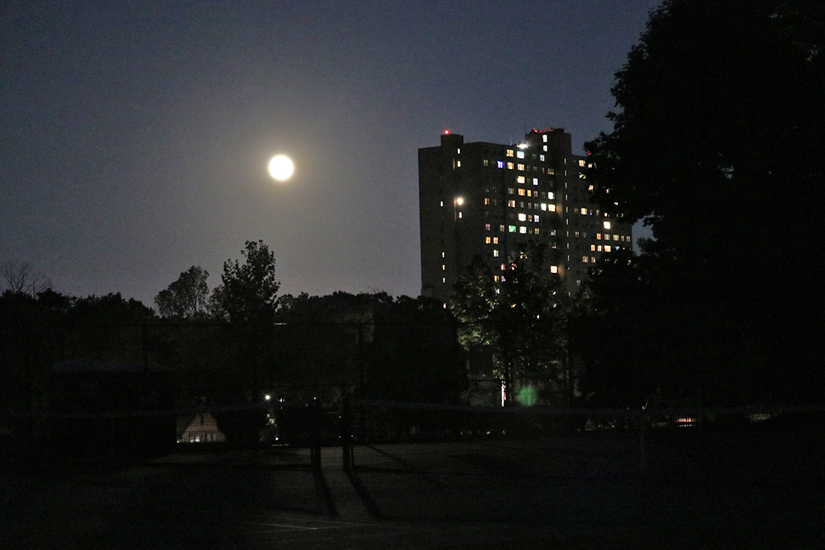 after i came back inside, i convinced everyone to go to the nearby park to see the harvest moon. at first we thought it was still below our horizon, but as we got closer to the park, we saw the moon in the sky, next to the 700 huron avenue apartment building.