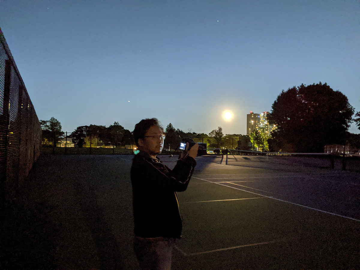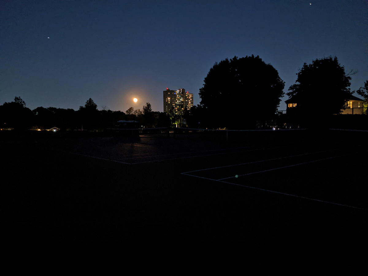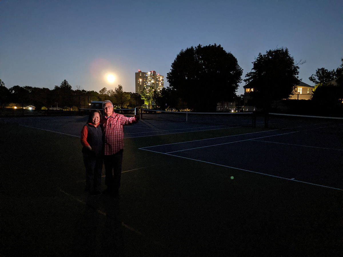 the tennis court was unlocked and we went inside to take photos. one good thing about standing in the tennis court was no mosquitoes. i was having a hard time getting any good moon photos with my dSLR 55-250mm lens. i had better luck with my google pixel phone, using the night sight setting. i took some photos of my parents, illuminating by the glow of my mother's phone.