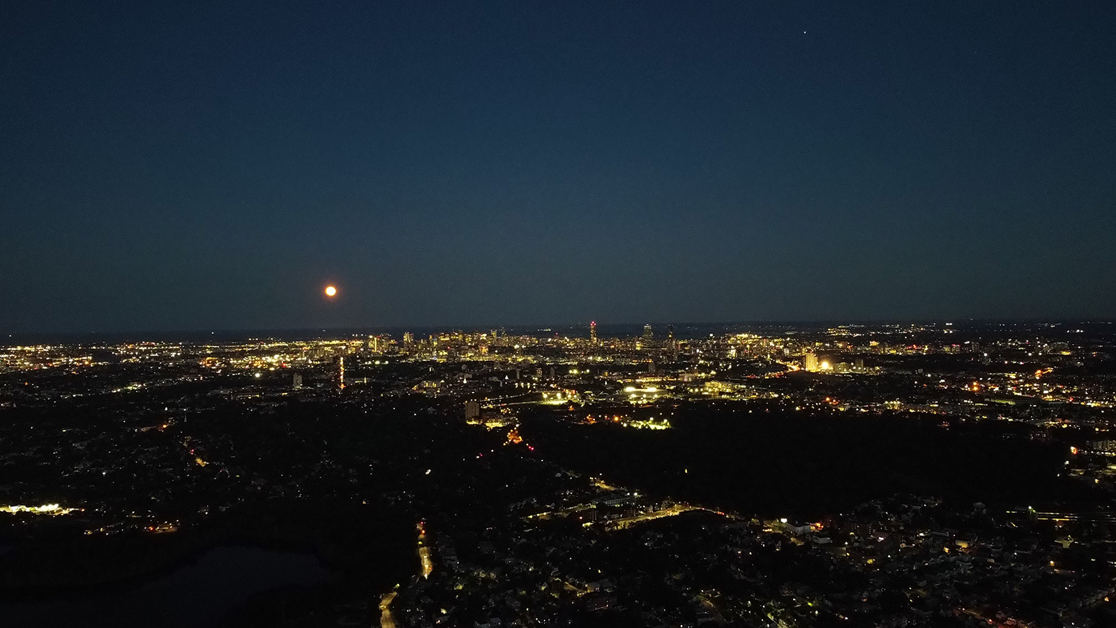 moonrise was officially at 7:02pm, i decided to launch the drone into the sky first from the backyard to see if i can see the moon with zero obstruction. it was coming up just to the left of boston. my father was outside with me, and used a flashlight as a beacon when i brought down the drone. he was also in charge of slapping the mosquitoes off of me as they swarmed around.