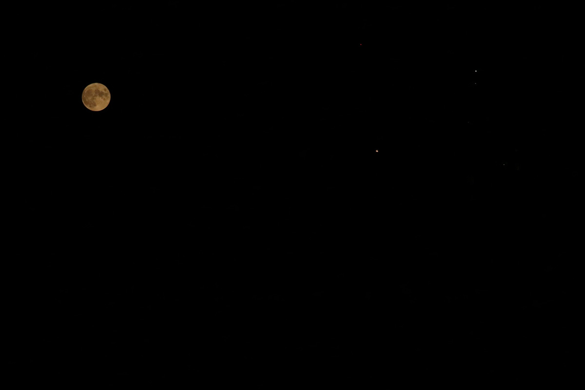 tonight was the harvest moon. when i rode home last night, the moon was already full, seemed to take up most of the sky. tonight was the official date for the full moon, and i was hoping to get some photos. moon photography is tricky: either it's over exposed and the moon is just a white circle in the night sky, or too underexposed and all you see is the moon while everything else is black.