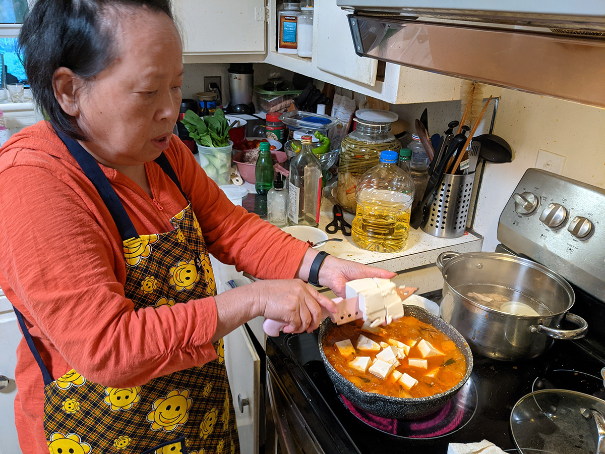 my mother made korean soondubu jjigae (korean tofu stew) for dinner, that was another reason for going to h-mart today, to collect some additional ingredients (like dried anchovy for the broth, and a choice cut of beef). the silken tofu was courtesy of russo's. it was good for a first try, but next time: less sugar, as it masked the other flavors; more kimchi - we used half a jar of old kimchi that'd been sitting in the fridge - sour and savory, but it could've used even more of it; we cooked the beef beforehand, but i wonder if it wouldn't have been even more tender if we just left it to cook in the broth? overall the soondubu jjigae was a little bland. next time, maybe saltier, more sour, more spicy.