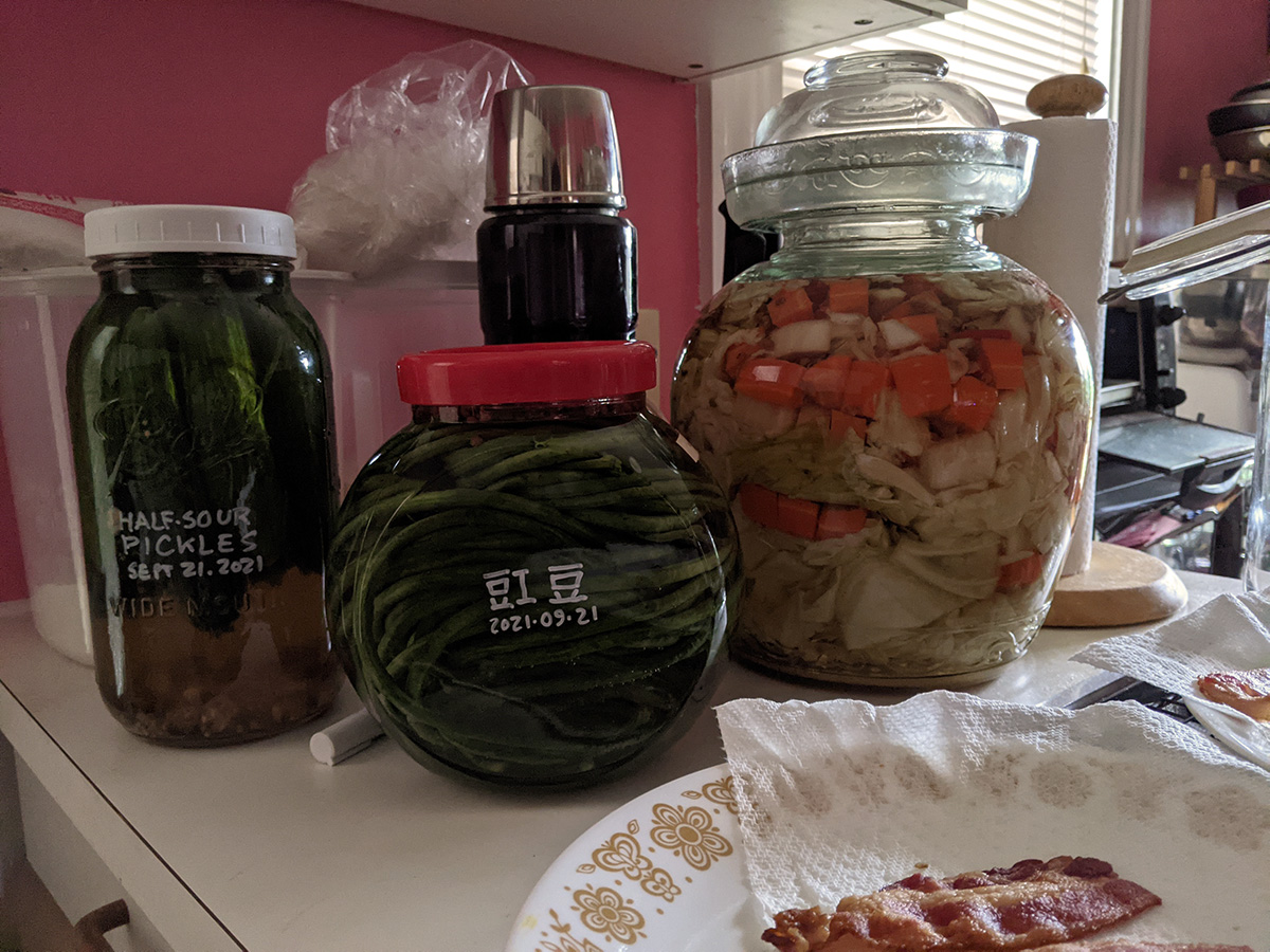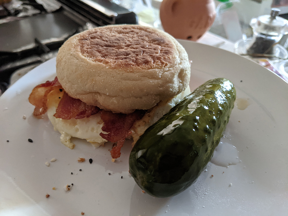 in line with making lunch with ingredients i already had in the house, i made an english muffin sandwich with egg, bacon, and cheese. i added a soft nathan's half sour pickle to class it up.