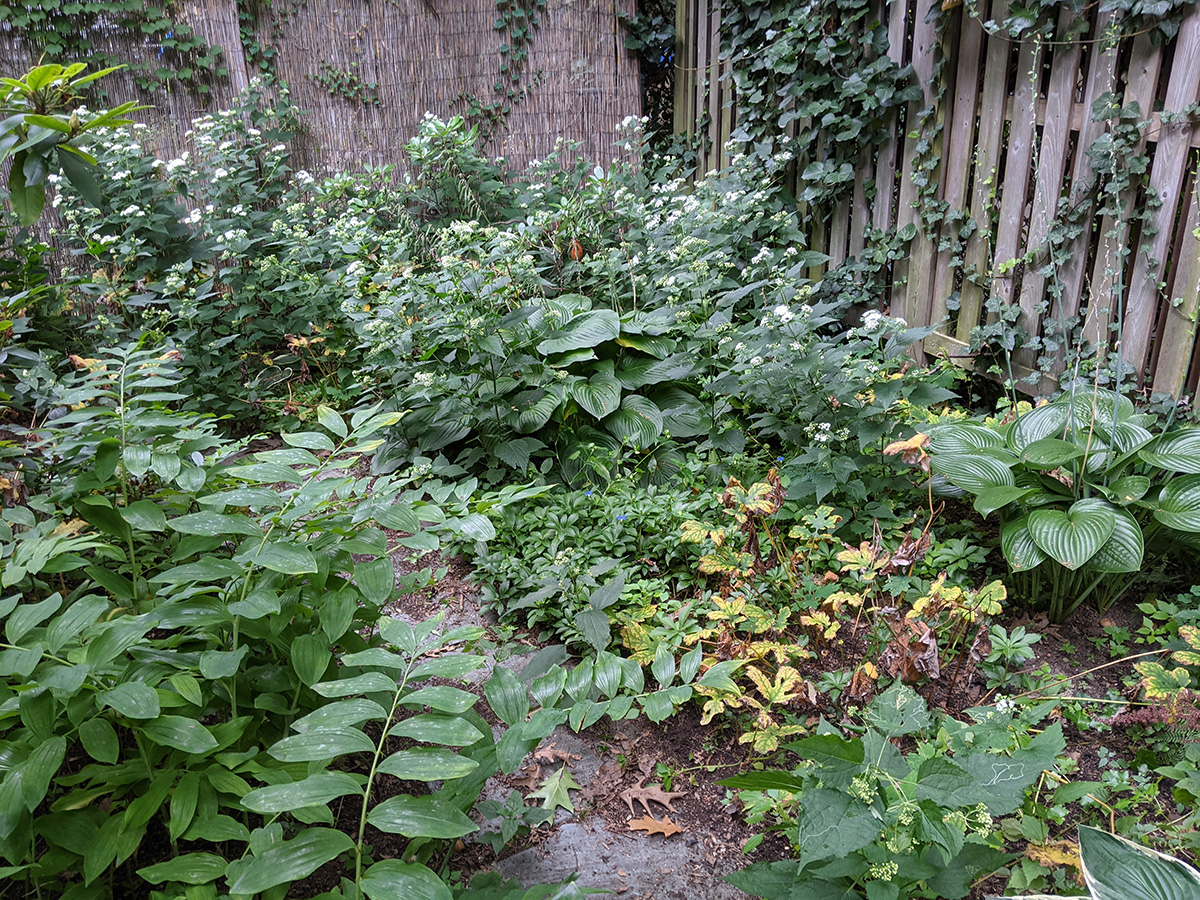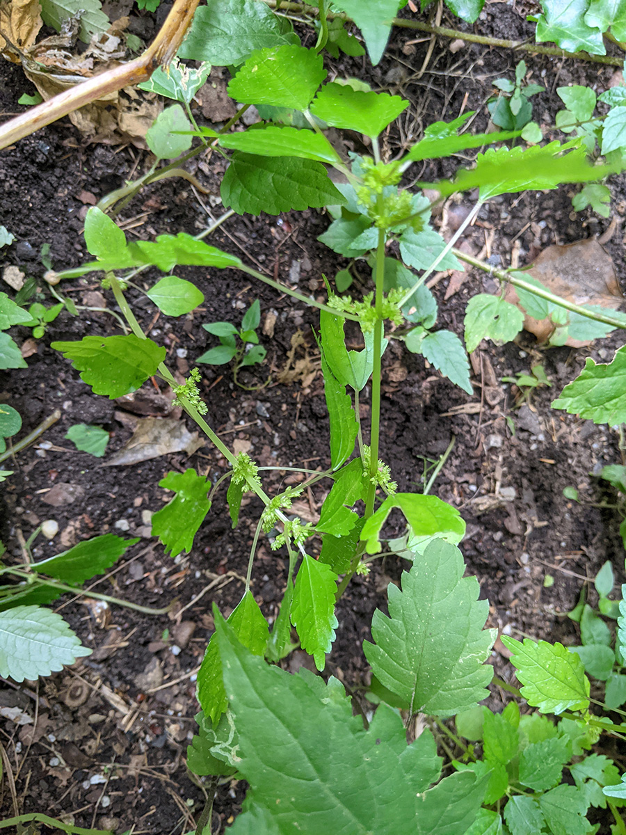 in the early afternoon during a lull in the weather, i went outside and did some pruning and weeding. i trimmed back all the ivy growing on the wall in front of the house and pulled up all this weed in the backyard. i don't know what it's called but i've seen them before, in my backyard, in the community garden, and in my parents' backyard. later i found out they're called clearweed. by the time i finished, i'd gotten at least 4 mosquito bites.