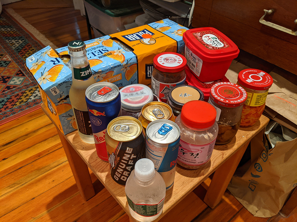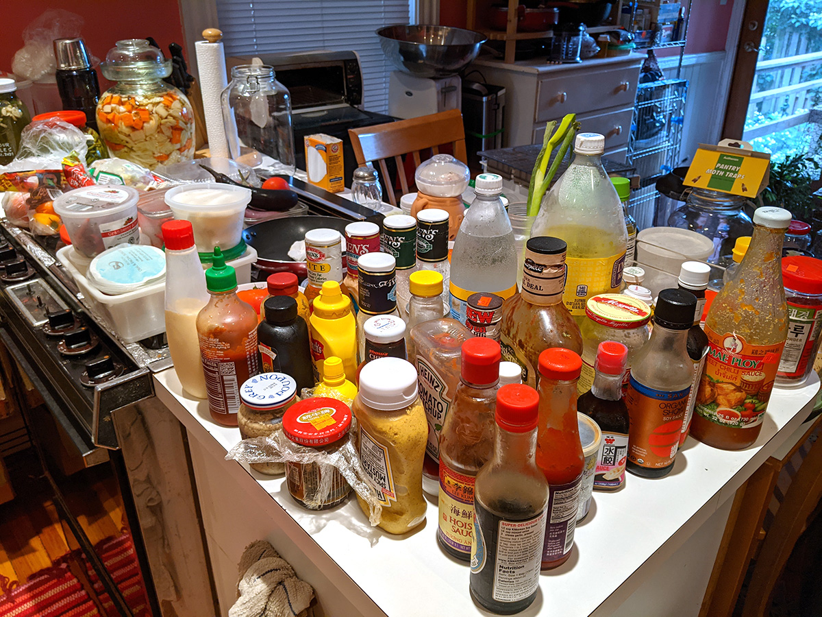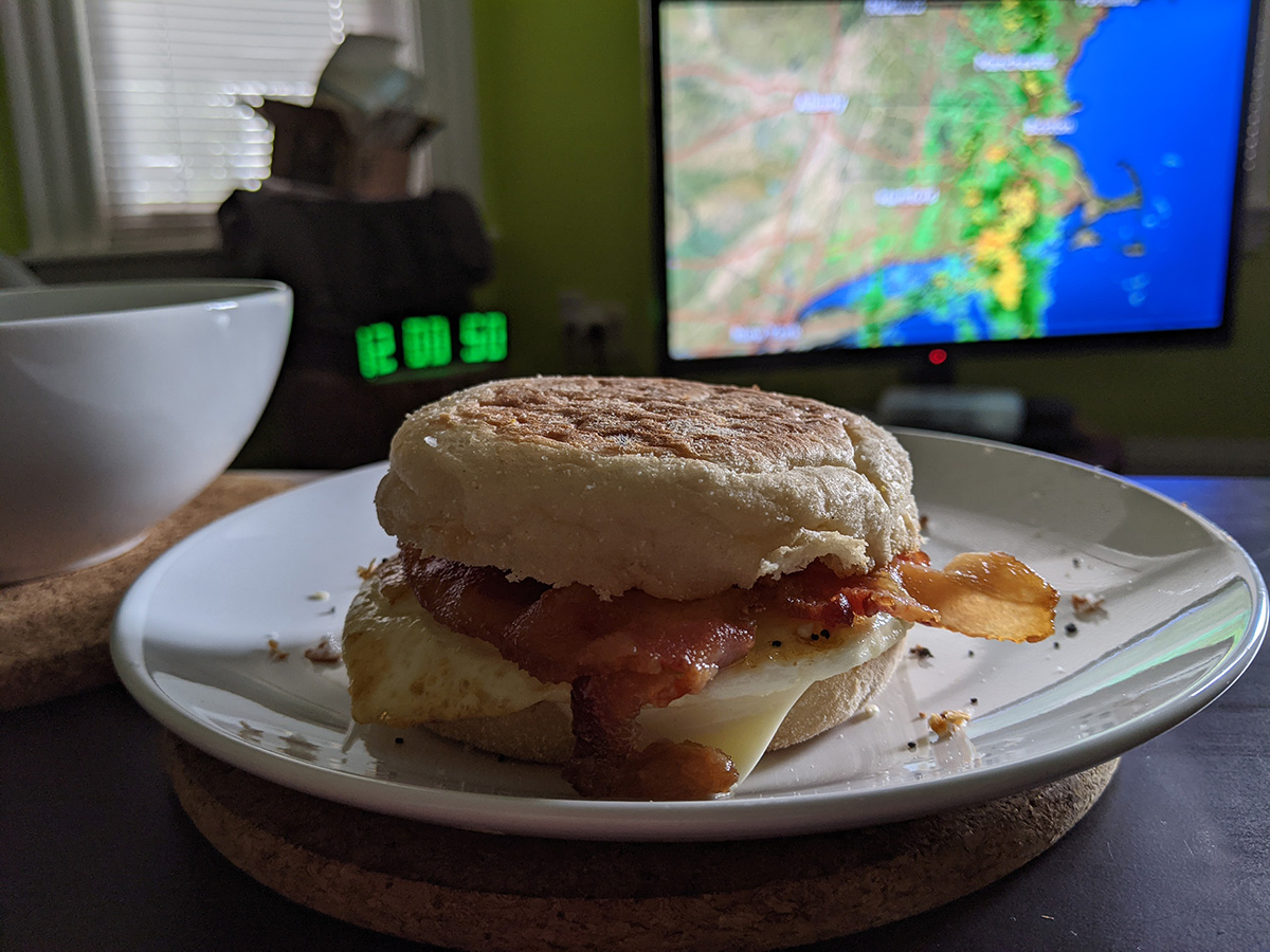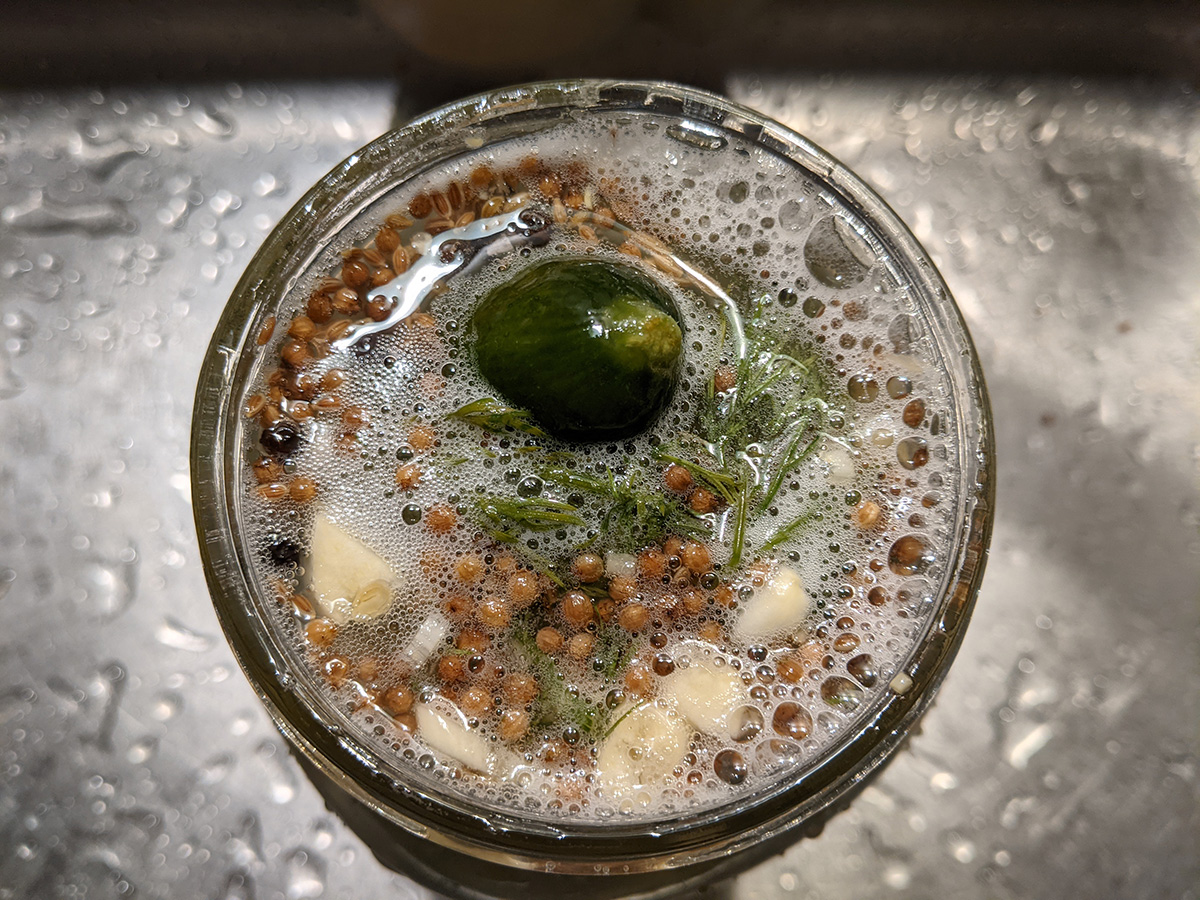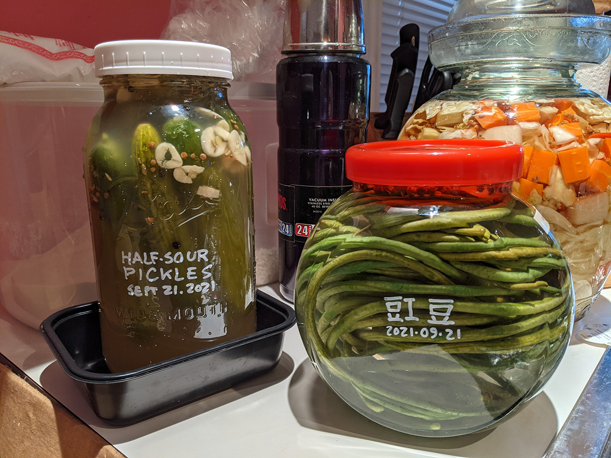 today was a day waiting for rain, but the most we got was just an intermittent splash that would just as soon dry up. in hindsight, i could've gone to haymarket (to get some baby pickles) or chinatown (to get some green plums) without getting soaked. i noticed my pickles were emitting a strong smell. when i checked the jar, there was some brine juice leaking out. i tightened the lid, but there's so much pressure, it managed to bulge the plastic cap and squeeze out some liquids. i cleaned it up and opened the lid to let the pickles burp before capping it back up again. i haven't tried them yet, but i figured it still needs a few more days of countertop fermenting before it can get a nice flavor. today the toom temperature inside the house was 80 degrees. for lunch i made another bacon-egg-cheese english muffin sandwich like yesterday.