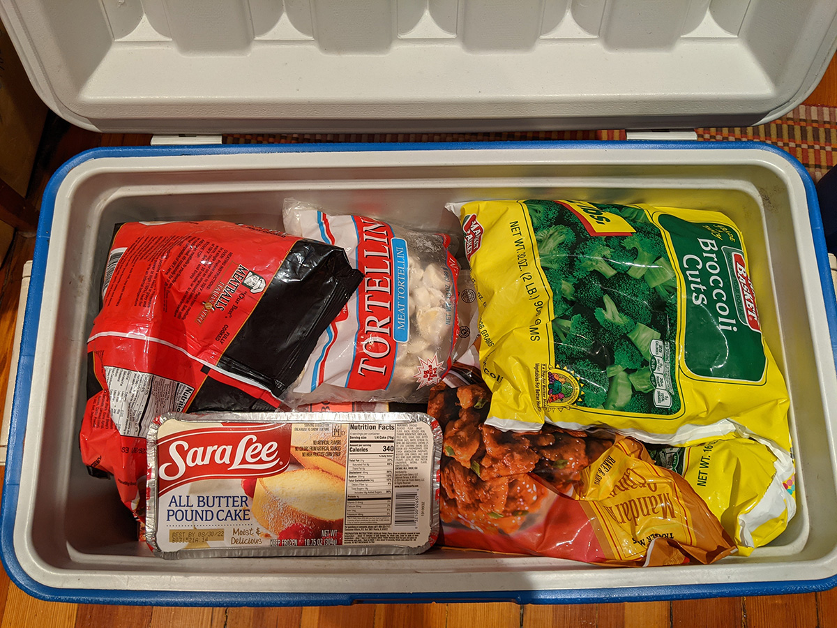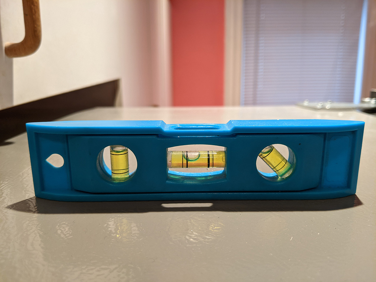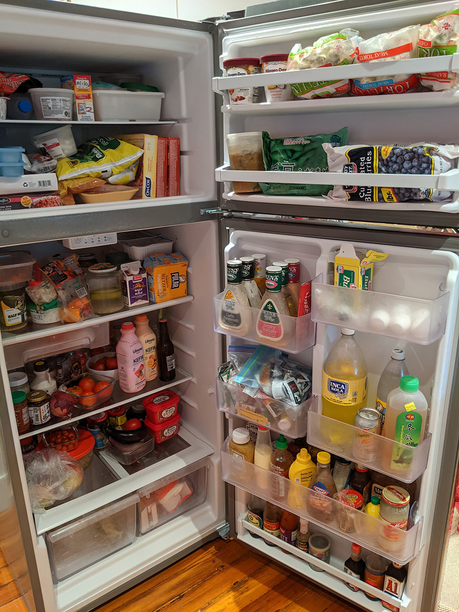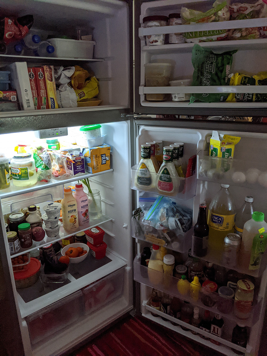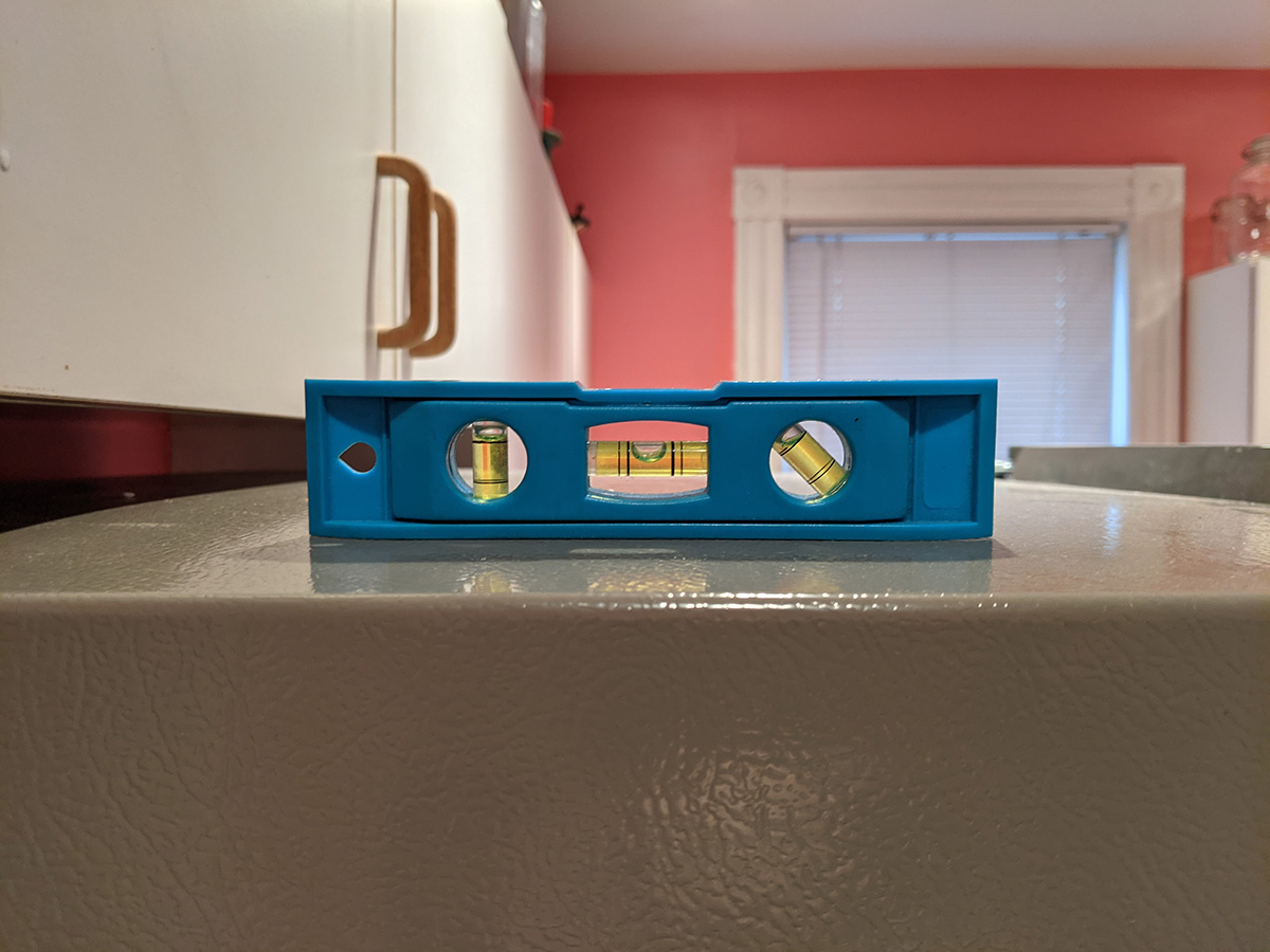 in the afternoon i releveled my refrigerator for the 5th time (at least), when i realized the whole reason why the fridge door was having a hard time closing was because even though the fridge was leveled on its outer side, in the center it was tilting forward. i learned my lesson: instead of putting all the food together to sort out later, i put each fridge shelf items either in its own cooler or countertop space. leveling was pretty easy, i just remembered one level of composite shims, then pushed the fridge back, before returning all the foods. in all it took just 20 minutes. now the fridge door closes on its own.