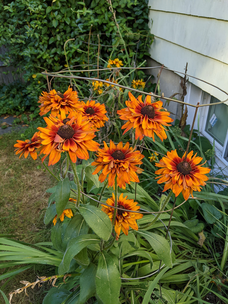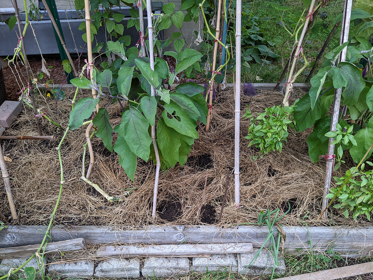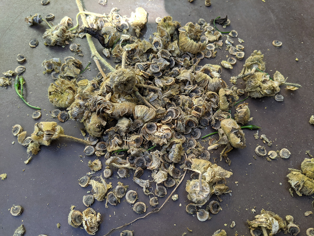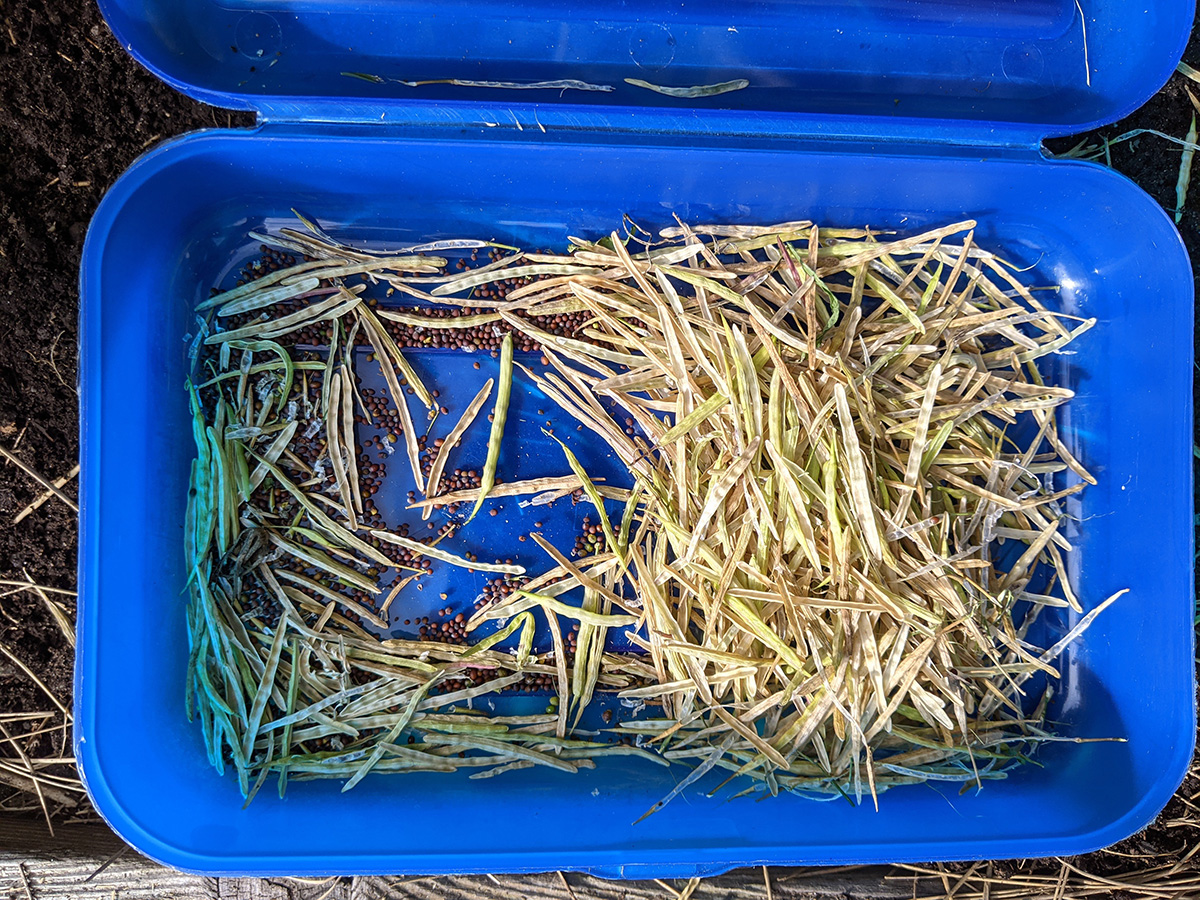 i collected some seeds today: hollyhocks, rudbeckias, chinese aster, and mustards. afterwards i prepared RB1 and placed a row of daikon radish seeds in the back, and sprinkled a bunch of japanese red mustard seeds in the front. we used seeds we harvested directly from RB0, where japanese mustards continue to grow non-stop, though my parents haven't really used the leaves for anything because they're just too spicy.