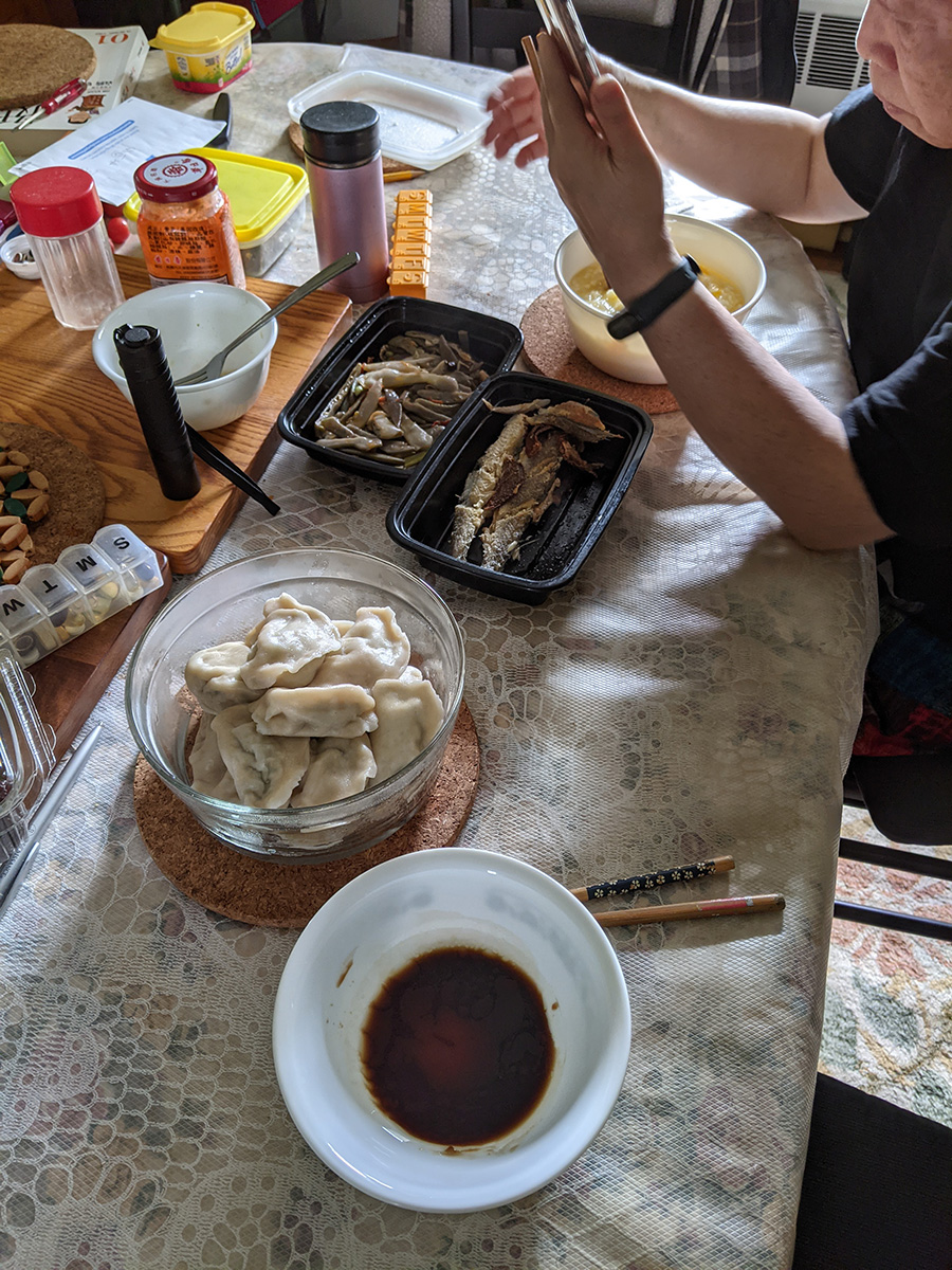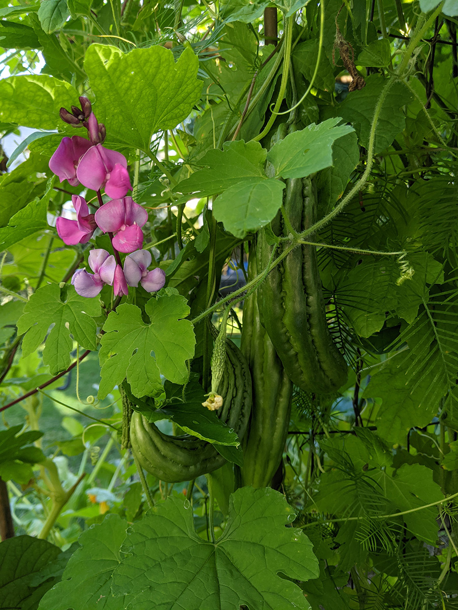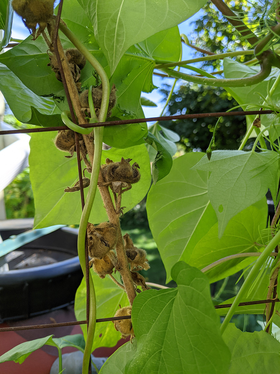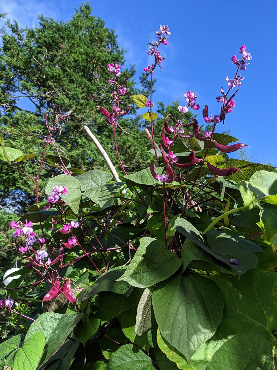 my mother called us inside for lunch. i had some leftover chinese dumplings. i also tried some of the hyacinth beans my mother gave my 2nd aunt who stir fried them. i don't think hyacinth beans are good eating (not compared to long beans), i grow them more as an ornamental and to collect the distinctive black and white bean seeds.