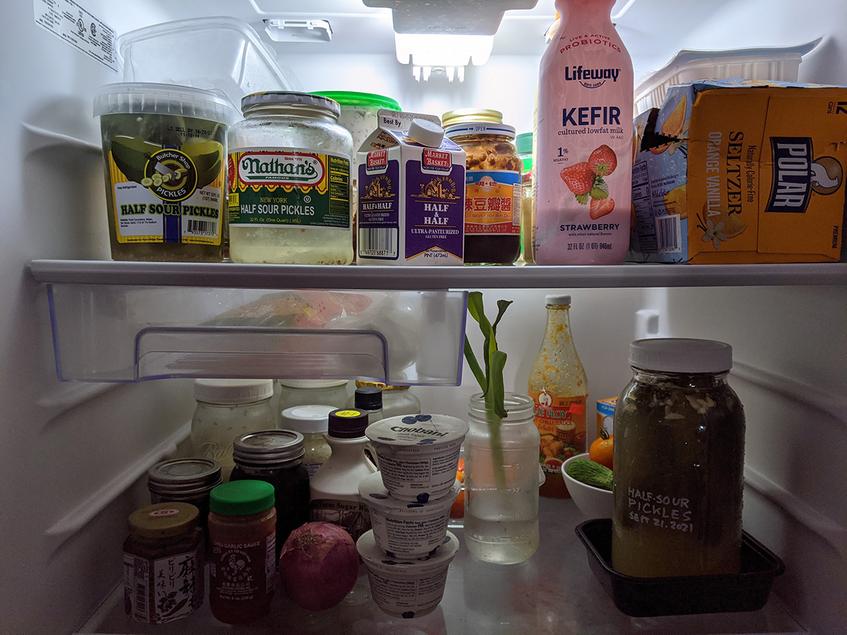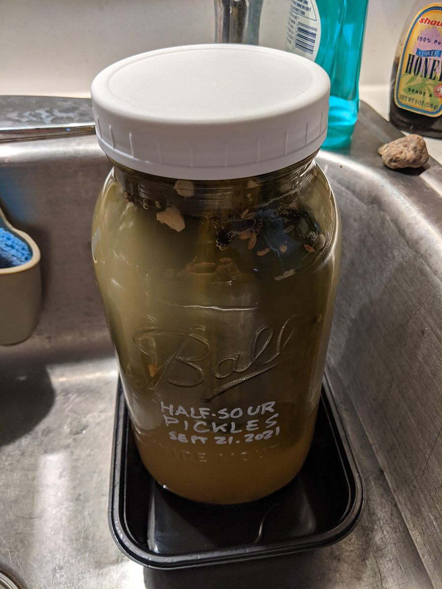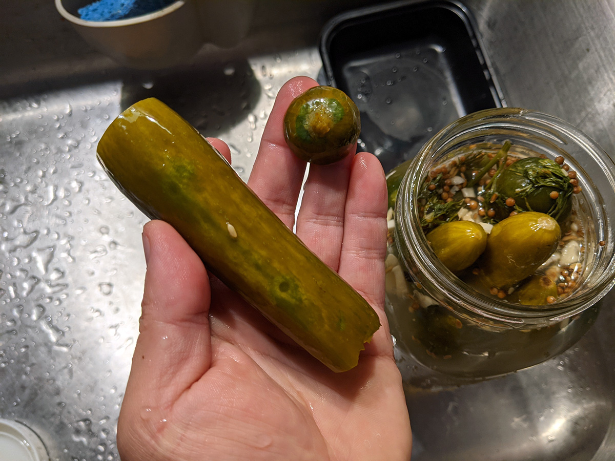 i left my half sour pickles in the sink last night, afraid they might explode and create a big mess. when i woke up, i saw liquids continue to leak out from the pressurized jar. i unscrewed the lid to burp it, then capped it back up to give it a good shake. that's when i noticed something: a few of the pickles were showing blue spots. what's weird was it wasn't at the floating tips, which aren't completely submerged, but instead on the other other ends, the part that's in the brine.