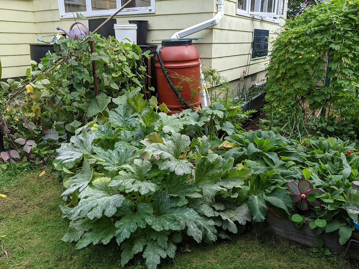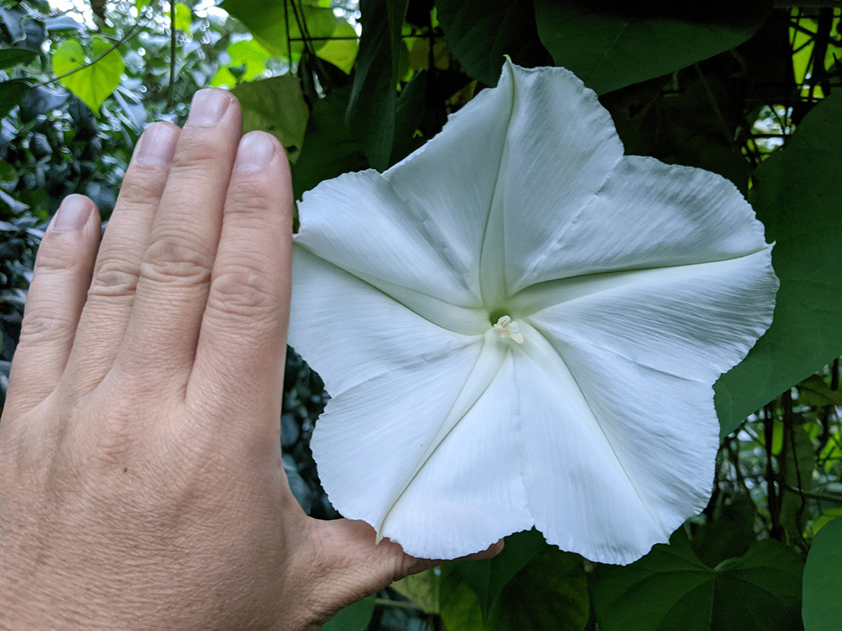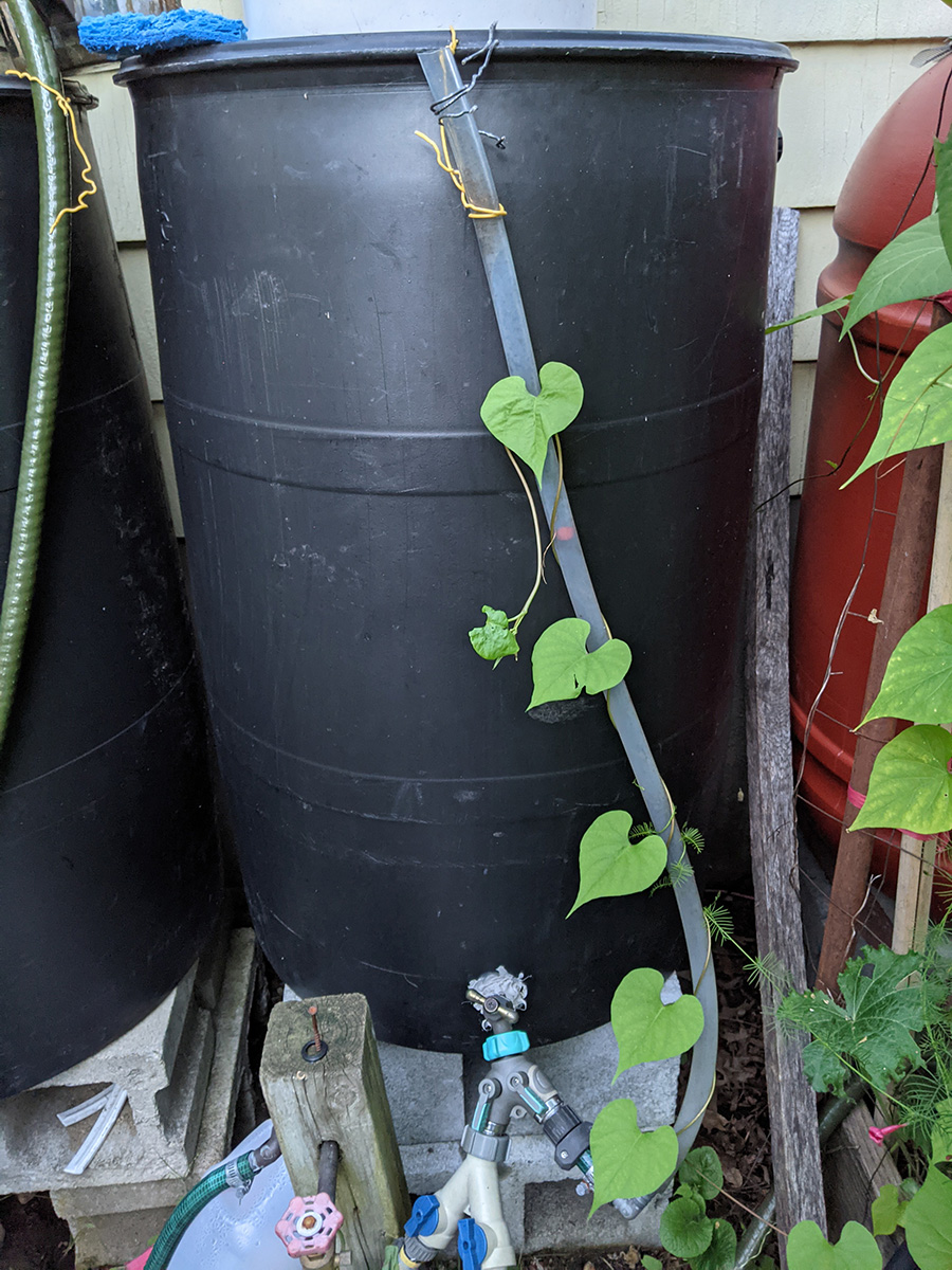 sunset is earlier and earlier these days, tonight being 6:36pm. i knew there'd be rain overnight so i went outside to check the rain barrel gauge to see how much water we still have left (nearly half). i also saw that squirrels had dug up RB1; probably not to eat the seeds i planted earlier, but rather to bury food for the coming winter. i'll put some chicken wire mesh over it tomorrow to keep the squirrels away. i also got a chance to see a full moonflower. they have a nice scent if you get close enough, but probably stronger on warm summer nights, when they're supposed to be blooming, instead of early fall.
