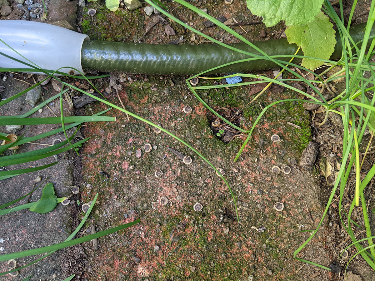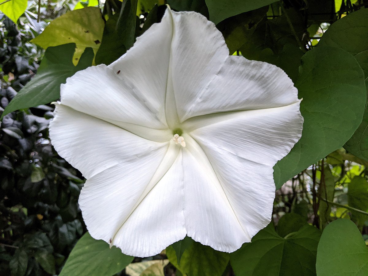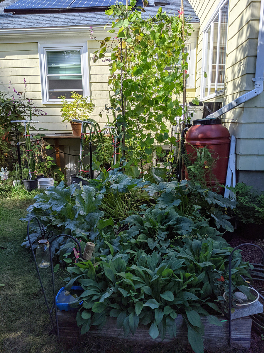 sunset is earlier and earlier these days, tonight being 6:36pm. i knew there'd be rain overnight so i went outside to check the rain barrel gauge to see how much water we still have left (nearly half). i also saw that squirrels had dug up RB1; probably not to eat the seeds i planted earlier, but rather to bury food for the coming winter. i'll put some chicken wire mesh over it tomorrow to keep the squirrels away. i also got a chance to see a full moonflower. they have a nice scent if you get close enough, but probably stronger on warm summer nights, when they're supposed to be blooming, instead of early fall.