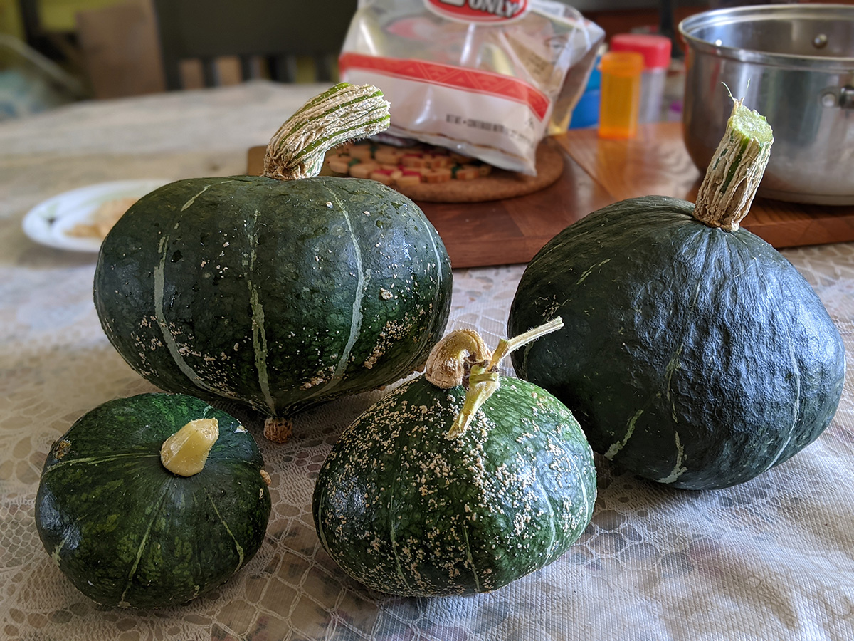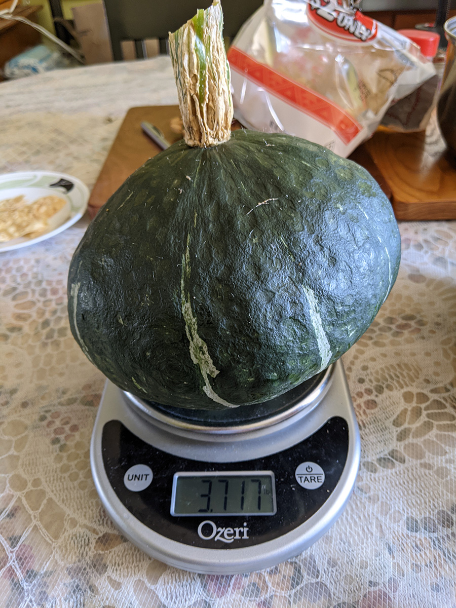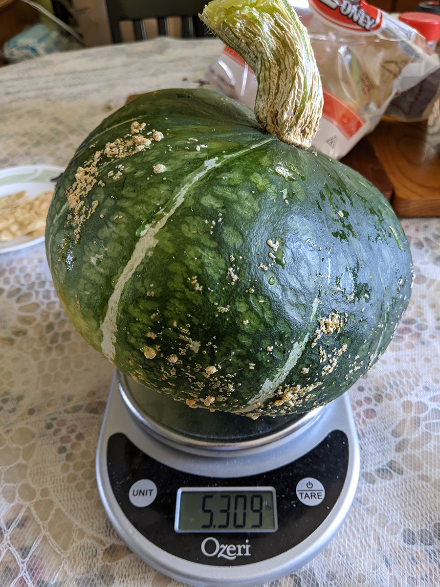 i checked the rain barrel gauge when i arrived in belmont, it was at full capacity. the overnight rain meant we wouldn't have to water today. my father harvested all the "honeysuckle" squashes - so called because these buttercup squashes were growing all over the honeysuckle vines. there was one hanging across the doorway that my father said looked dangerously close to fall because the stem was rotting, so we decided to harvest all the squashes. initially we just saw two - including probably the largest squash we grew this season weighing 5.3 lbs. - but he ended up finding a third squash, about the size of a softball.