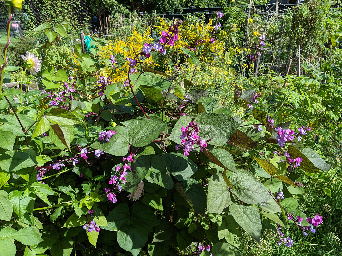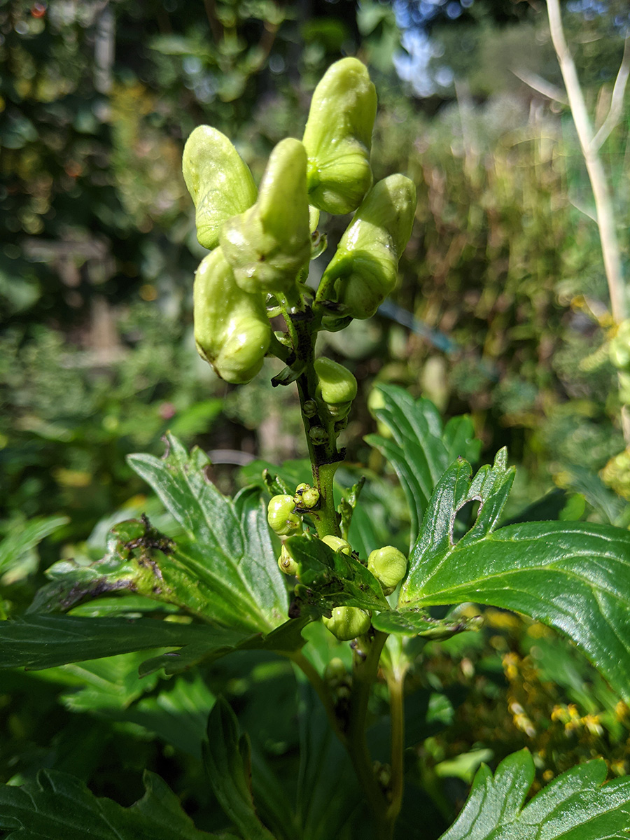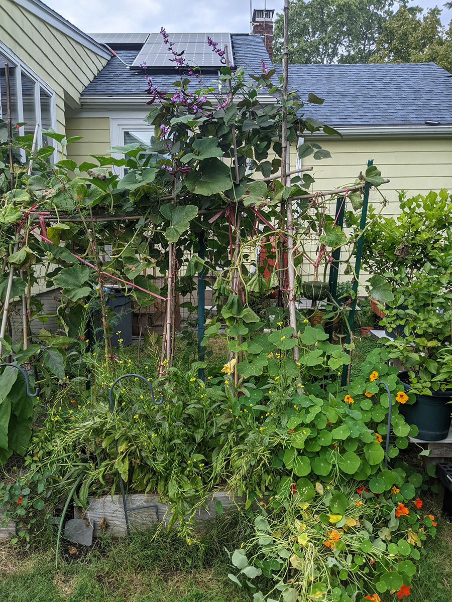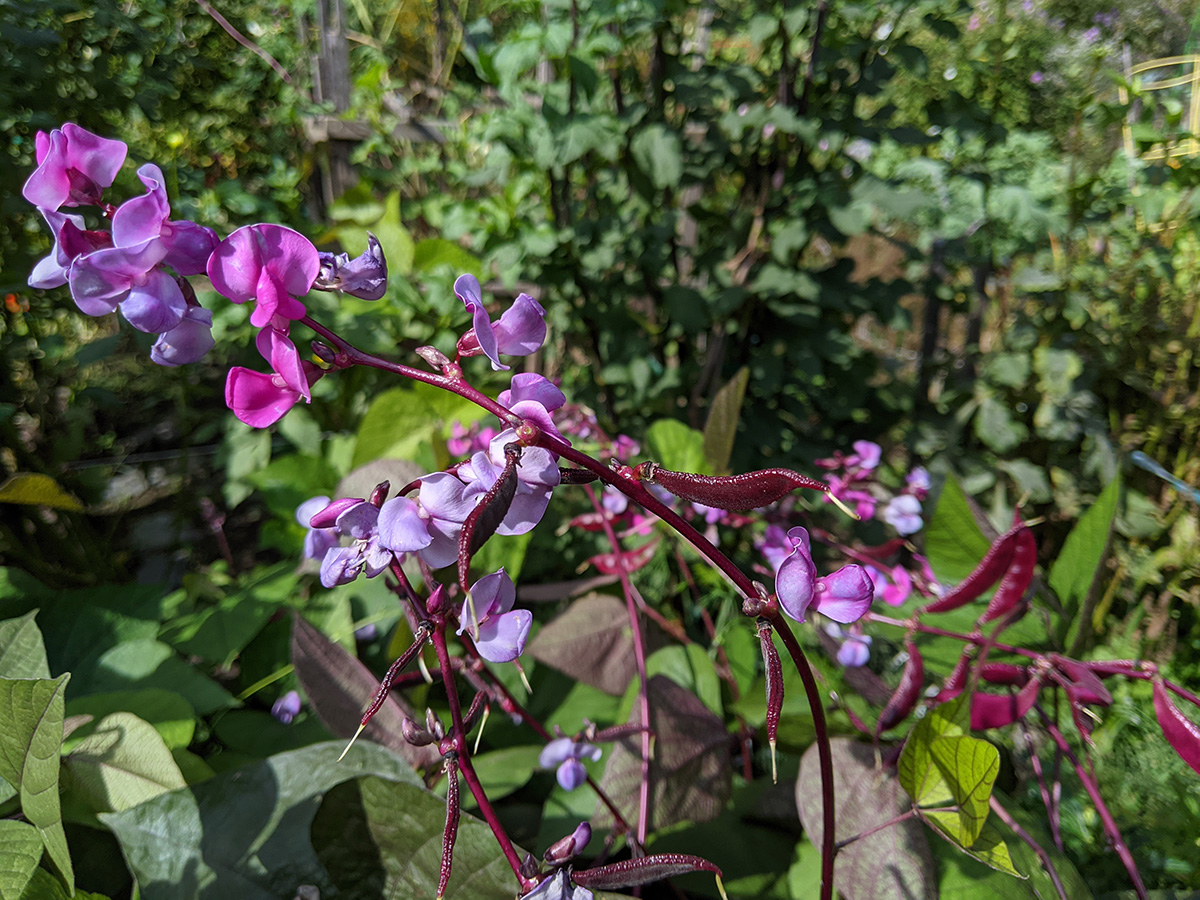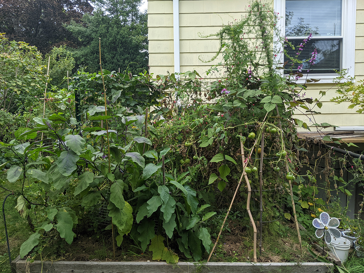 it's been 9 days since the last time i was in the community garden. once again, i was the only person there. i did some cleaning today, untangling some hyacinth bean vines and cutting back all the spent garlic chive flowers before they cast their seeds everywhere. i saw my monkshood plants have formed some immature flowers. i collected some small shriveled eggplants and a few red tomatoes before i left, as well as some nigella seed pods.