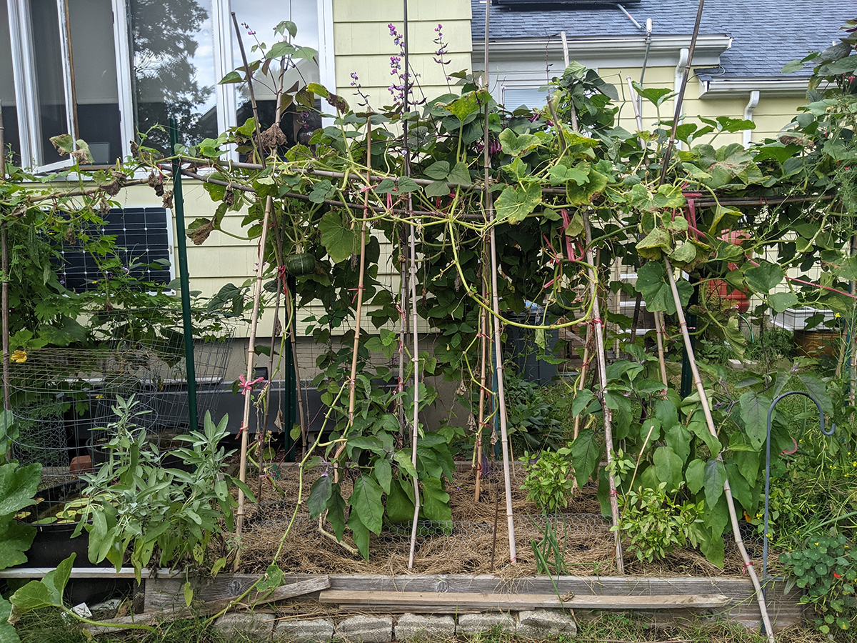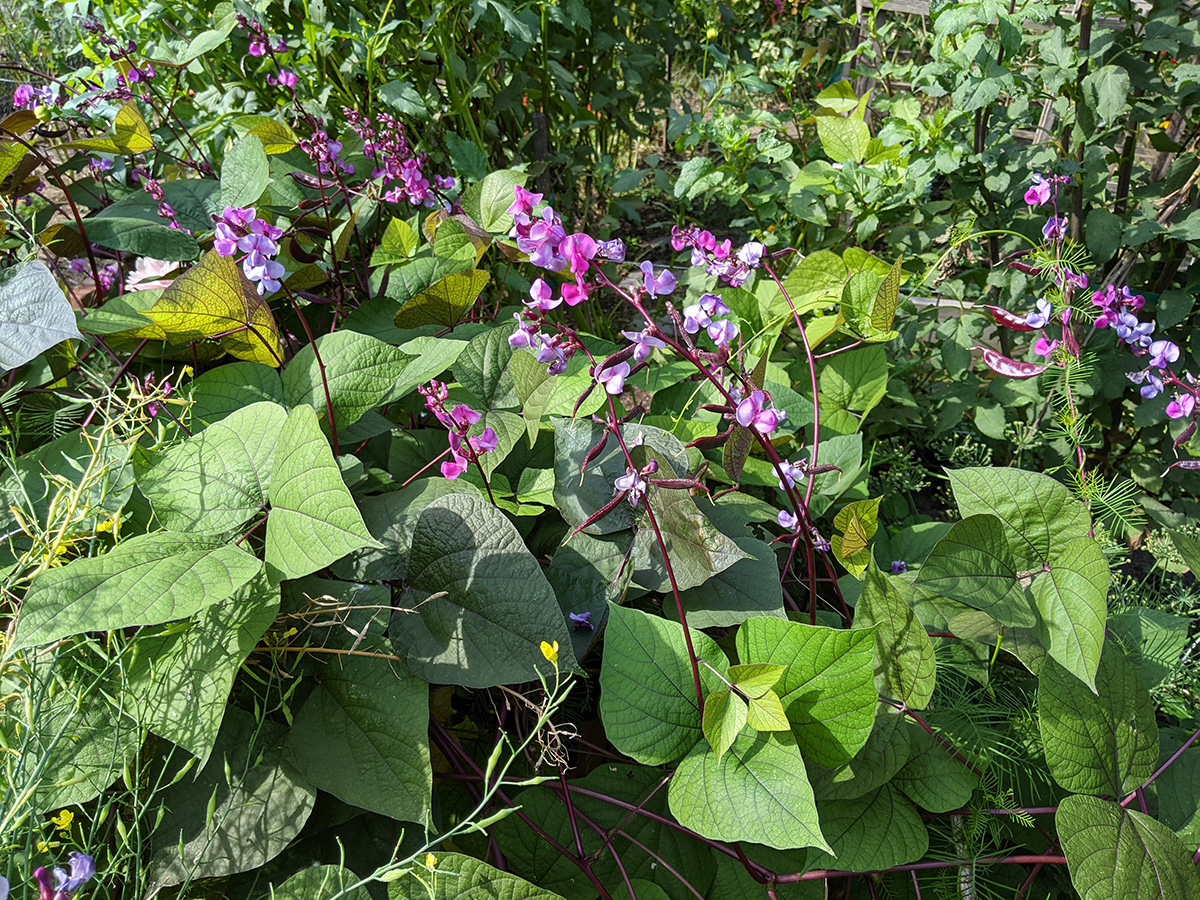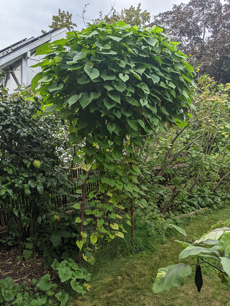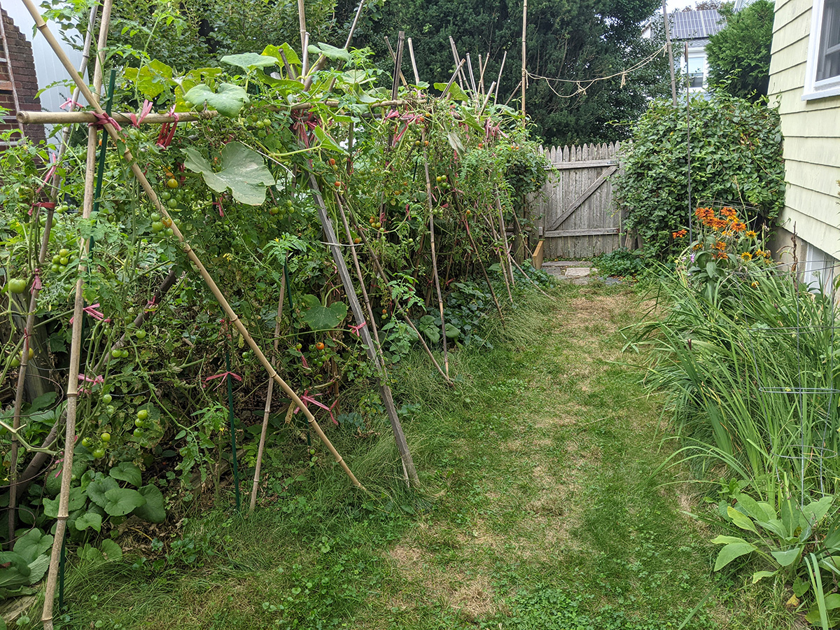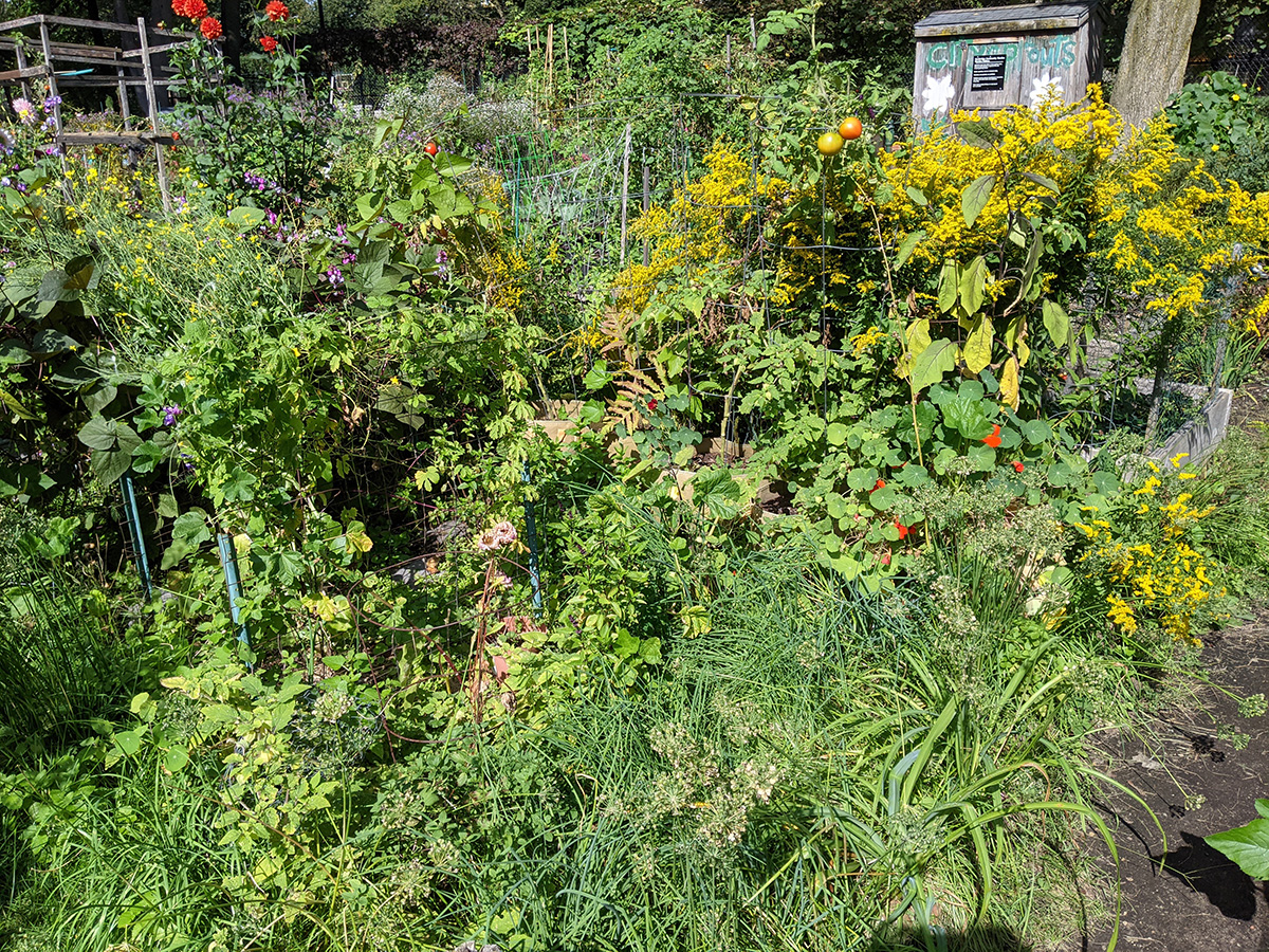 it's been 9 days since the last time i was in the community garden. once again, i was the only person there. i did some cleaning today, untangling some hyacinth bean vines and cutting back all the spent garlic chive flowers before they cast their seeds everywhere. i saw my monkshood plants have formed some immature flowers. i collected some small shriveled eggplants and a few red tomatoes before i left, as well as some nigella seed pods.