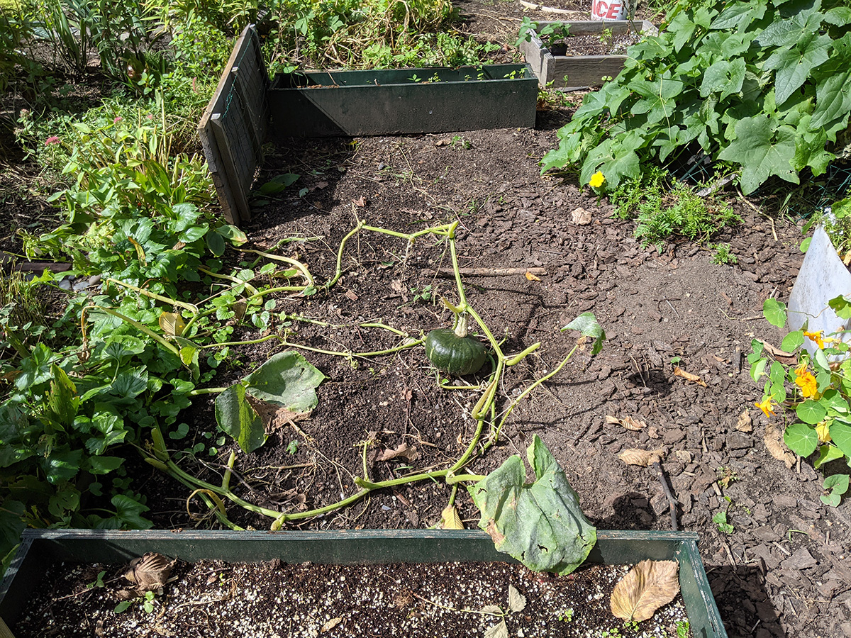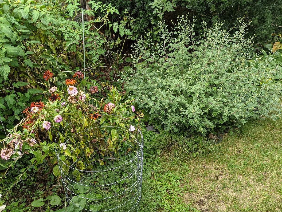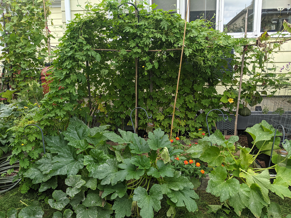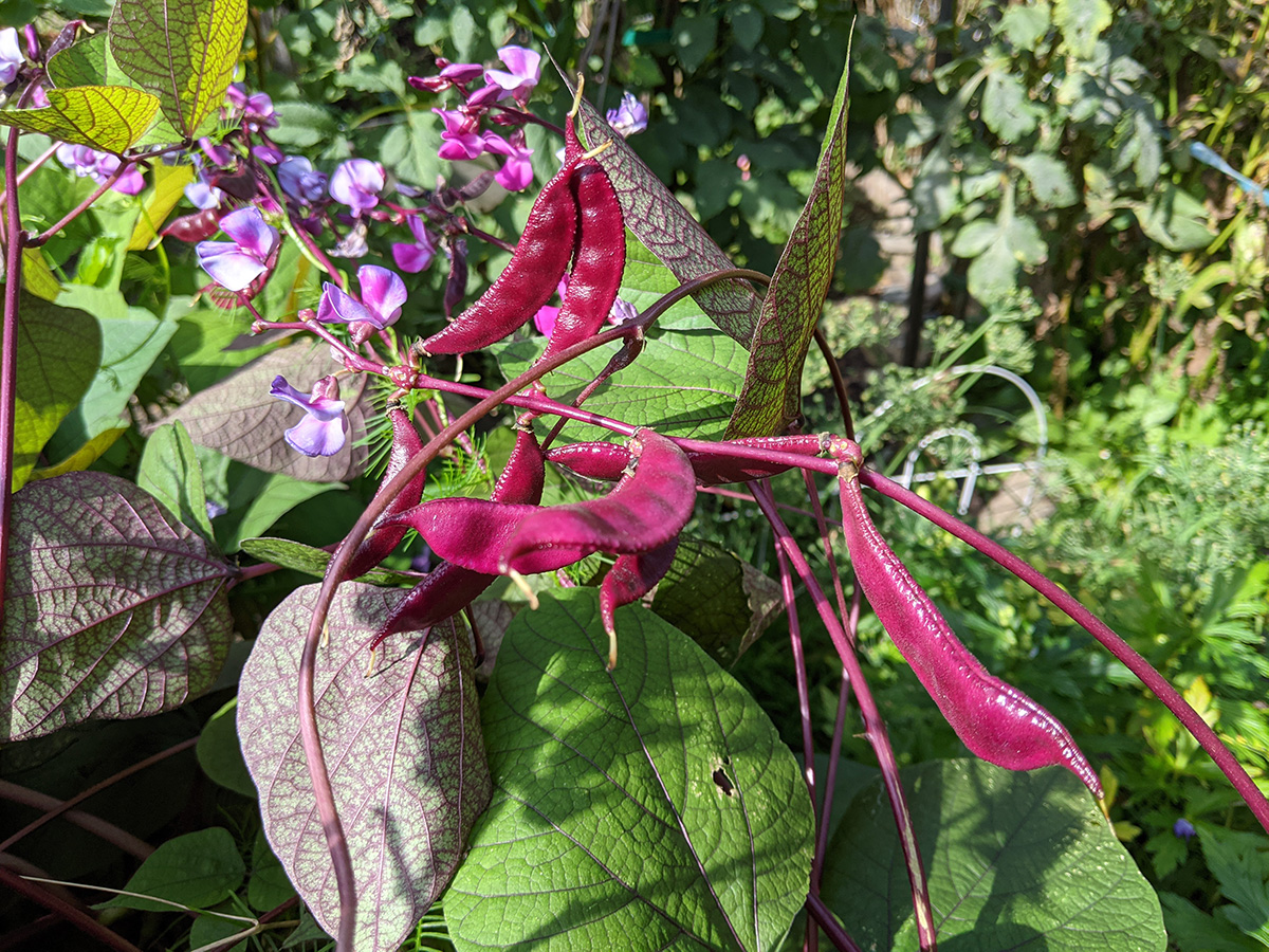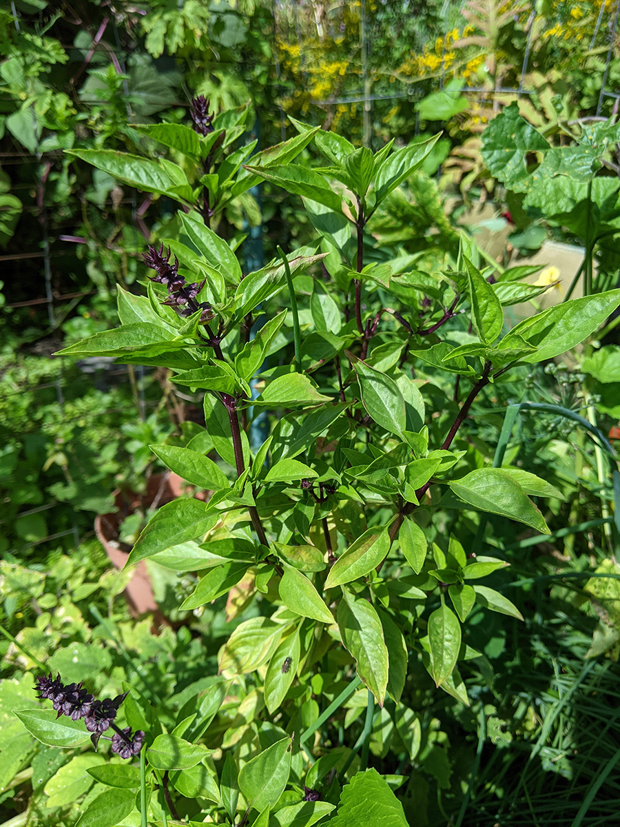 it's been 9 days since the last time i was in the community garden. once again, i was the only person there. i did some cleaning today, untangling some hyacinth bean vines and cutting back all the spent garlic chive flowers before they cast their seeds everywhere. i saw my monkshood plants have formed some immature flowers. i collected some small shriveled eggplants and a few red tomatoes before i left, as well as some nigella seed pods.