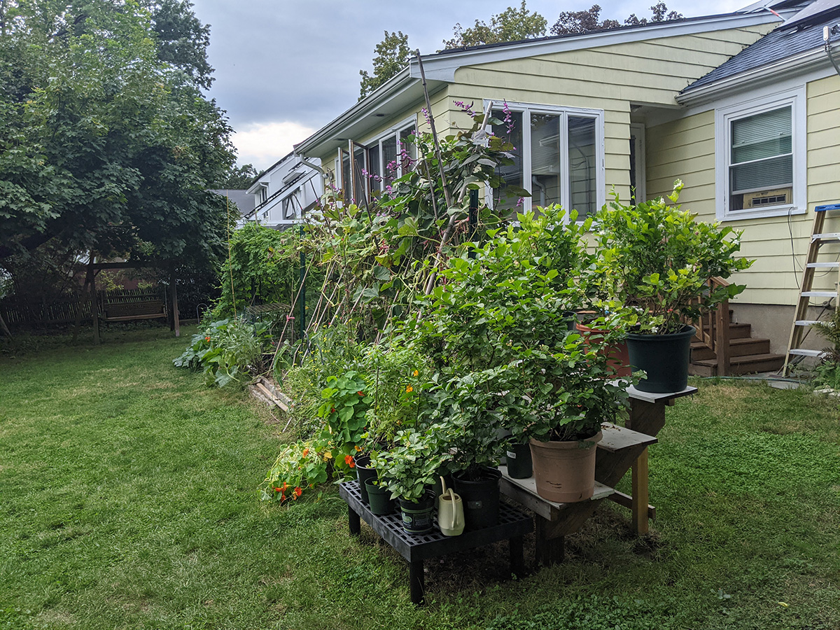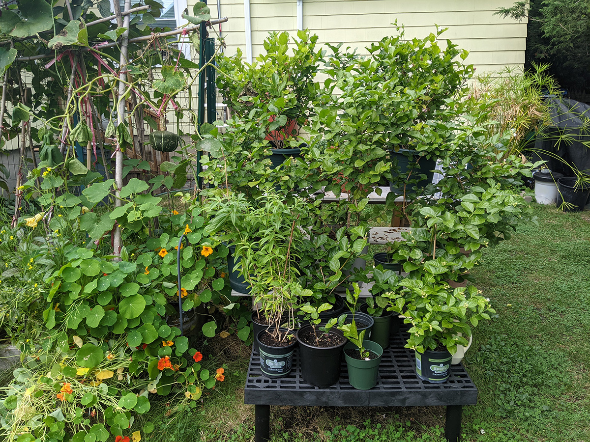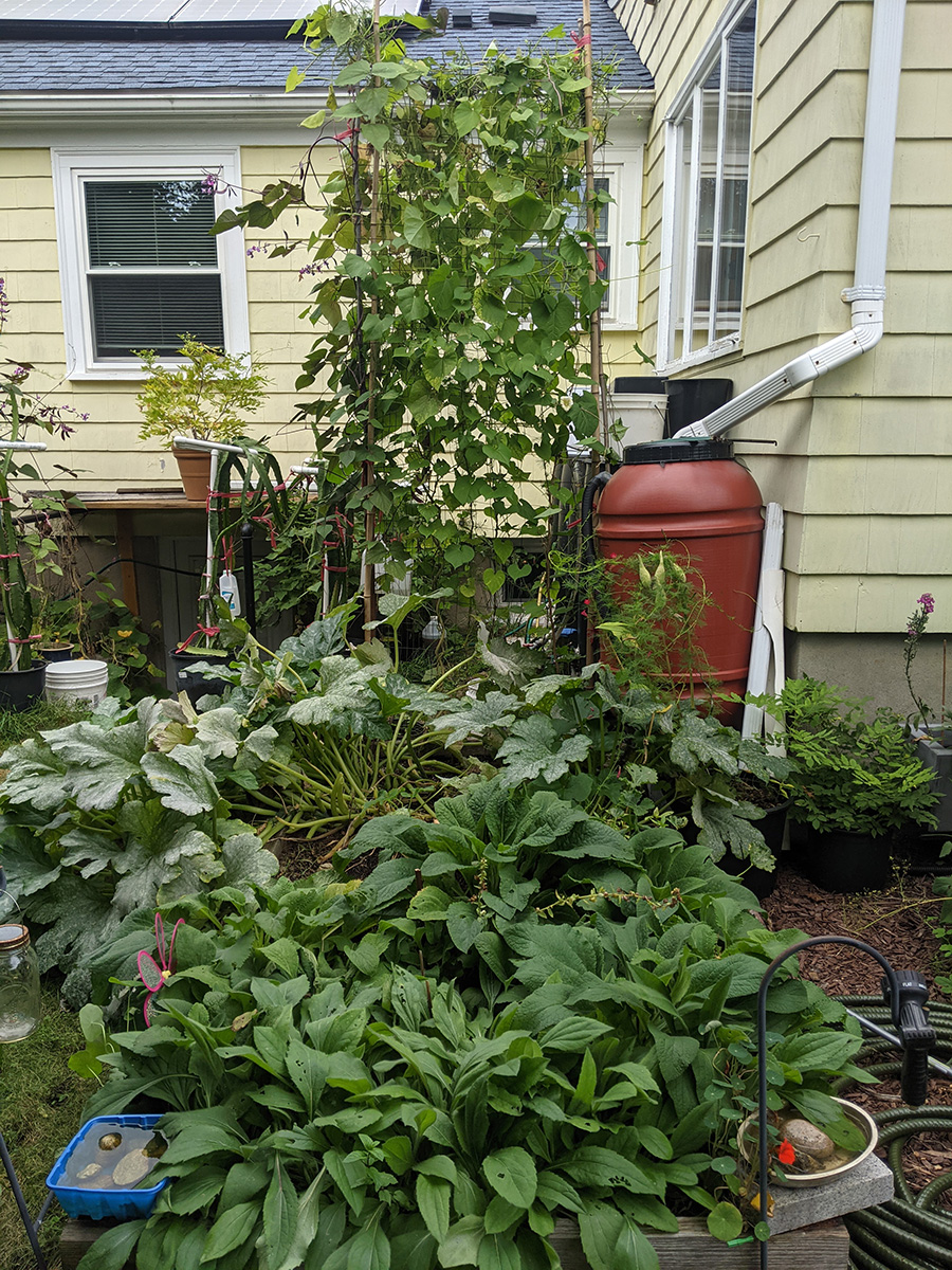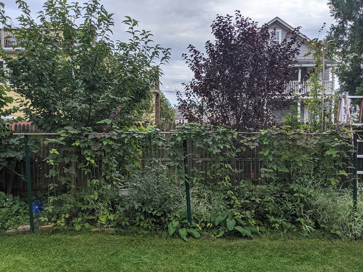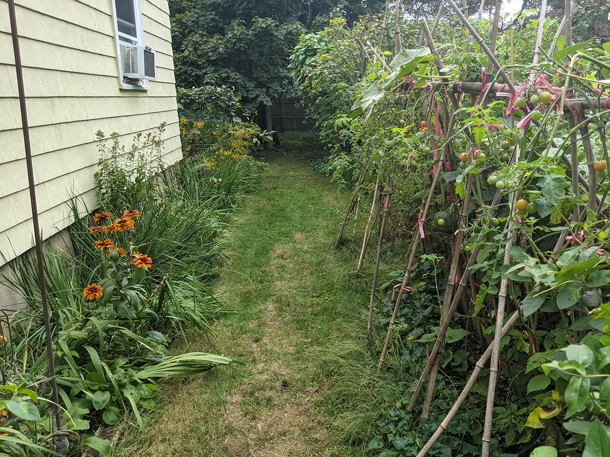 it's been 9 days since the last time i was in the community garden. once again, i was the only person there. i did some cleaning today, untangling some hyacinth bean vines and cutting back all the spent garlic chive flowers before they cast their seeds everywhere. i saw my monkshood plants have formed some immature flowers. i collected some small shriveled eggplants and a few red tomatoes before i left, as well as some nigella seed pods.