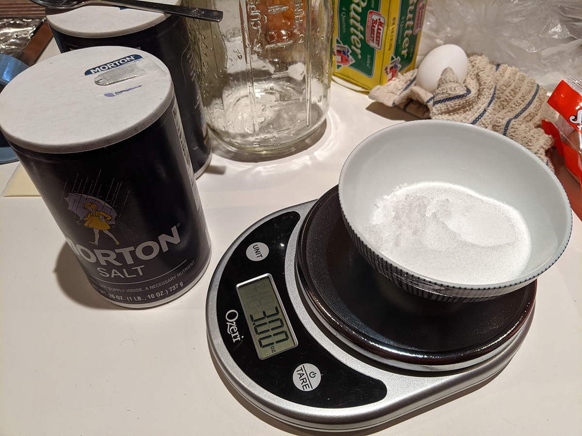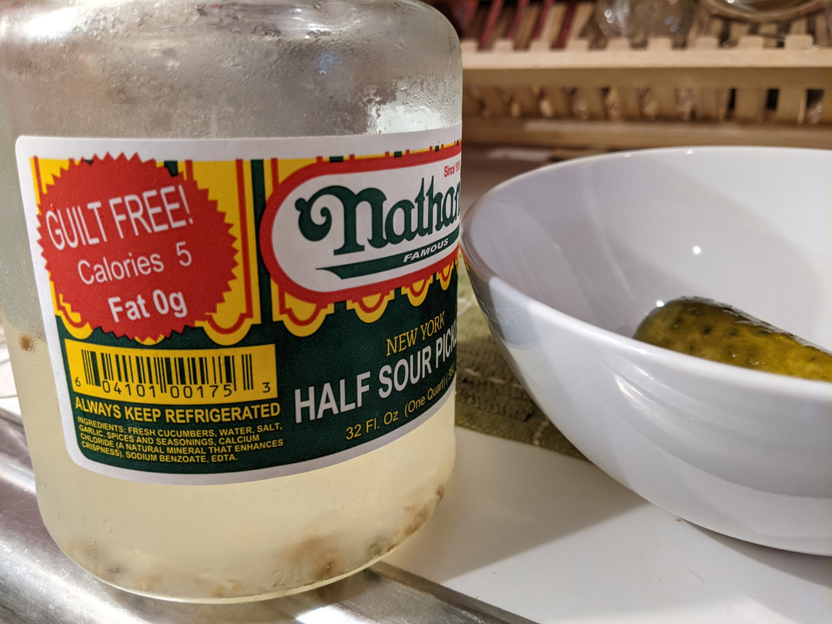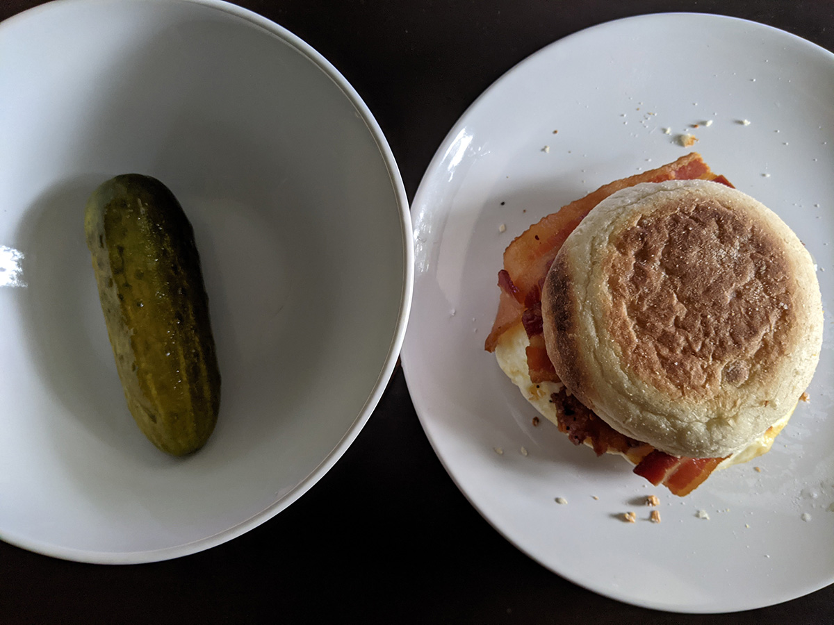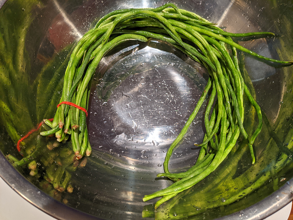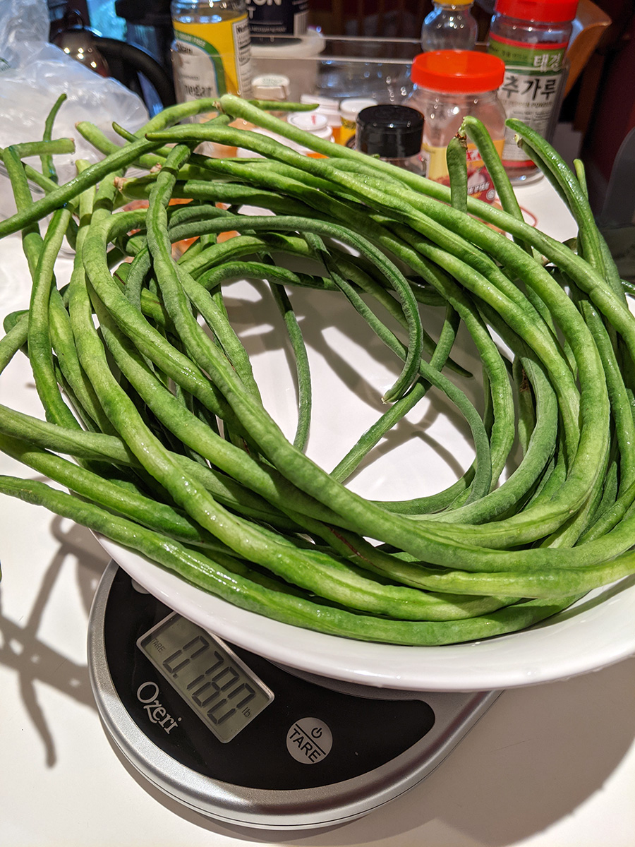 i made one last english muffin egg cheese bacon sandwich for lunch, and ate the last of the soft nathan's half sour pickle. i heated up 9 cups of water with 3 oz. of salt to make brine for fermenting the long beans. i had 20 beans but they were of inferior late season stock, weighing altogether just 0.78 lbs. i washed them and left them out to dry.