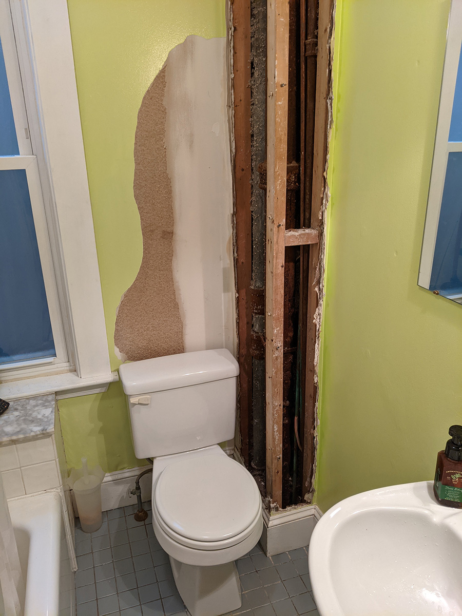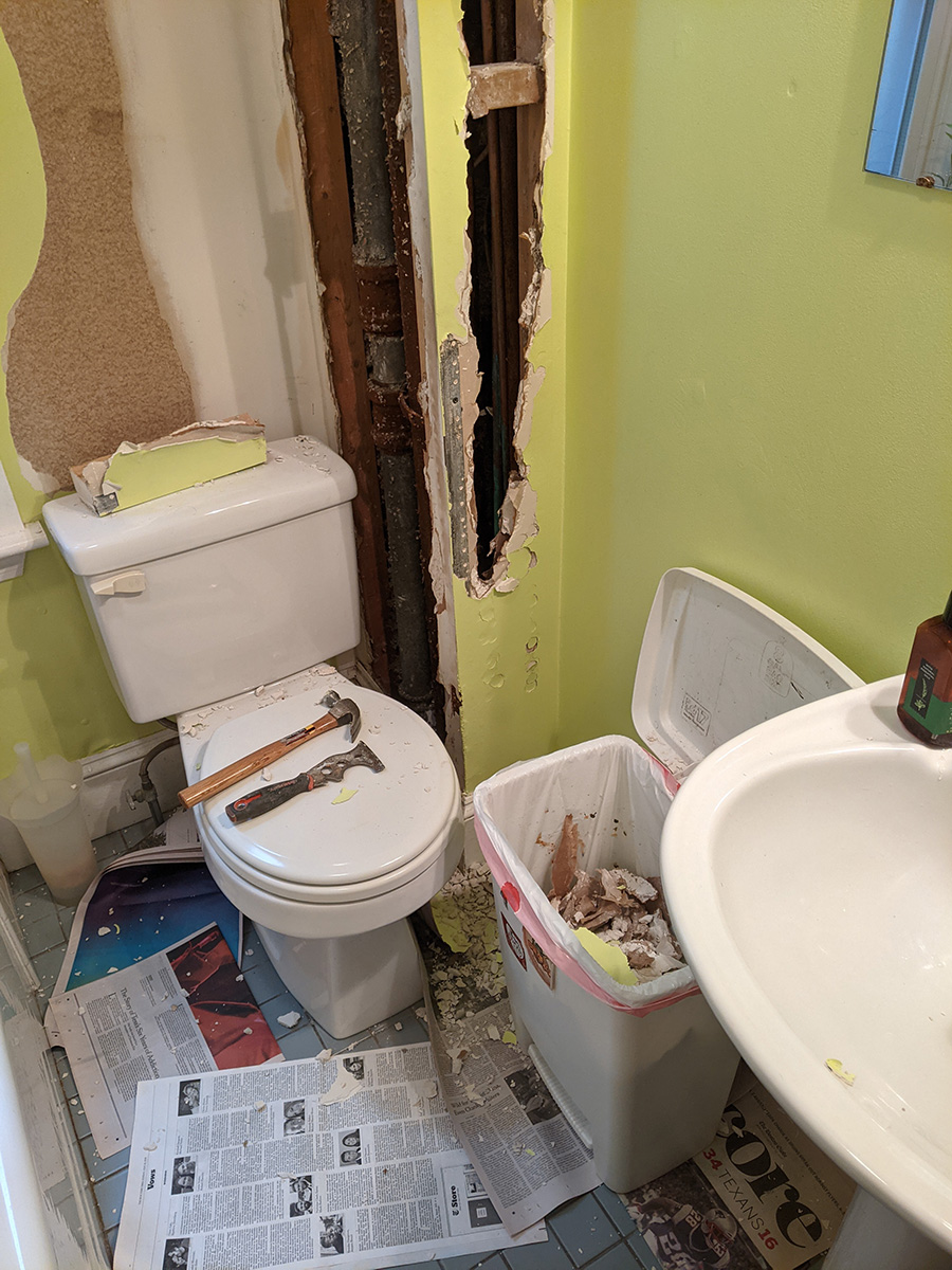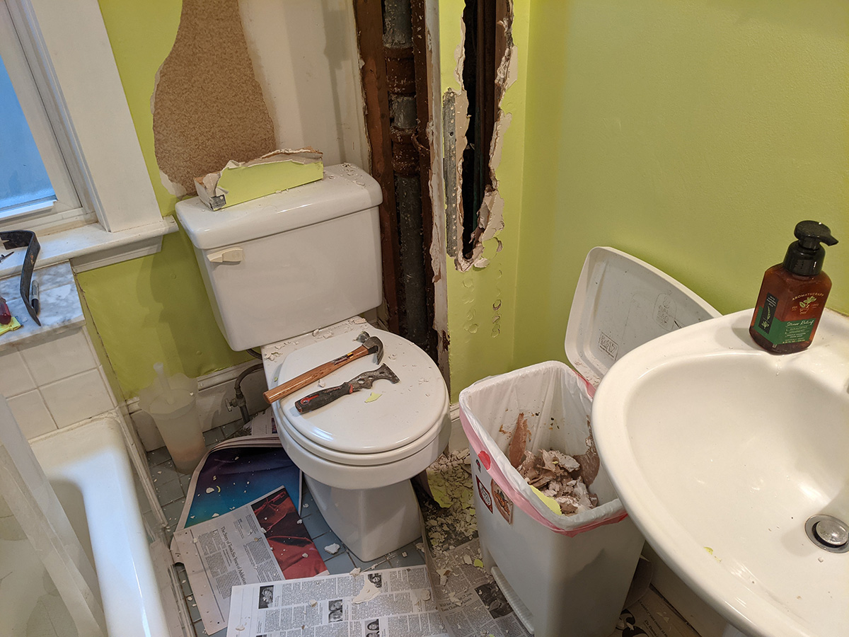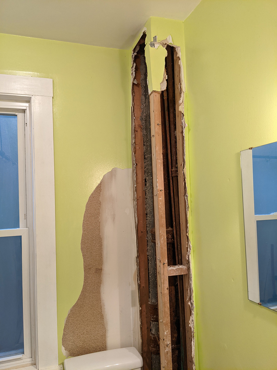after a day of procrastinating, it was finally time for bathroom demolition work. the hole in my bathroom is the "box" in the corner that encapsulates all the plumbing that goes upstairs. one face is open (the side facing the toilet), but i needed to tear down the other face in order to rebuild the box. i was also hoping that by tearing down that side, i'd make cleaning up and restuffing the walls with insulation a bit easier.