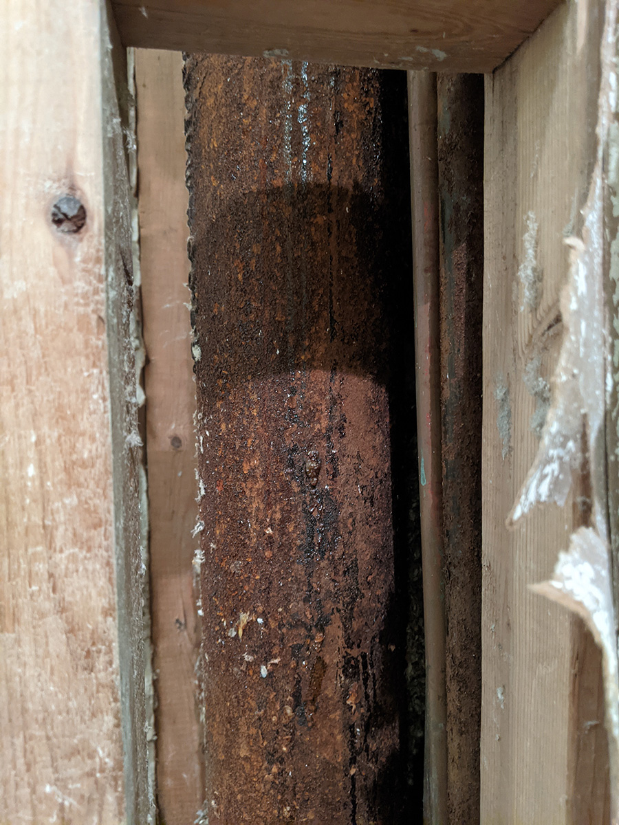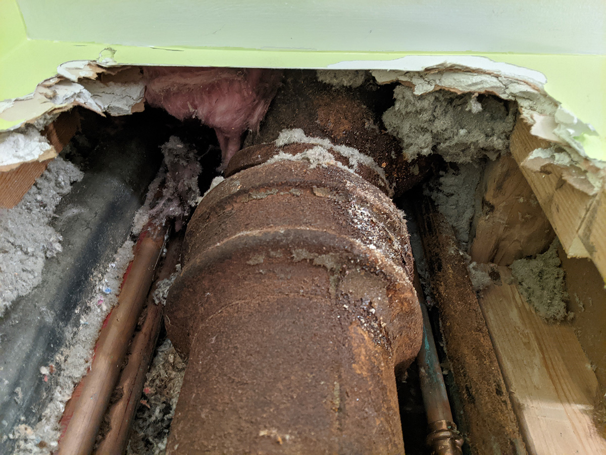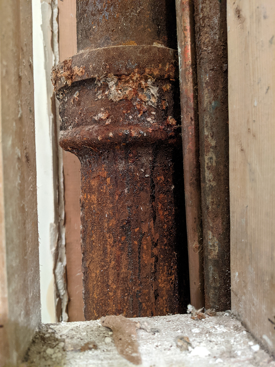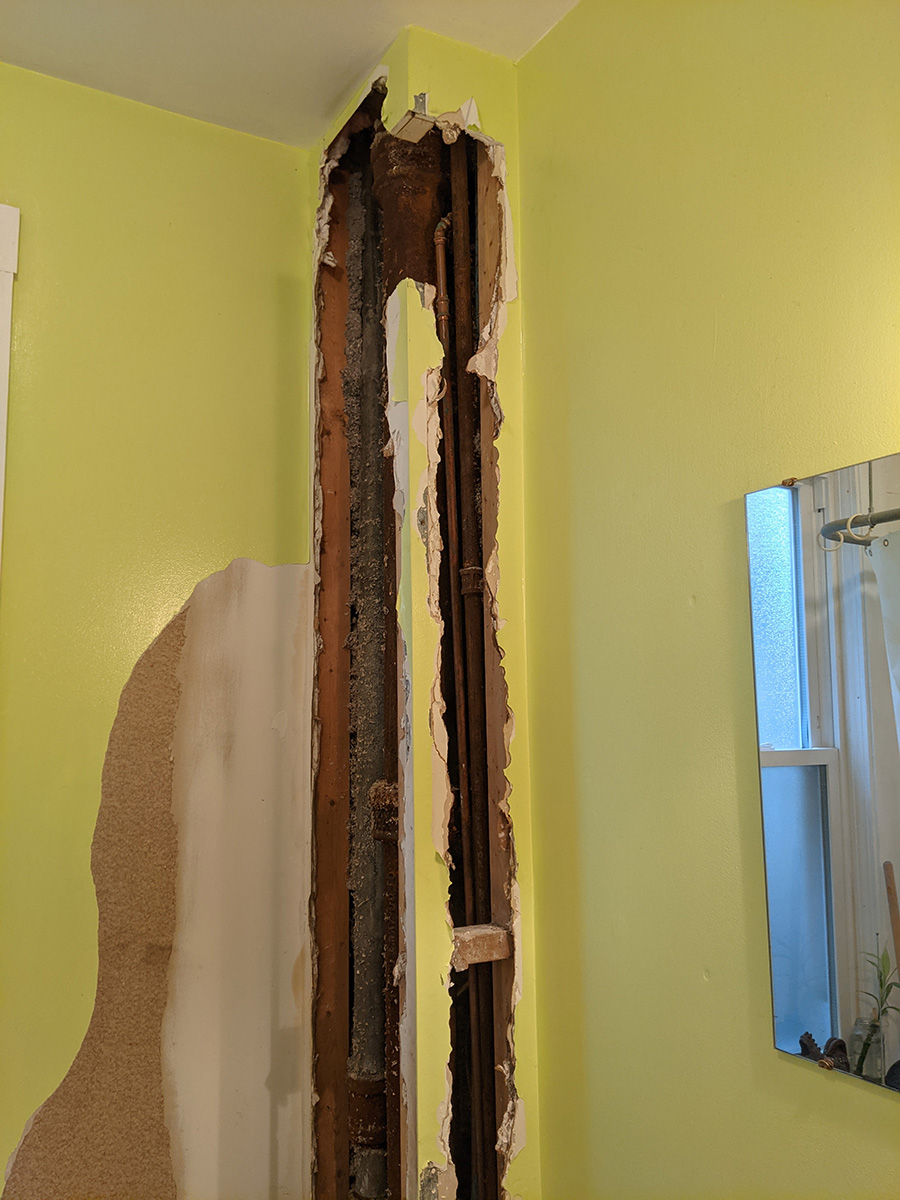 after a day of procrastinating, it was finally time for bathroom demolition work. the hole in my bathroom is the "box" in the corner that encapsulates all the plumbing that goes upstairs. one face is open (the side facing the toilet), but i needed to tear down the other face in order to rebuild the box. i was also hoping that by tearing down that side, i'd make cleaning up and restuffing the walls with insulation a bit easier.