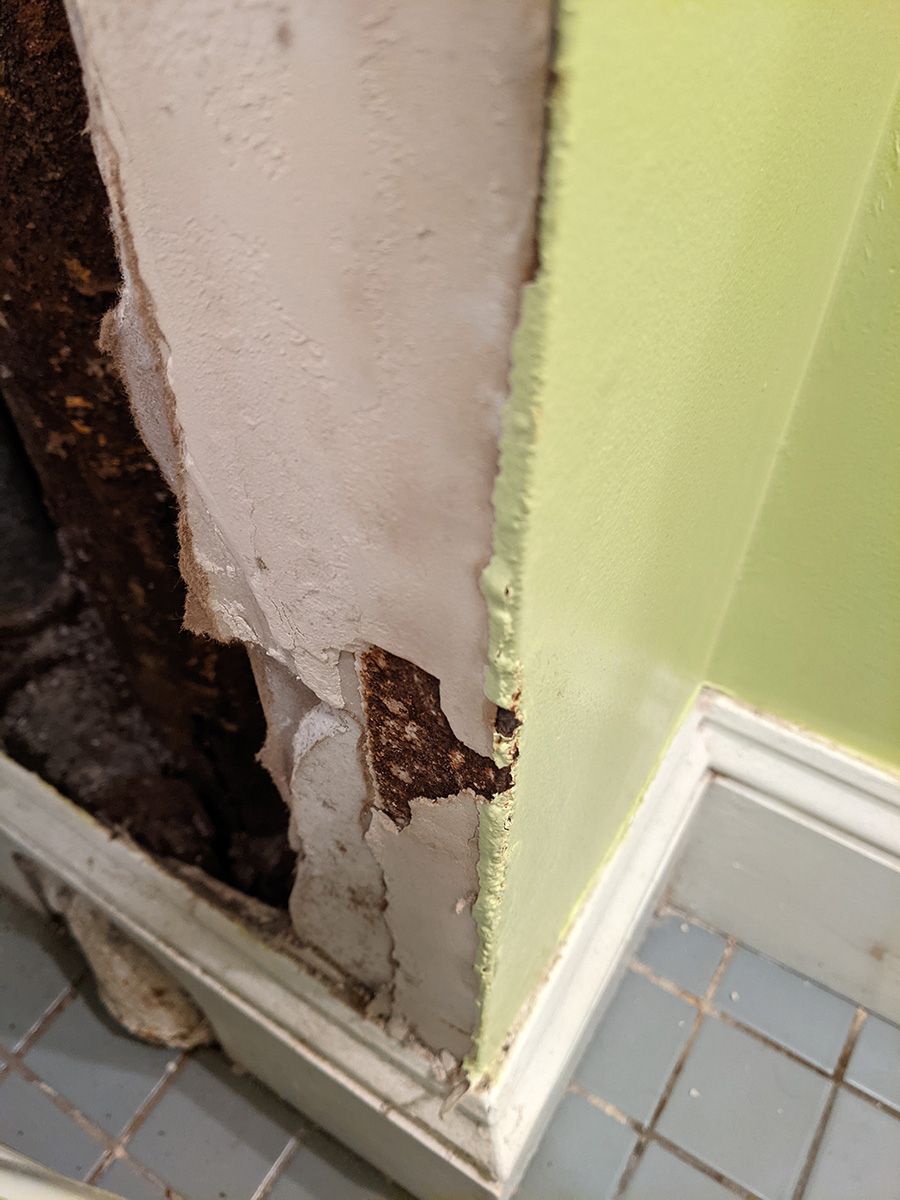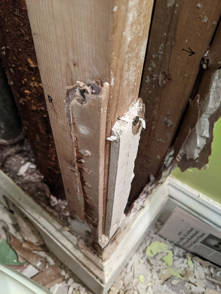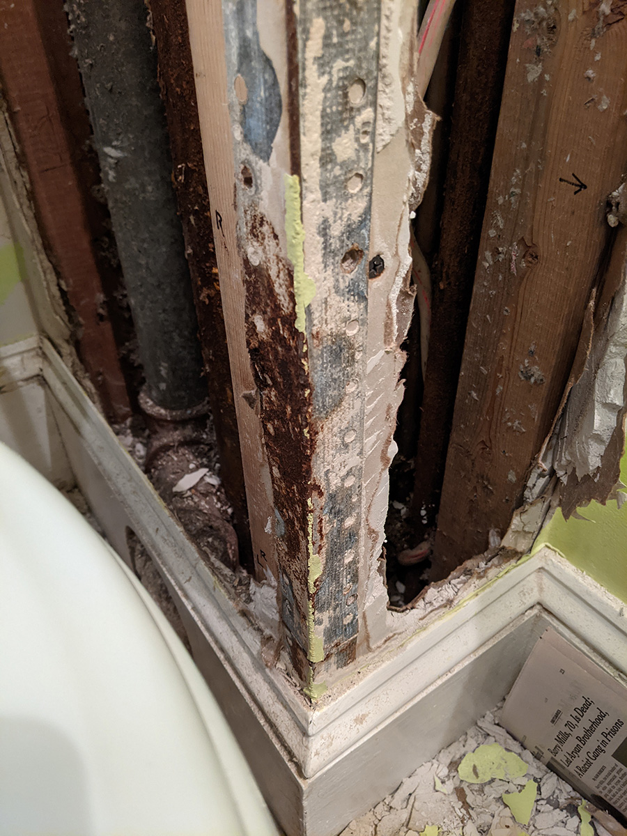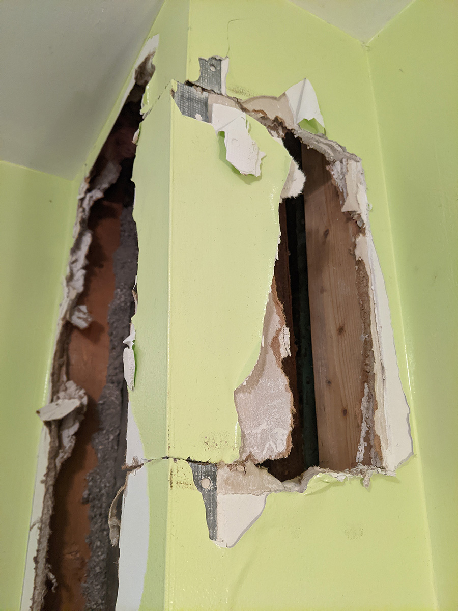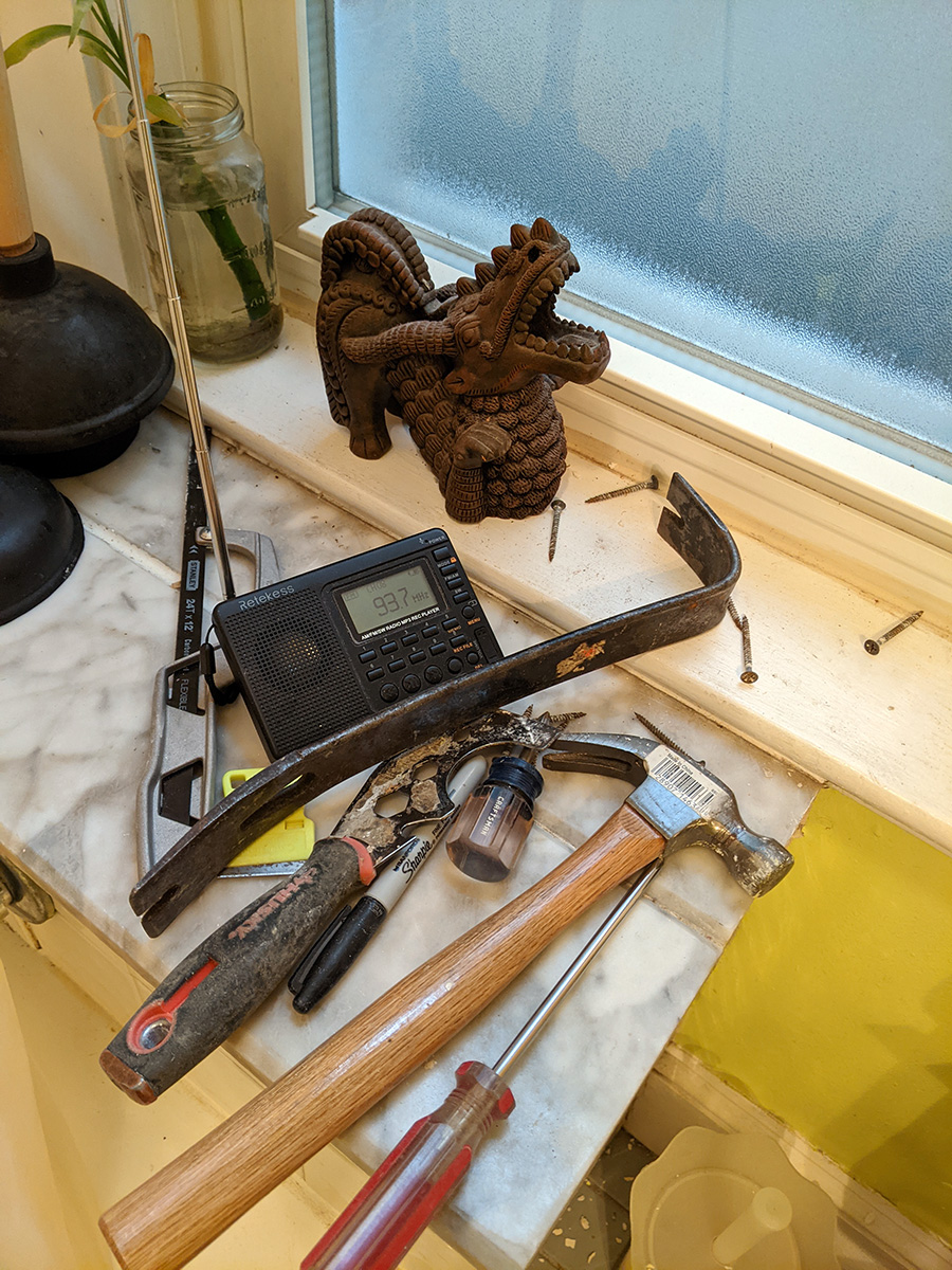 i worked barefoot in my underwear while listening to the sports radio. all the callers sounded awful: uneducated, loud-mouth, opinionated. i sprayed newspaper on the floor to catch the fall debris, but it still sprayed everywhere. earlier, before i started, i watched some youtube videos on how to repair drywalls, which psyched me up. i scored the paint before the good side of the wall so i wouldn't accidentally tear off the paint like i did on the wall behind the toilet. i took me a little bit over an hour to finally tear down the remaining box wall, along with the galvanized corner bead. i marked the location of the various drywall nails along the wooden 2x4.