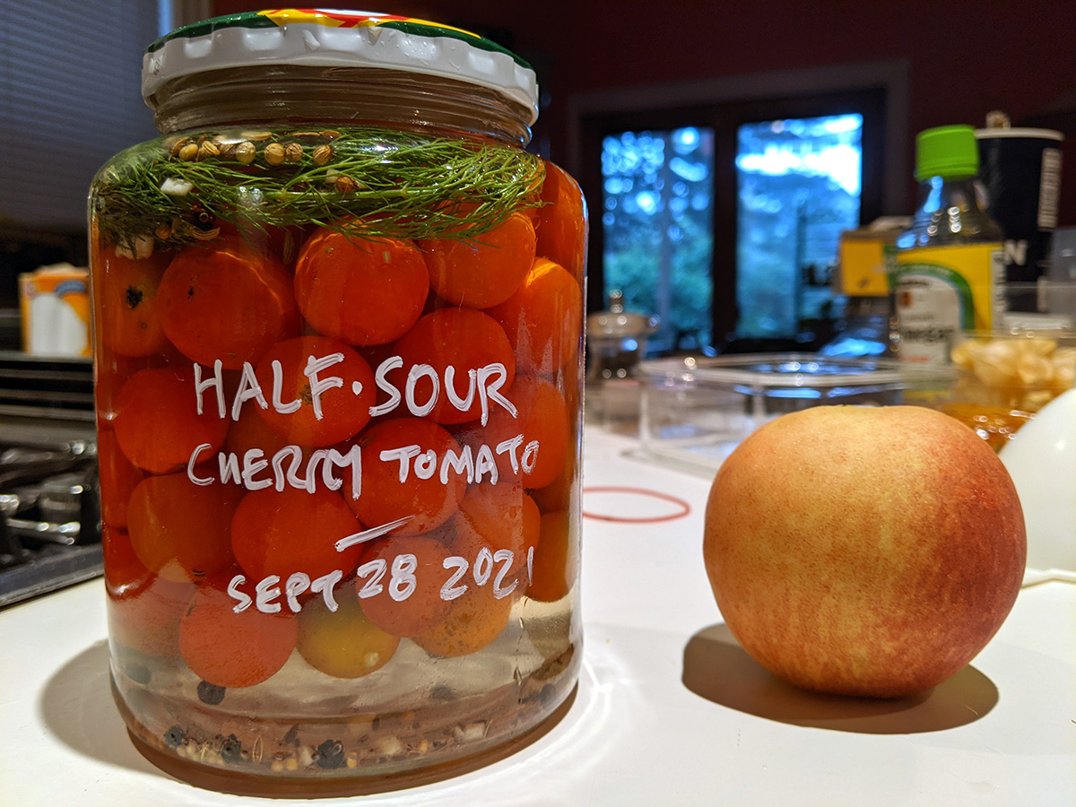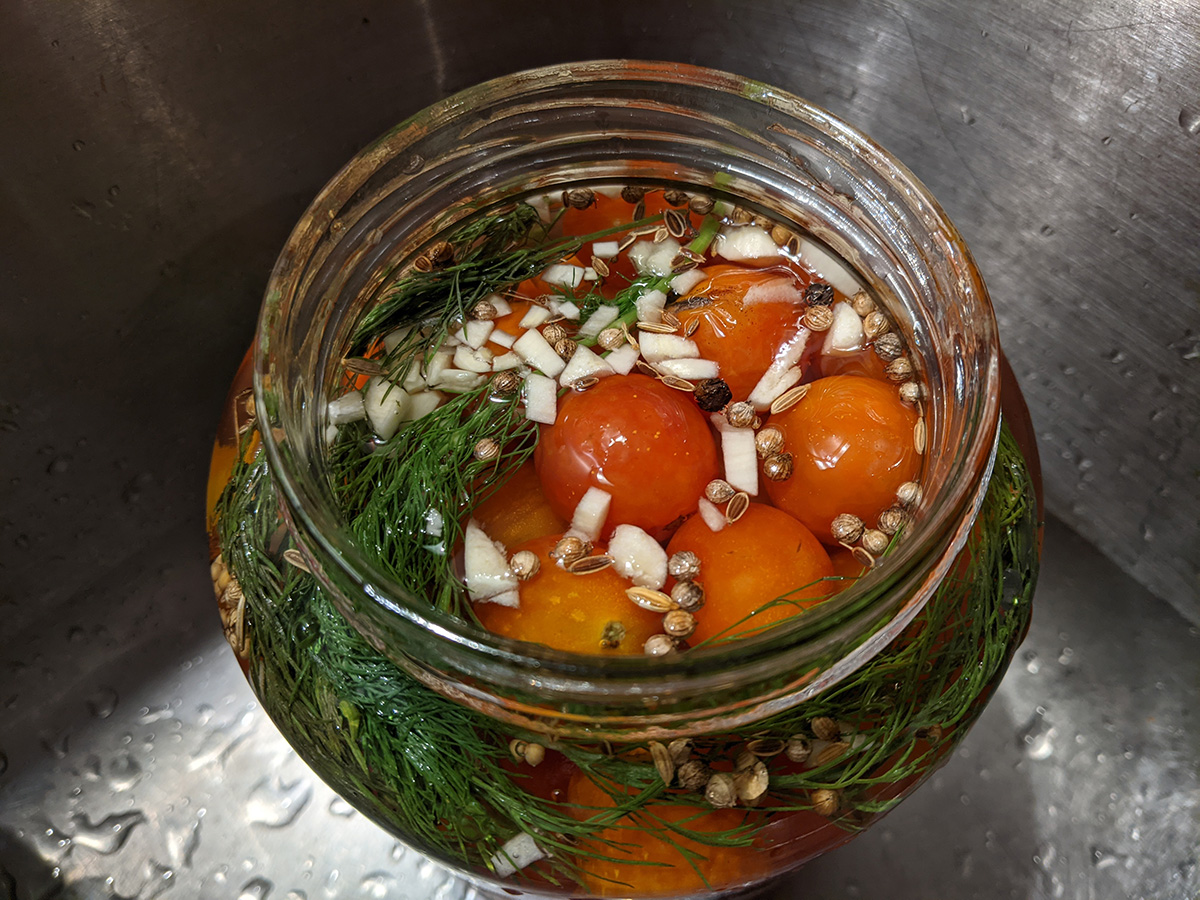i thought i was all done but i still had about 3 cups of brine left. i was about to pour it out when i had a bright idea: i have a bunch of cherry tomatoes in my fridge, maybe i can fermented those? i never heard of fermented tomatoes before, but went online to check and was surprised to find several recipes. the ingredients were the same as for half-sour pickles. so i got all my cherry tomatoes and managed to fill a pickle jar with them. 3 cups of brine was more than enough to fill the jar. i also added 1/4 tsp of mustard seeds, peppercorns, dill seeds, fennel seeds, coriander seeds, and a few sprigs of fresh dill along with some chopped garlic. it looked really pretty but i'm not sure how they'll taste. also i saw a recipe that said to use fresh cherry tomatoes, but some of mine were a bit old and soft. it's just an experiment, but sure how well it's going to work. if it turns out to be delicious, there's buckets of cherry tomatoes yet to be harvest from my parents' backyard.