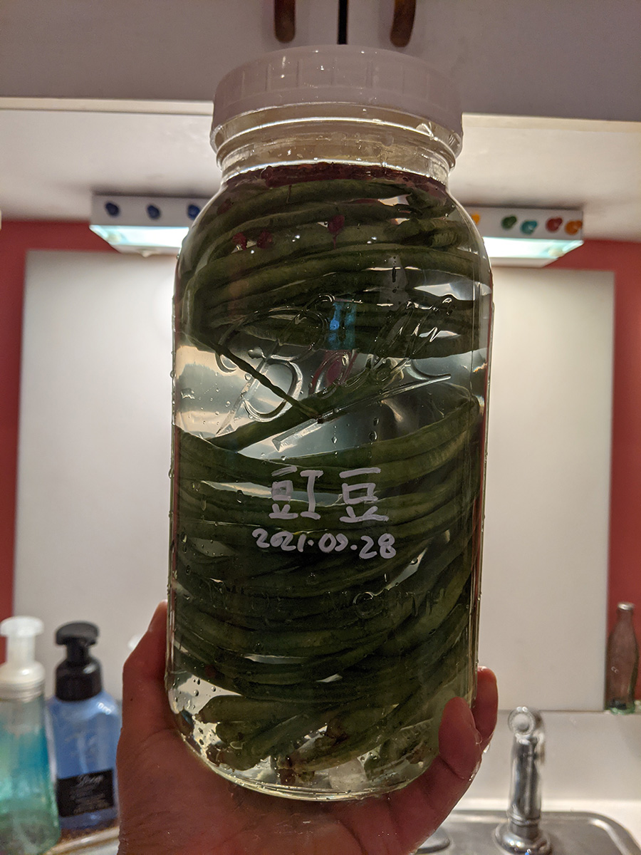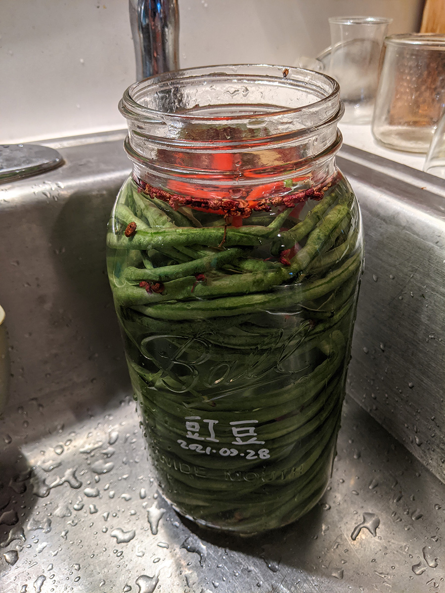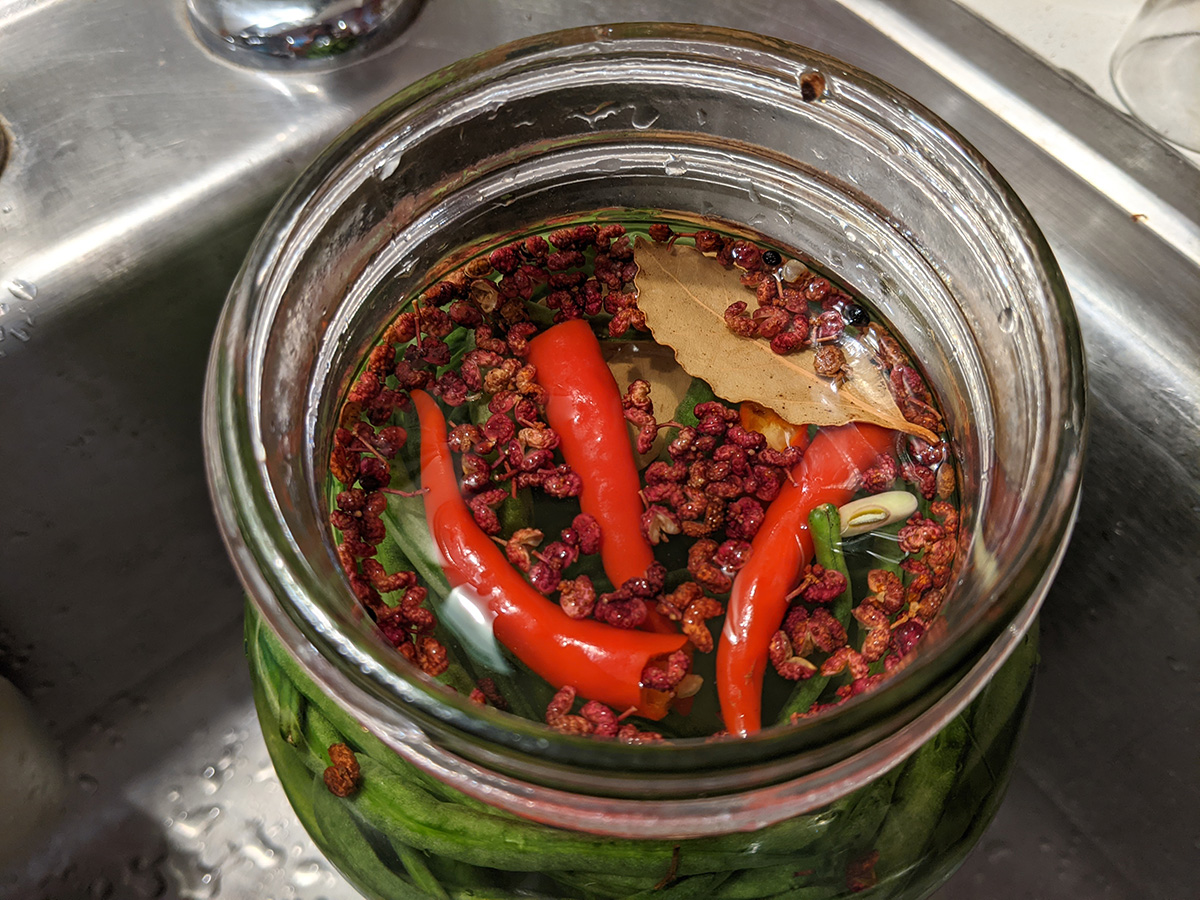the brine had cooled to room temperature, so i started making another batch of fermented long beans. learning from my mistake last time, i poured 6 cups of brine into the 1/2 gallon mason jar to make it easier for me to stuff the long beans. 6 cups was enough, i added about another 1/2 cup to fill the jar. i also added sichuan peppercorns, a few bay leaves, a few pieces of rock sugar, some hot chili peppers, and a dash of chinese baijiu. i thought the jar was stuffed to capacity but when i looked at it afterwards, there was probably still enough room for 20 more long beans, had i stuffed them in the jar better initially.