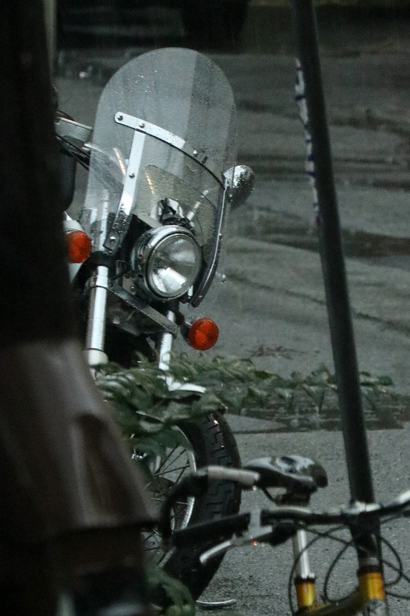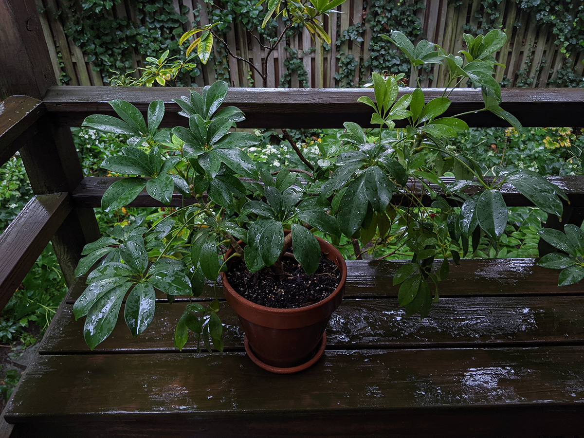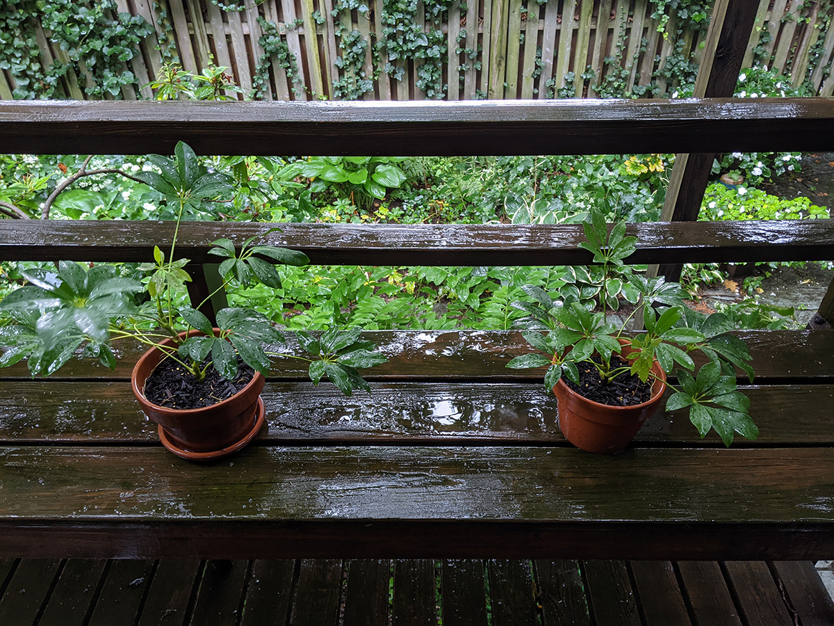 armed with an umbrella, i went outside to scrub the oxidized algae from the deck and siding. honestly, if the oxiclean worked its magic, there should be no scrubbing, and the rain would rinse off any residue, but i wanted to help it along. i came back inside, my t-shirt and pants completely soaked.