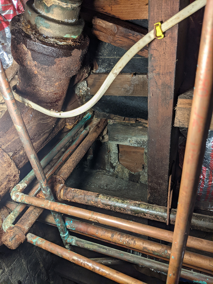 on a whim, i decided to pull out more leftover insulation from the bottom of my bathroom plumbing "box." that's when i noticed the fiberglass insulation was still wet, while everywhere else inside the box was dry. the most likely culprit is the corroded copper pipe has a very small leak. i took some photos and wrote my upstairs neighbors a carefully crafted e-mail letting them know the pipes were still leaking and needed to be replaced. most importantly, they'd pay to fix it, because it's their pipes. when the plumber comes though, i may have him do some other work, like fix the blockage in my bathroom sink hot water valve.