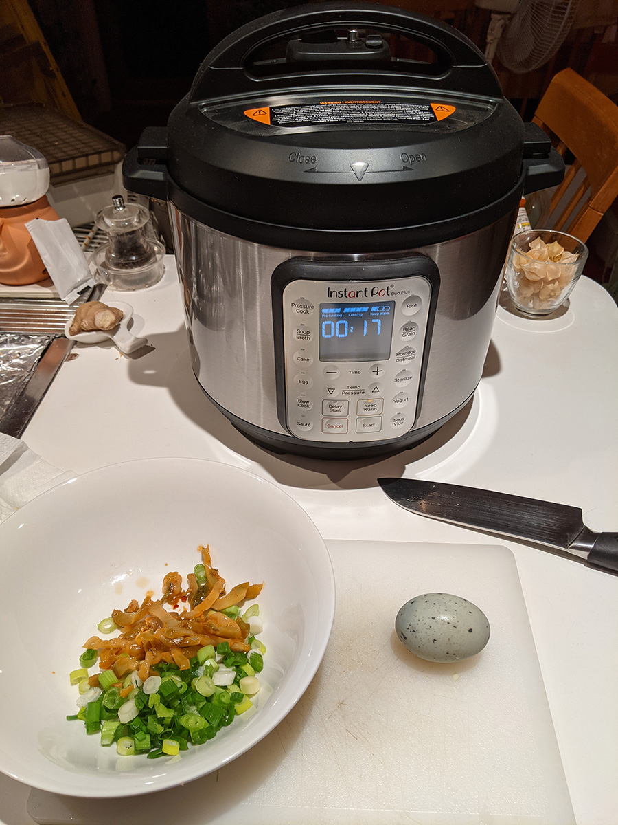 | blanch pork in boiling pot of water for 3 minutes. add rice, water, ginger, salt, sesame oil, ground white pepper, and pork to instant pot and cook on high pressure for 35 minutes. let cool (natural release) for 20 minutes before venting remaining pressure. remove pork, discard bone, shred meat, return to instant pot. add chopped century egg, medium sauté to thicken congee. once desired consistency reached, serve with pickled radish and scallions. | |