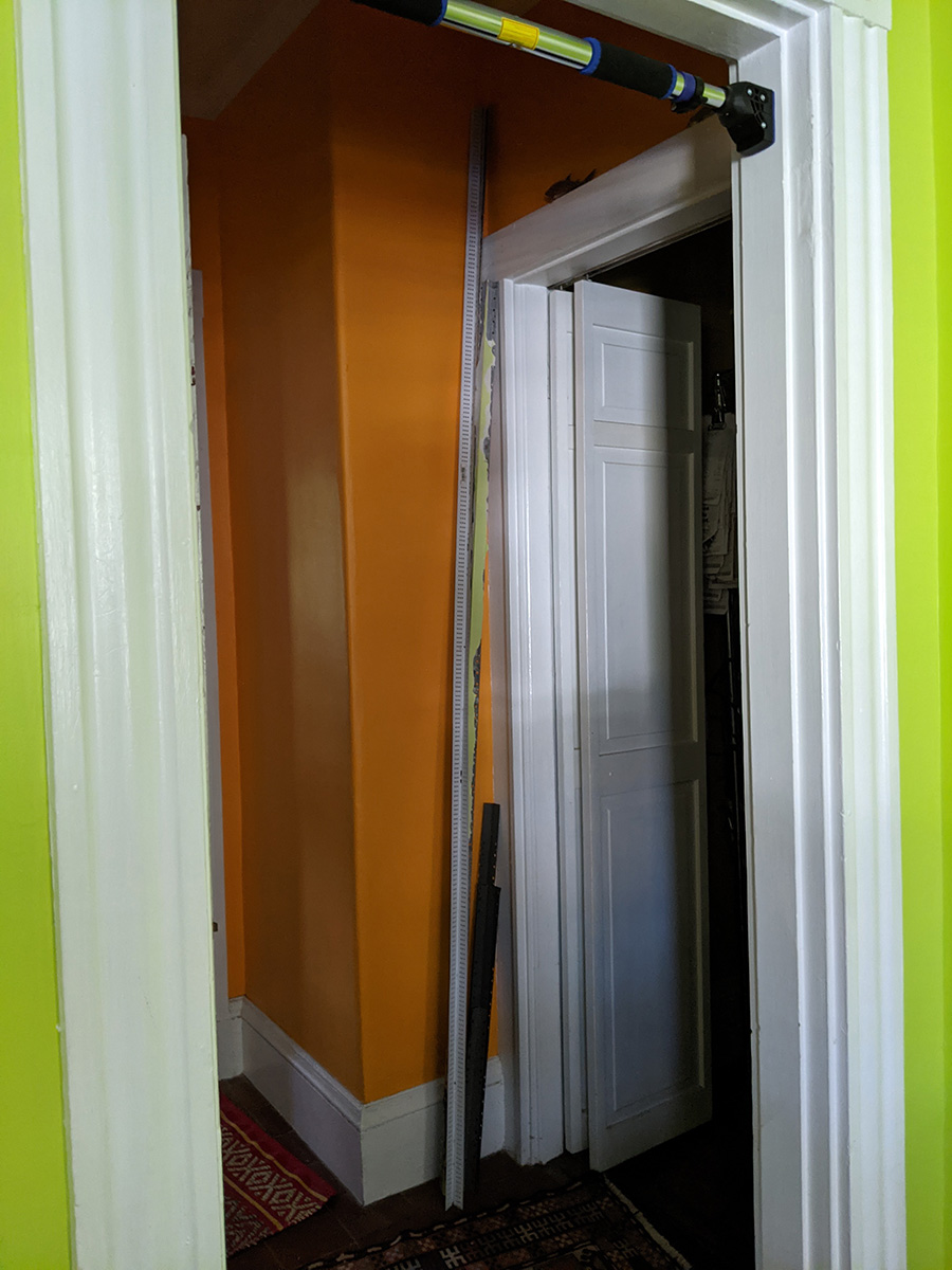 back at the house, i rummaged in the basement to find some bathroom wall fixing equipment and materials. i grabbed my folding ladder to access the upper portion of the wall. i also remembered there was some galvanized corner beads, but they were all short, 1-2ft at the most, nothing long enough to span the entire height of the wall. i could probably piece together enough to bridge the whole wall, but might just be easier to buy a new single piece, they don't cost very much. i did find some plastic corner beads that were 8ft tall, but they look more like they'd be for inner corners. i also checked the space underneath the plumbing, to make sure there were no more leaks, and to see how much insulation i needed to fill the gaps. i noticed some mold which i wiped clean with a bit of bleach spray and paper towels.