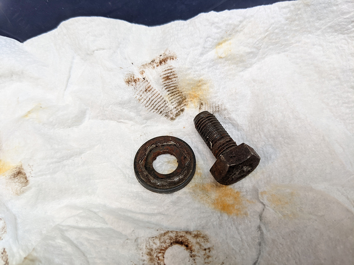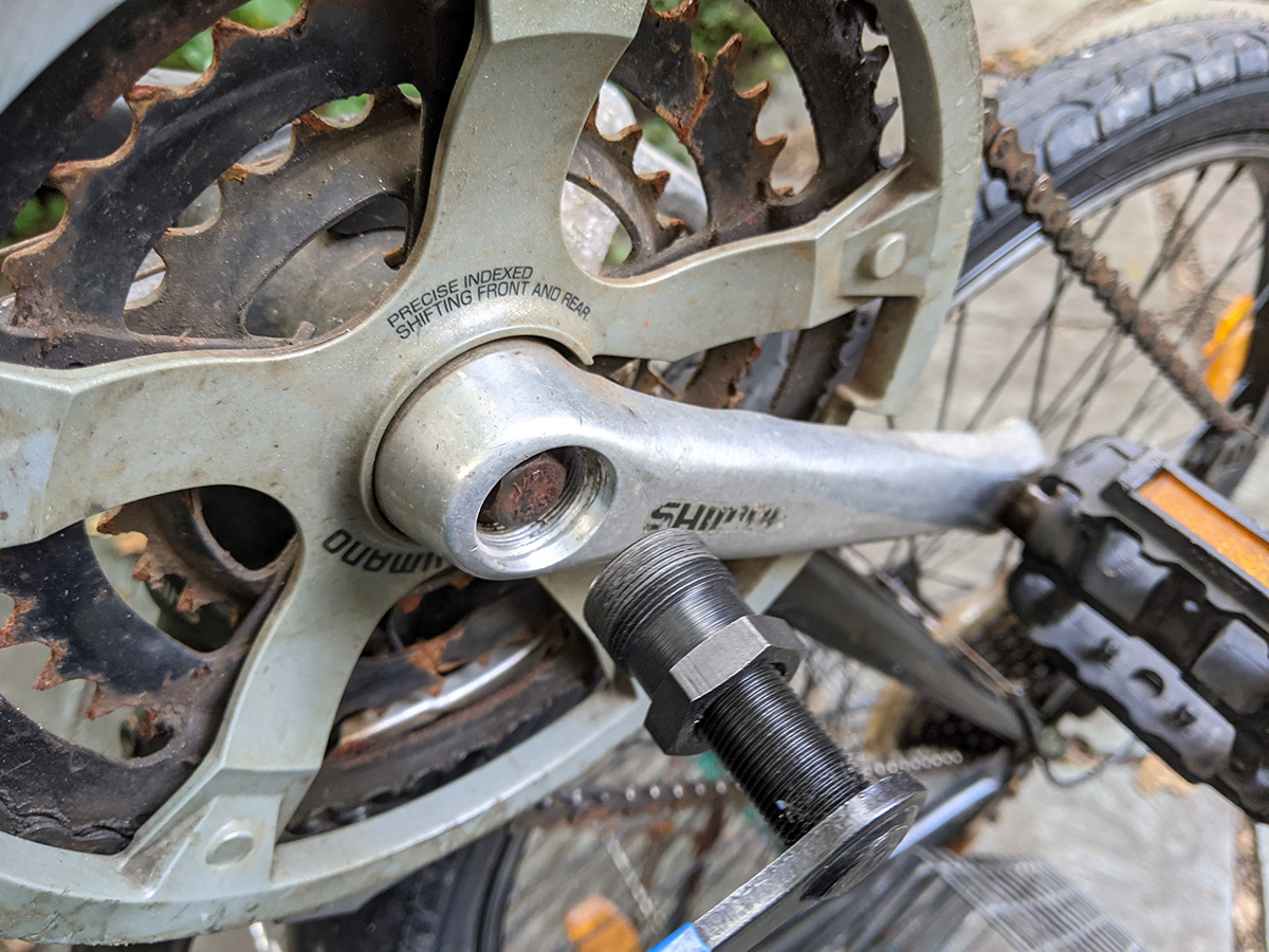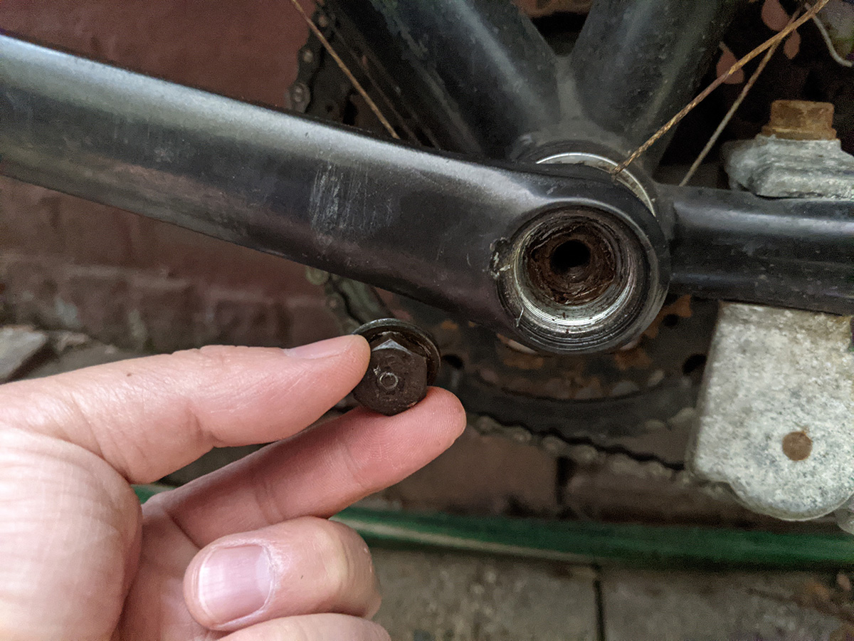 i went online and ordered a new CCP-22 crank puller ($16) and some new pedals ($10) in case the old ones simply won't come up. only later did i realize there were actually locknuts in the crankset and crank arm; to removed the crankset, i first had to unscrew the locknut. using a socket wrench, i went out and removed one of the locknuts. the screw seemed fine, but i applied so much force that it mashed the washer,