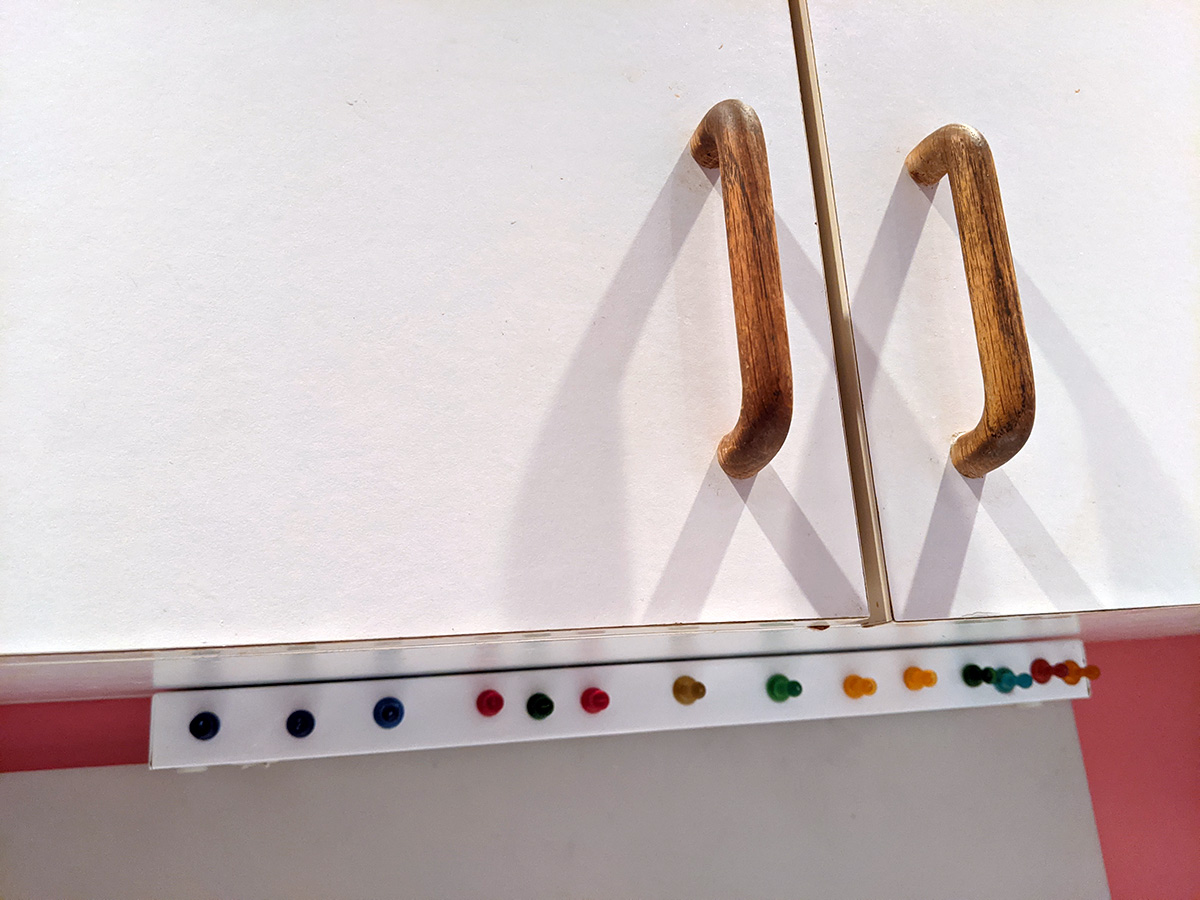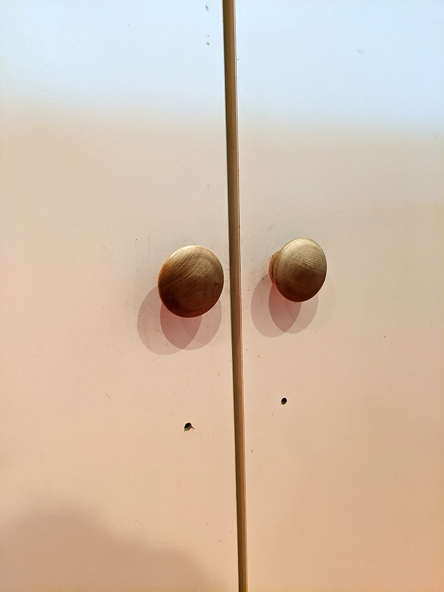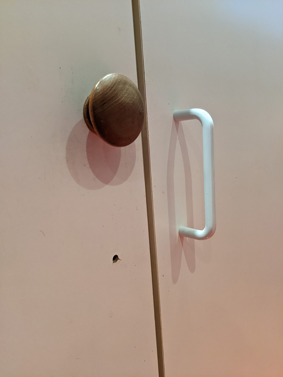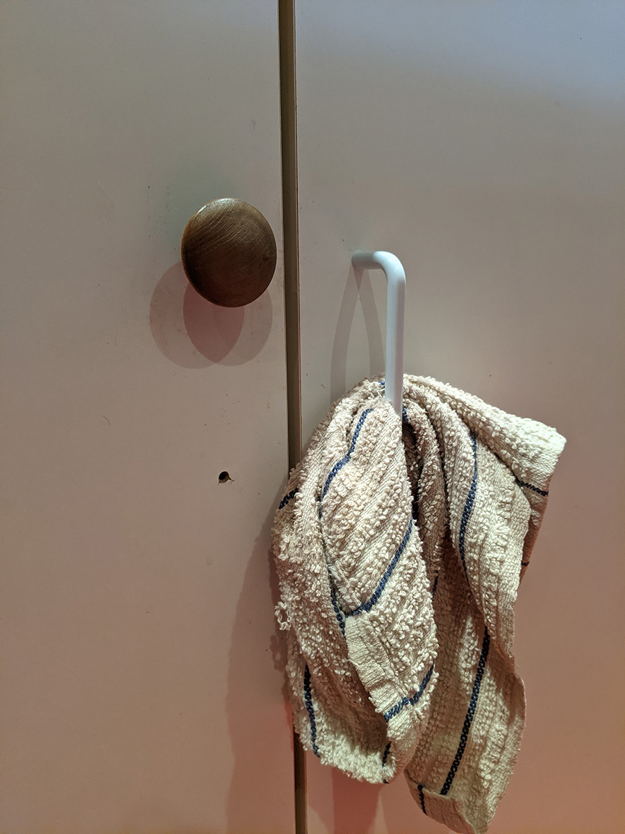 a package greeted me when i got back home. it was new cabinet handles. for some reason the cabinet doors below the kitchen sink are knobs instead of handles. it's the only one that them, while all the other cabinet doors are handles. i looked online for wooden 3-1/2 inches handles but couldn't find any that matched what i already have, so i got white plastic ones instead. turns out they're made from zinc. the whole reason why i wanted handles is so i can hang my dishrags through the back.