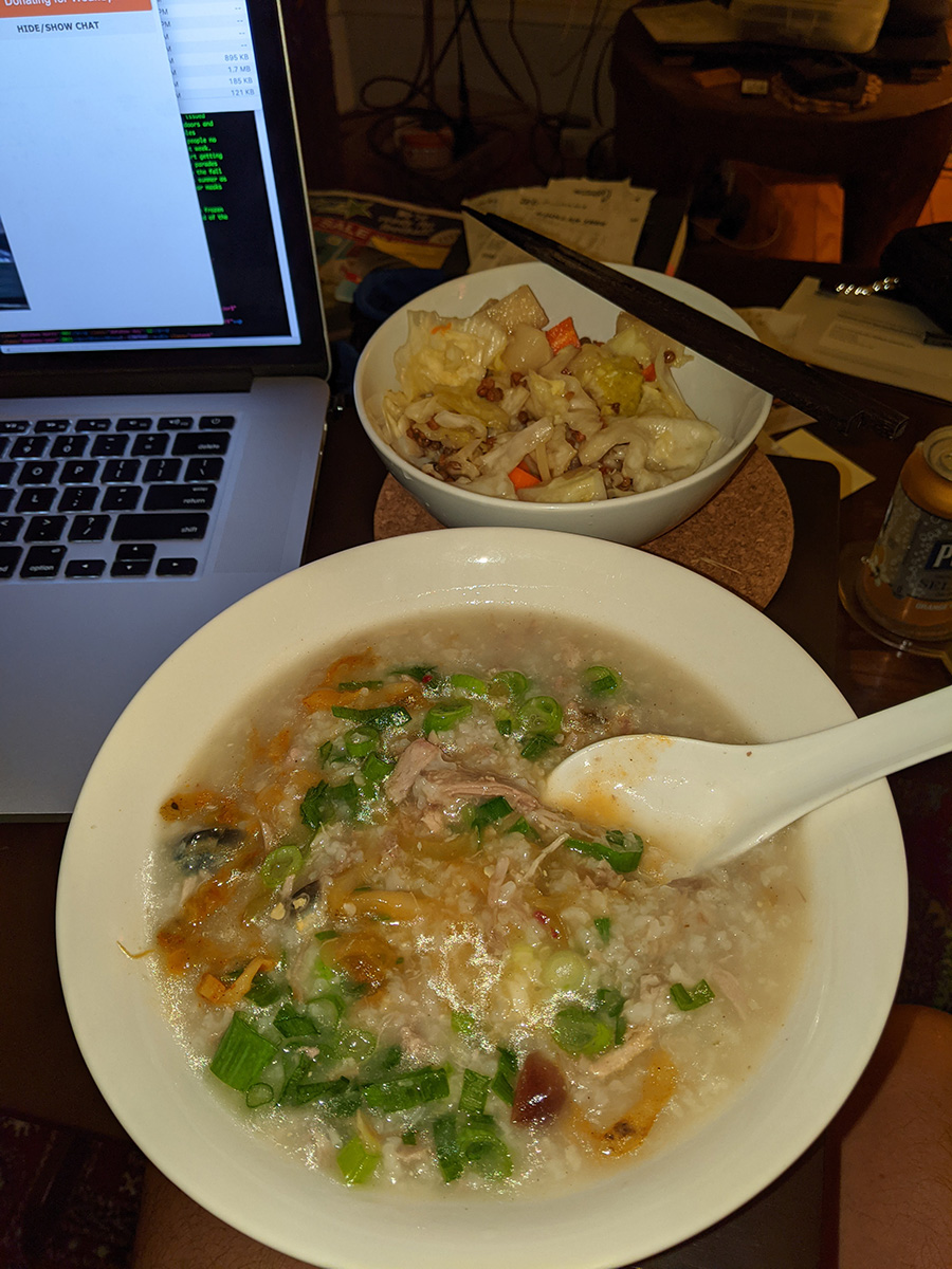 for dinner i reheated some congee. i also scooped out some sichaun paocai. it'd only been in the jar for nearly 2 months, and already the daikon radishes have turned soft to the point of being mush. the carrots are okay, and most of the cabbage.