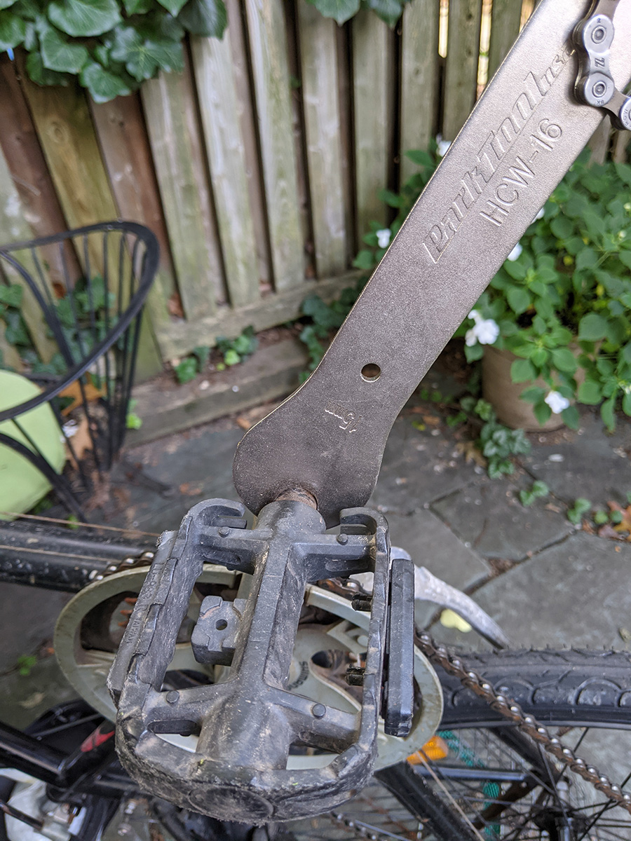 my utility bike is starting to chain skip again, so it's finally time to replace the crankset. i got my park tool CCP-22 crank puller and went to work on the bike. first i tried to remove the pedals using a 15mm pedal wrench, but they wouldn't budge. i then tried pulling the old crankset and crank arm off, but they wouldn't budge. while trying to remove the crank arm, it made a loud snapping sound and i noticed the crank puller was at a weird angle. when i removed it, the front adjustable threaded metal piece had split apart. i gave up for the time being and cleaned the bike a bit and oiled the chain before putting it away.