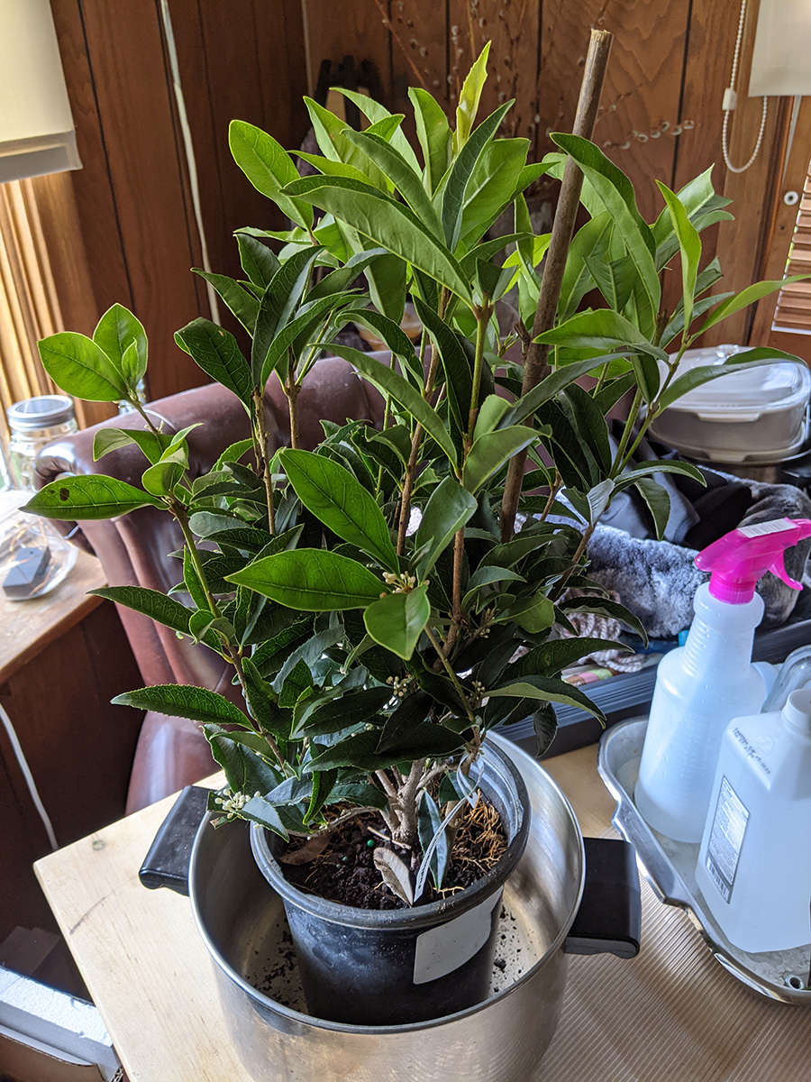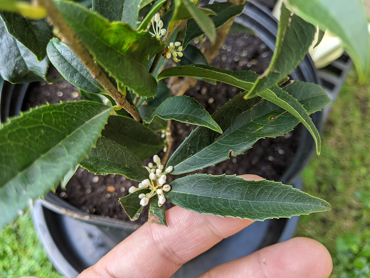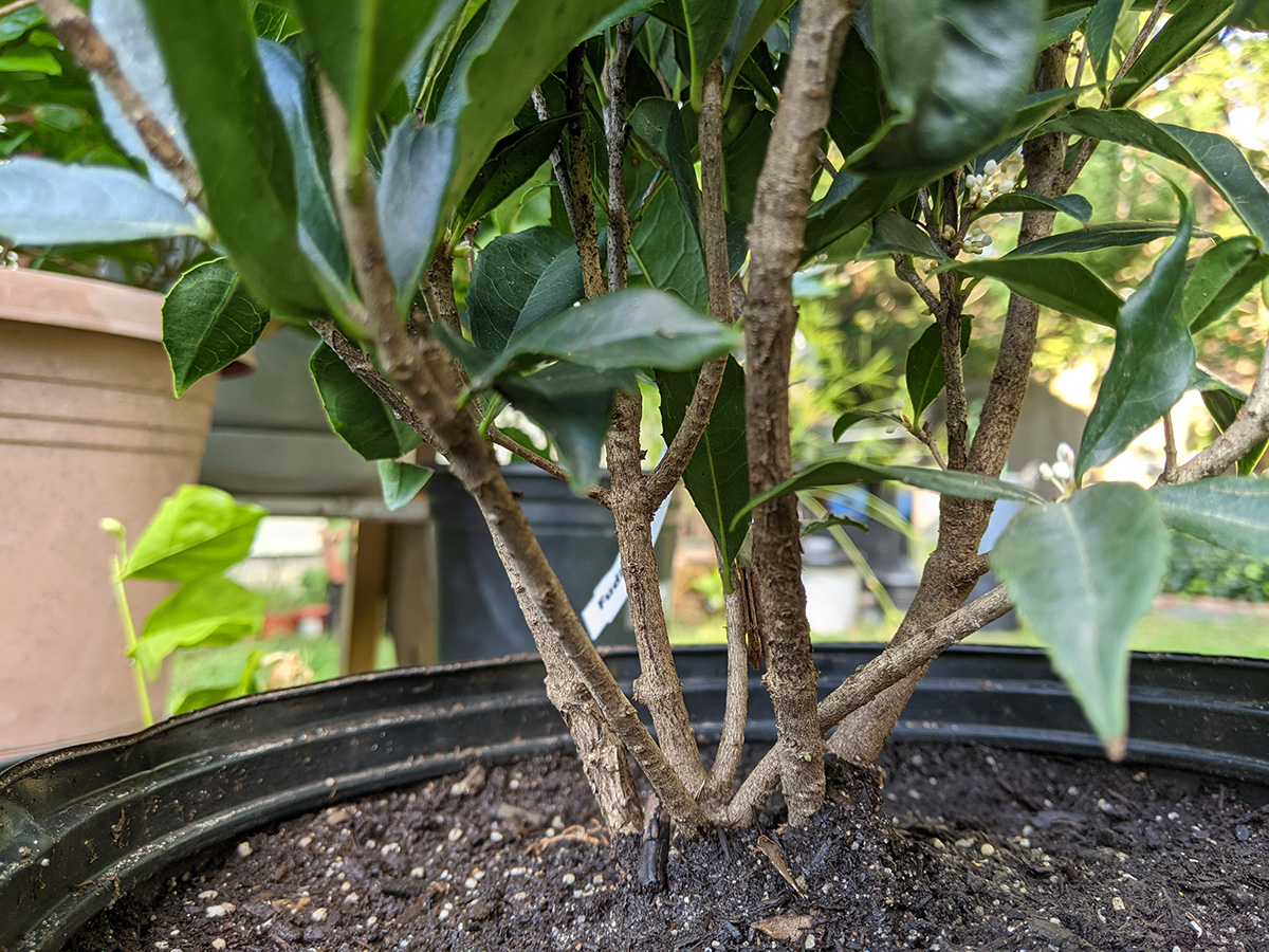 i checked out the osmanthus that arrived last night. it wasn't as fragrant as i'd imagined, i had to get really close in order to smell the fragrance. but the tiny flower buds were just about to open, so maybe after a few weeks they'll smell better. we transferred it from its original 1 gallon put into a 2 gallon pot. for the soil we mixed a combination of potting soil with a bit of playground sand for drainage. my father put some lava rocks at the base and we added a layer of chicken manure, even though the potting soil itself had fertilizer balls. an osmanthus grows more like a bush than a tree. the base branches are a little tangled, we may need to prune them next season, maybe save and propagate them as cuttings. it seems to have two types of leaves: young leaves on the top which are lighter and oval-shaped with smooth edges, and older leaves on the bottom which are darker, thinner, with toothed edges.