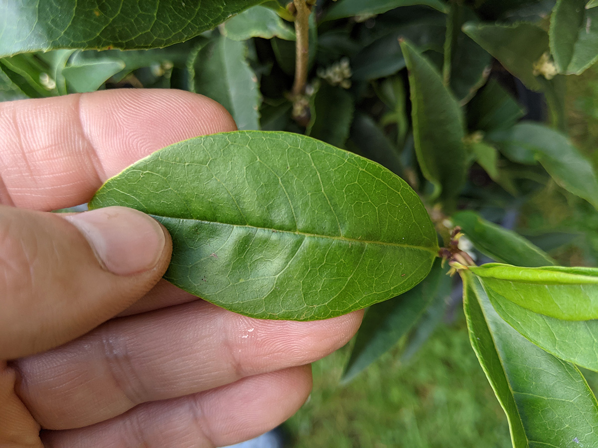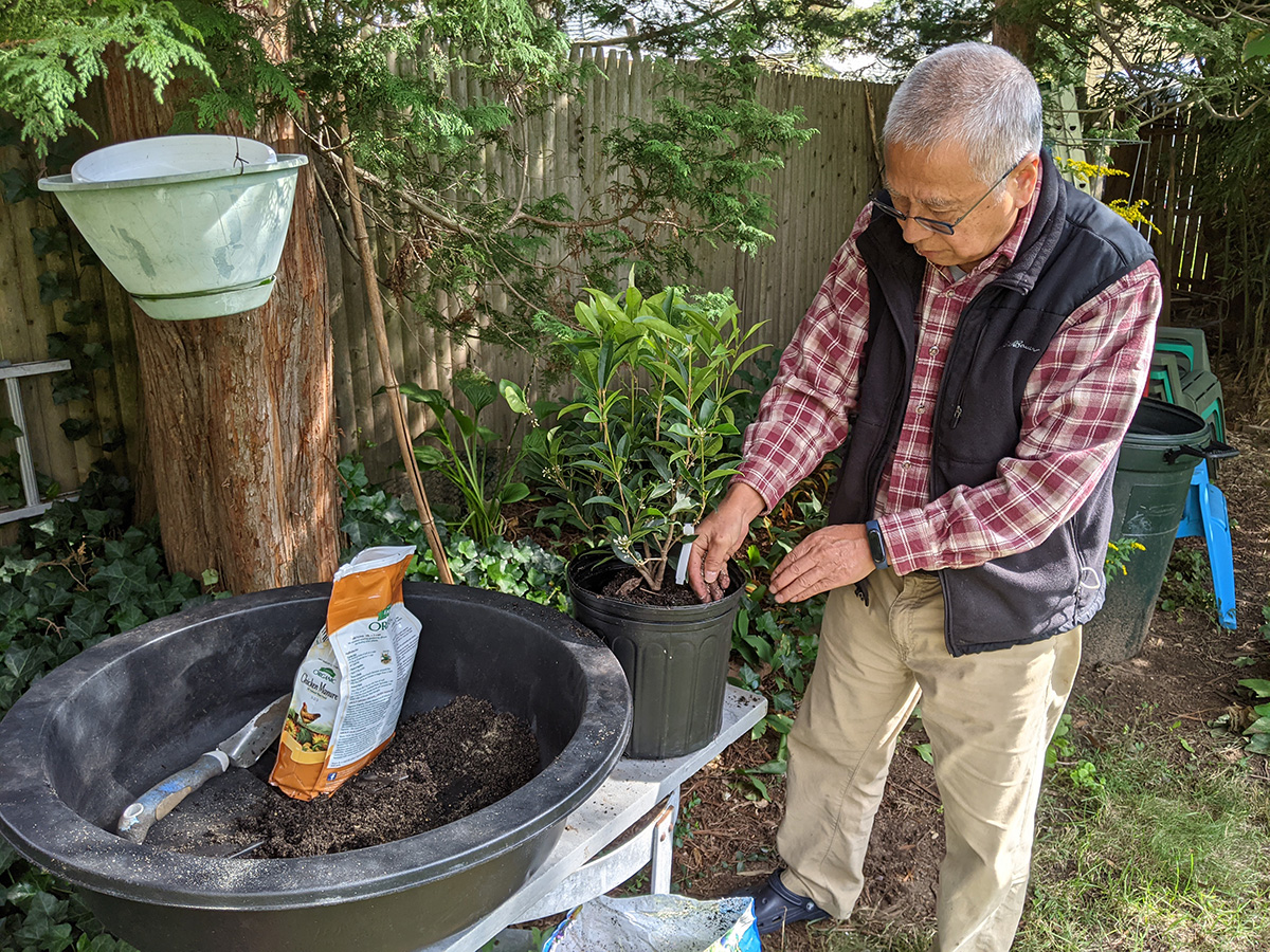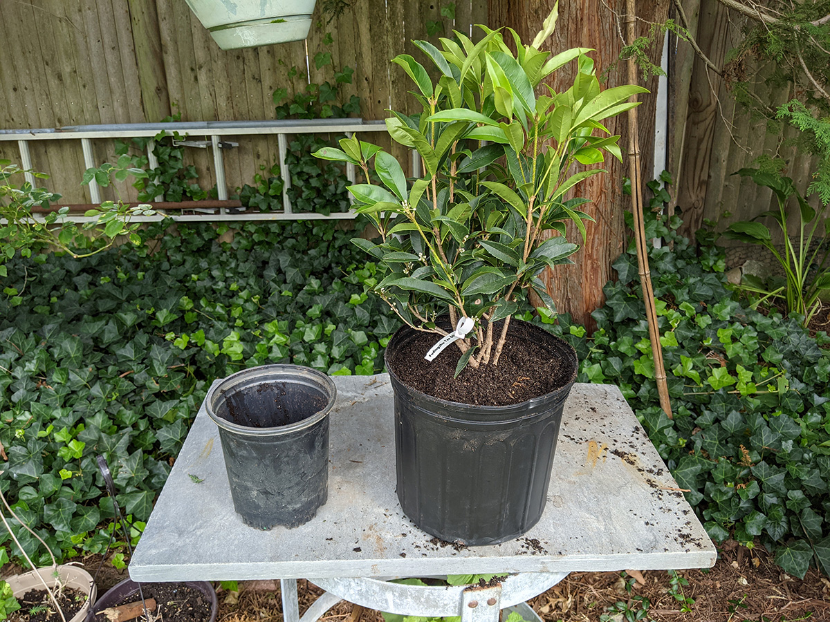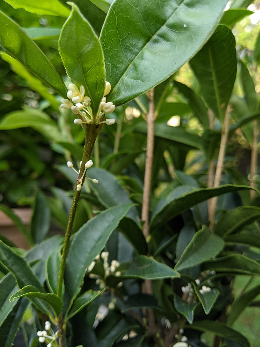 i checked out the osmanthus that arrived last night. it wasn't as fragrant as i'd imagined, i had to get really close in order to smell the fragrance. but the tiny flower buds were just about to open, so maybe after a few weeks they'll smell better. we transferred it from its original 1 gallon put into a 2 gallon pot. for the soil we mixed a combination of potting soil with a bit of playground sand for drainage. my father put some lava rocks at the base and we added a layer of chicken manure, even though the potting soil itself had fertilizer balls. an osmanthus grows more like a bush than a tree. the base branches are a little tangled, we may need to prune them next season, maybe save and propagate them as cuttings. it seems to have two types of leaves: young leaves on the top which are lighter and oval-shaped with smooth edges, and older leaves on the bottom which are darker, thinner, with toothed edges.