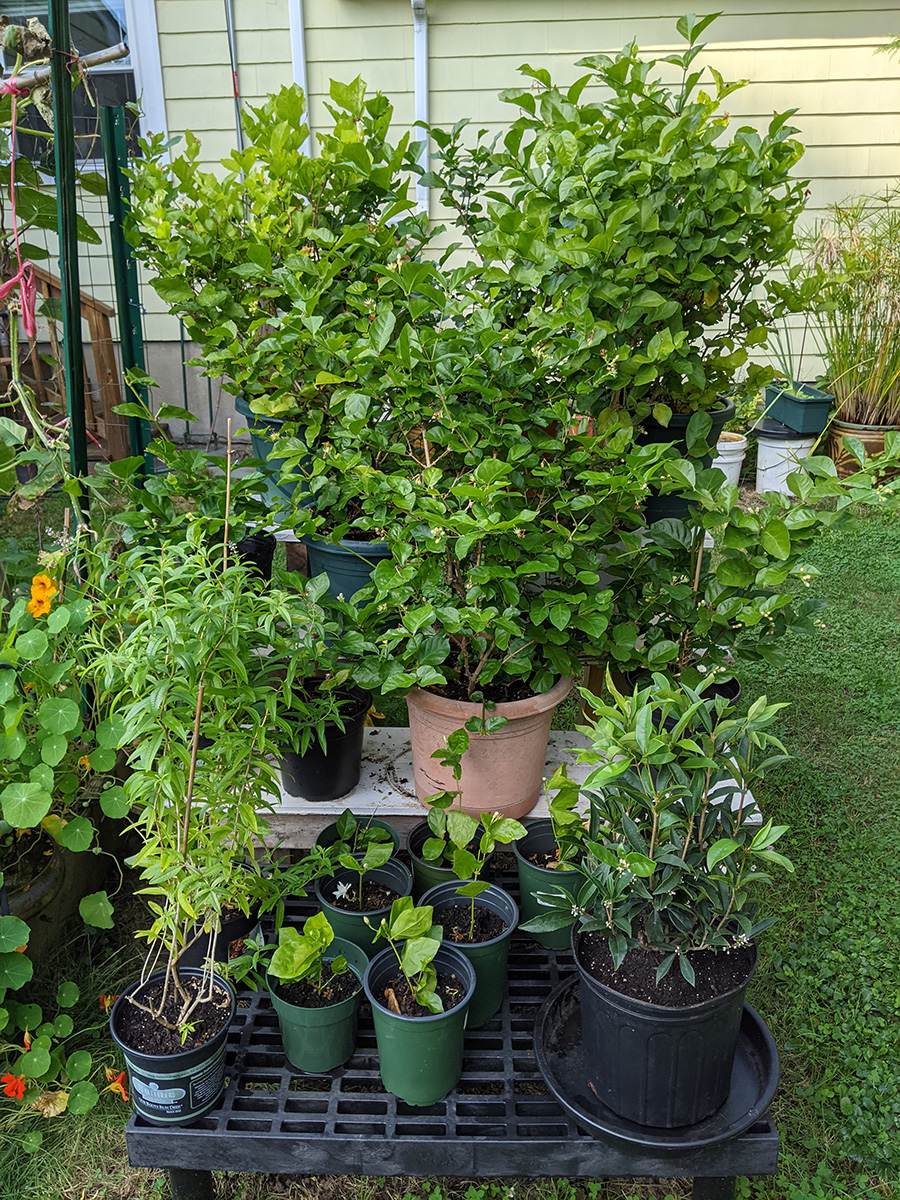 i discovered last night that home depot also sells osmanthus tea olive plants via their website, with free home delivery. for about the same price ($34) as the 1-gallon fudingzhu osmanthus we bought from etsy, the home depot osmanthus is twice as big and comes in a 2.25 gal. pot. the only thing is i don't think it's a fudingzhu variety, but just a generic osmanthus fragrans (AKA tea olive), the type with large drooping white flowers. my father decided to get one, after telling me he's always wanted an osmanthus (disregarding the one we just got), and even tried to get his california cousin to send him one. this specimen will most likely live at the cafe.