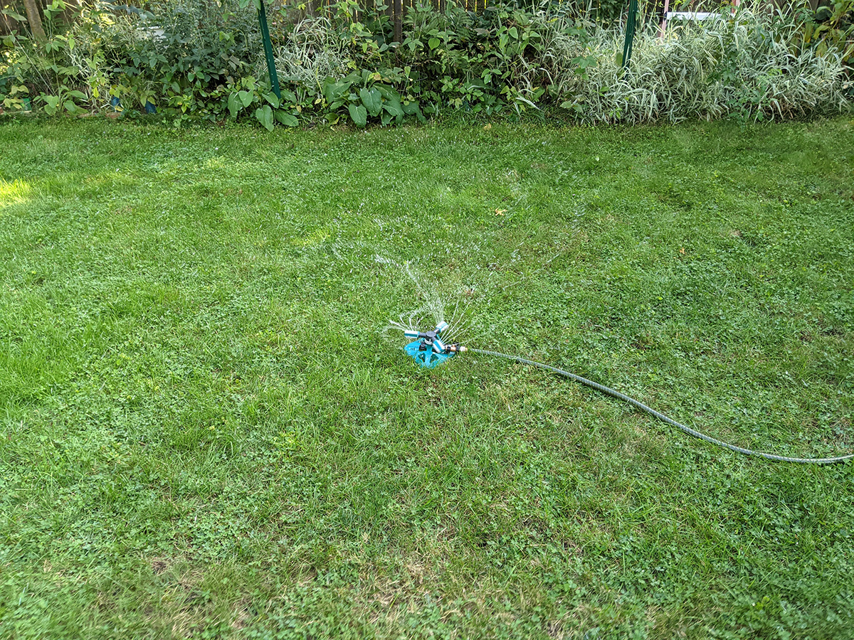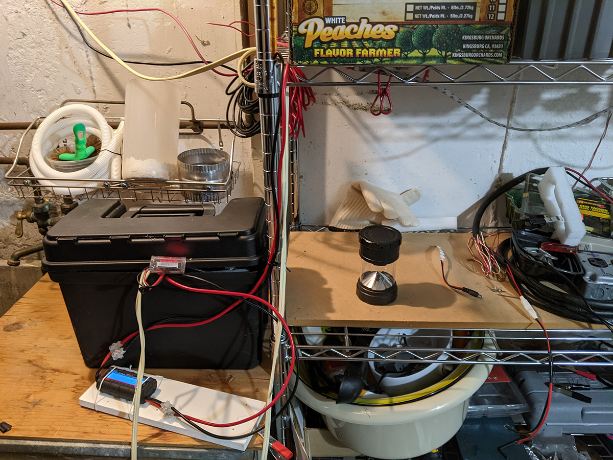 in the meantime, he moved the portable battery station we built back in september 2019 from the garage (where it was driving the front lawn water pump) to the basement (to drive the backyard on-demand pump). that allowed me to water the backyard lawn and to use up most of the rain barrel water since it's going to a lot tomorrow night into monday morning.