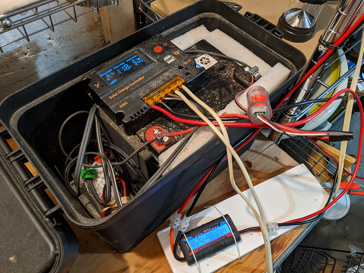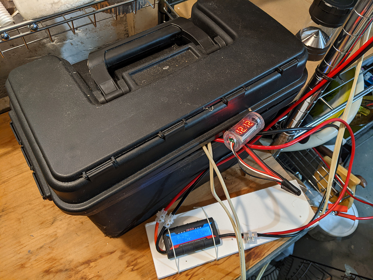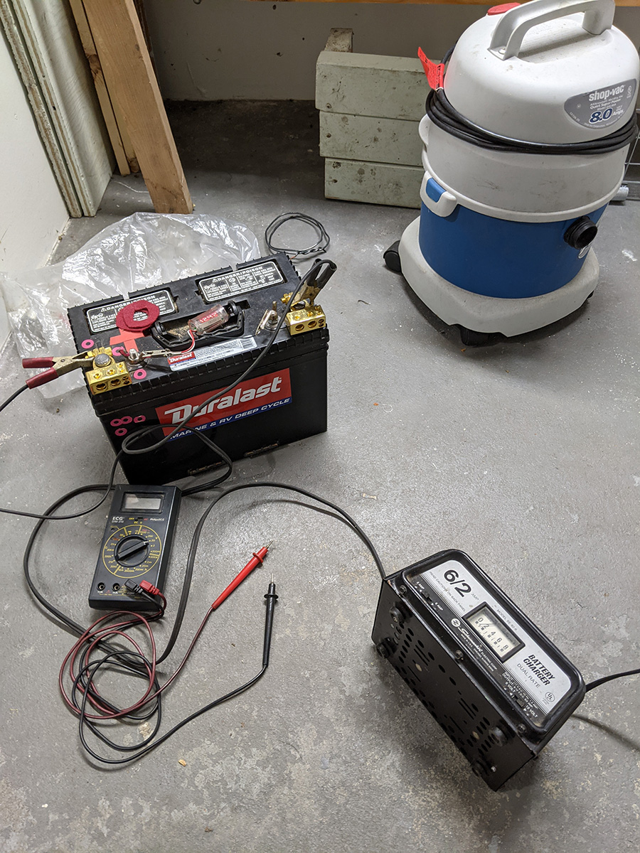 my father told me that the large marine deep cycle battery in the basement we use to run our on-demand pump for the rain barrels was dead. he tried taking a voltage reading, it was low enough to mean the battery was damaged. the controller wouldn't even light up, despite the fact we were still getting electricity from the outside 100W flexible solar panel. my personal theory is the solar panel was blocked by the bitter melon trellis, so the battery hasn't been charging for months, and we finally used up all the electricity. we tried charging it with the trickle charger but it wouldn't work, said we had the polarity reversed even though we didn't. later my father managed to "jump" the battery with our old car battery charger, before switching it to the trickle charger to slow charge.