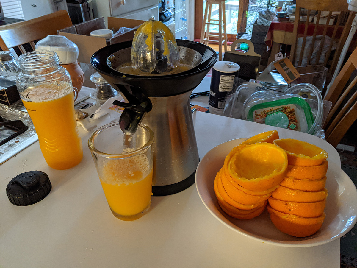 it's starting to get cold in the house. i woke up with a chill, the same feeling i get waking up in the mornings during the winter, when i can feel the cold on my nose. i'm still using my summer blanket when i should be upgrading to the winter blanket. still too early for heat though, unless you're a tetra, because i already turned on the aquarium heater a few days ago. before i even used the bathroom this morning, i was already cutting up oranges and squeezing them for juice. i ended up using all 8 remaining navel oranges.