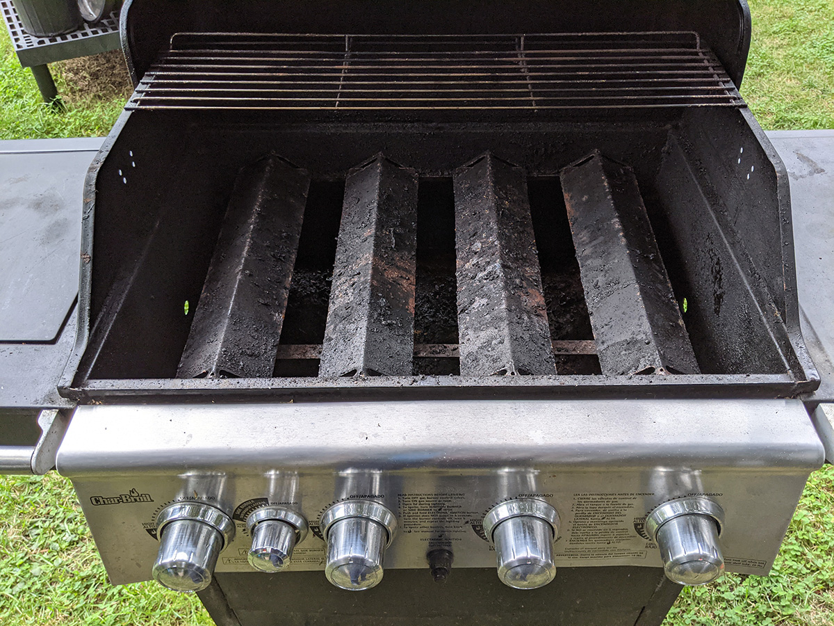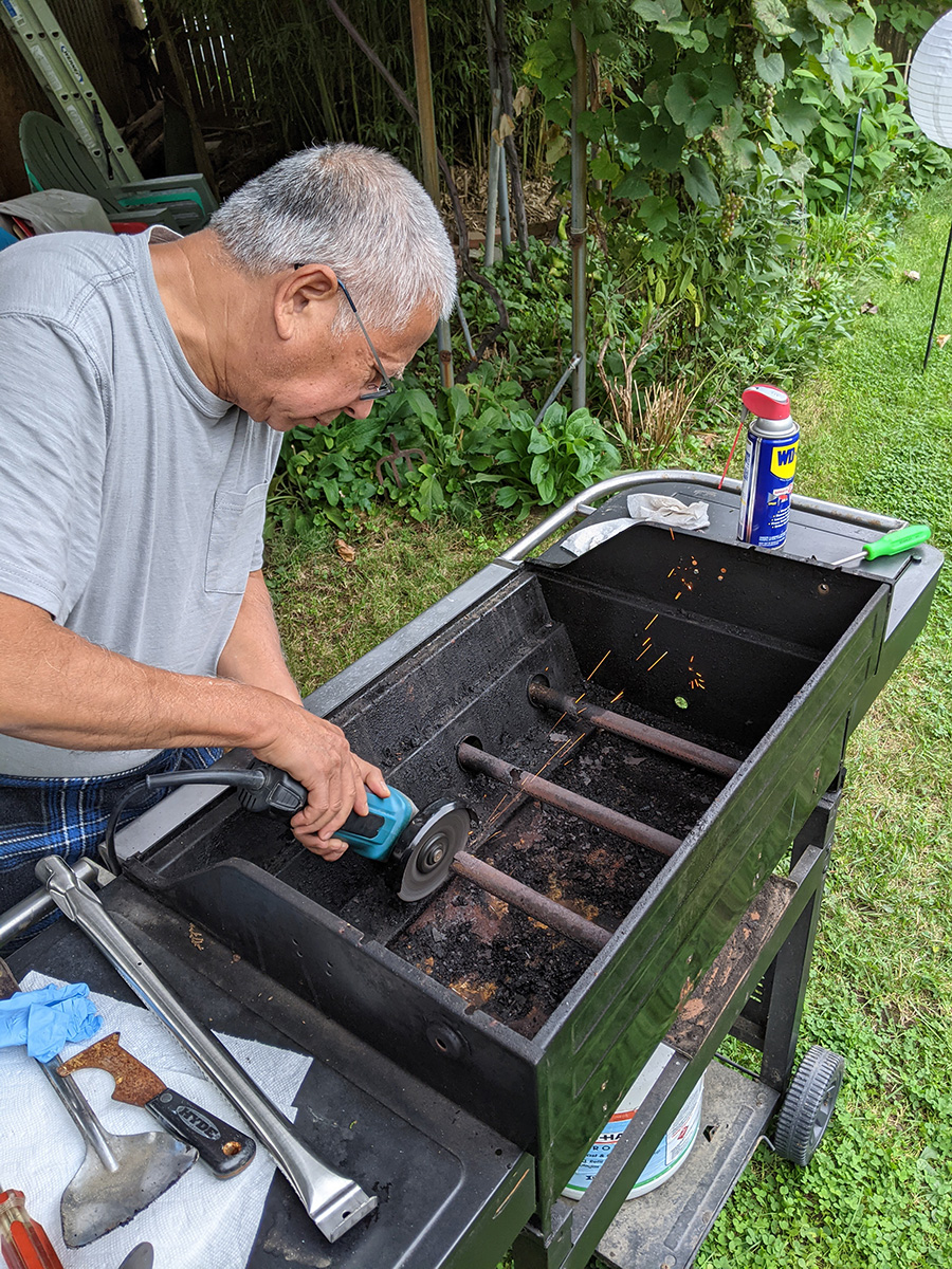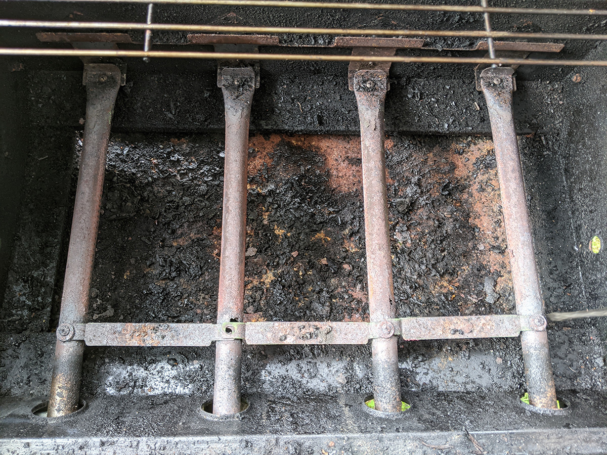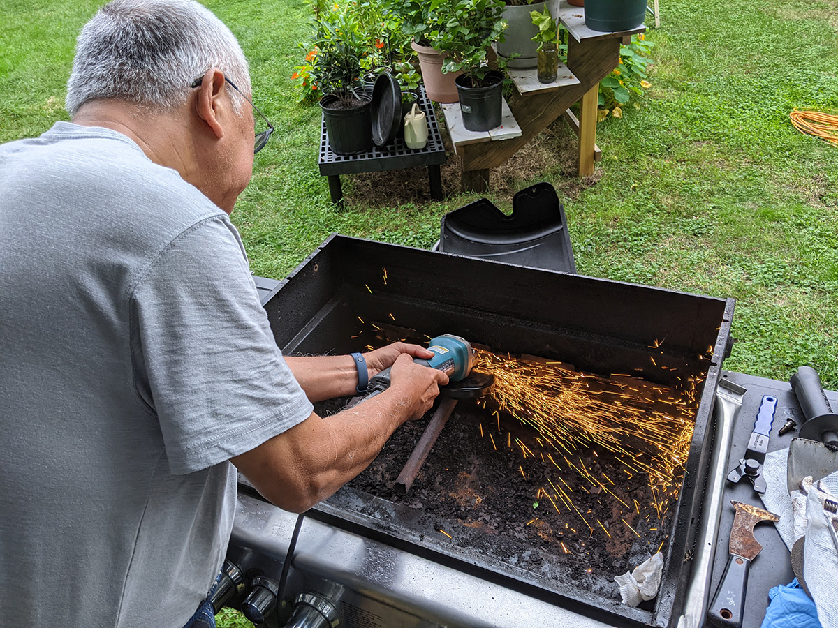 my father and i overhauled our barbecue grill by replacing the burner tubes, burner shield tents, and crossover tubes. we received the spare parts about a month ago but only now getting to replace them. the burner shields were just replaced last year, and were still usable despite suffering a bit of corrosion. however, the kit that we got came with shields, so we ended up replacing everything. the most difficult things was removing the burner tubes and installing the new ones. the screws anchoring the old tubes had rusted shut. we hit it a few times with WD40, but none of the screws would budge. my father ended up cutting the old burner tubes in half with an angle grinder, then grinding off the screws. good thing he recently replaced the sanding pad on the grinder. it was quite the production, with sparks flying everywhere.