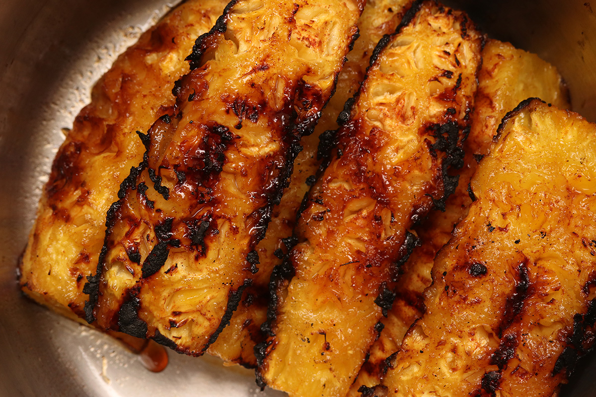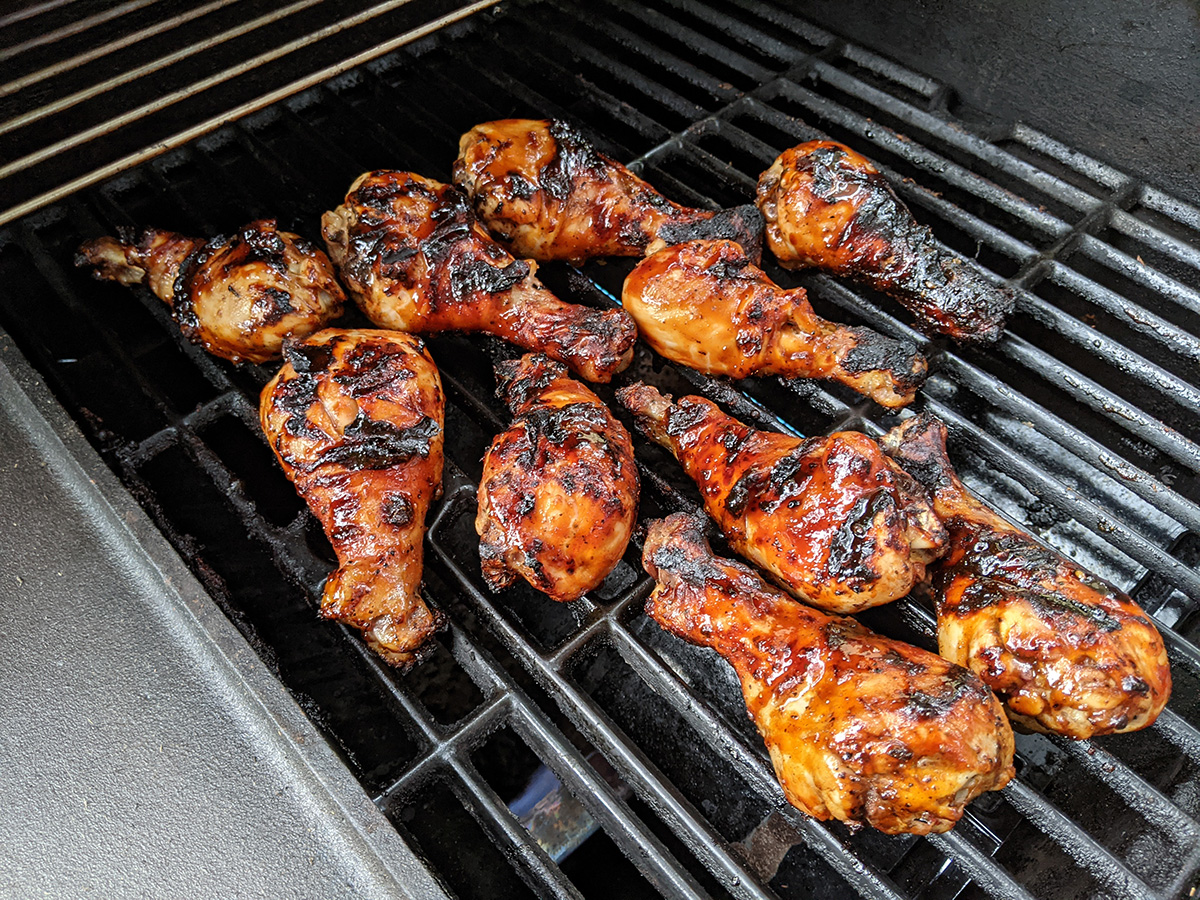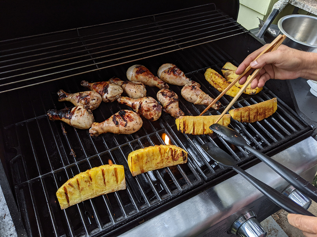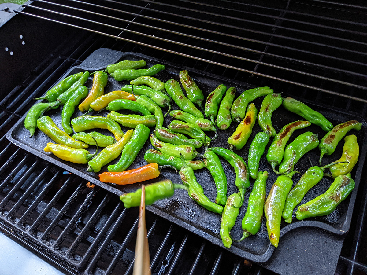 around 5pm my father started grilling some food for dinner: drumsticks and pineapples, followed by shishito peppers. earlier my mother had marinated the chicken, but in something that smelled very much like italian dressing, so there was a strong vinegary smell and taste. afterwards i brushed it with sauce but i must've had a brain fart because i used korean barbecue sauce instead of our usual thai sweet chili sauce. i think they came out okay, but the vinegary marinade was a little overpowering. the pineapples were just marinated in some sugar and cinnamon, when the secret ingredient is melted butter. it was for the best we didn't add the butter, because the pineapple themselves were a little tart. afterwards we put a retangular cast-iron griddle and grilled a bunch of shishito peppers that had previously been tossed with some olive oil. we also sprinkled some sea salt for flavor. i believe this is our first time using this griddle that i found. we have a round cast-iron one but it doesn't fit inside of the barbecue grill. while waiting for the food to finish cooking, we saw a palm warbler hanging out in the pine tree - yellow with a reddish brown cap. that reminds me of the carolina wren i saw hiding in the yew bush yesterday.