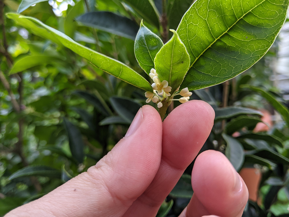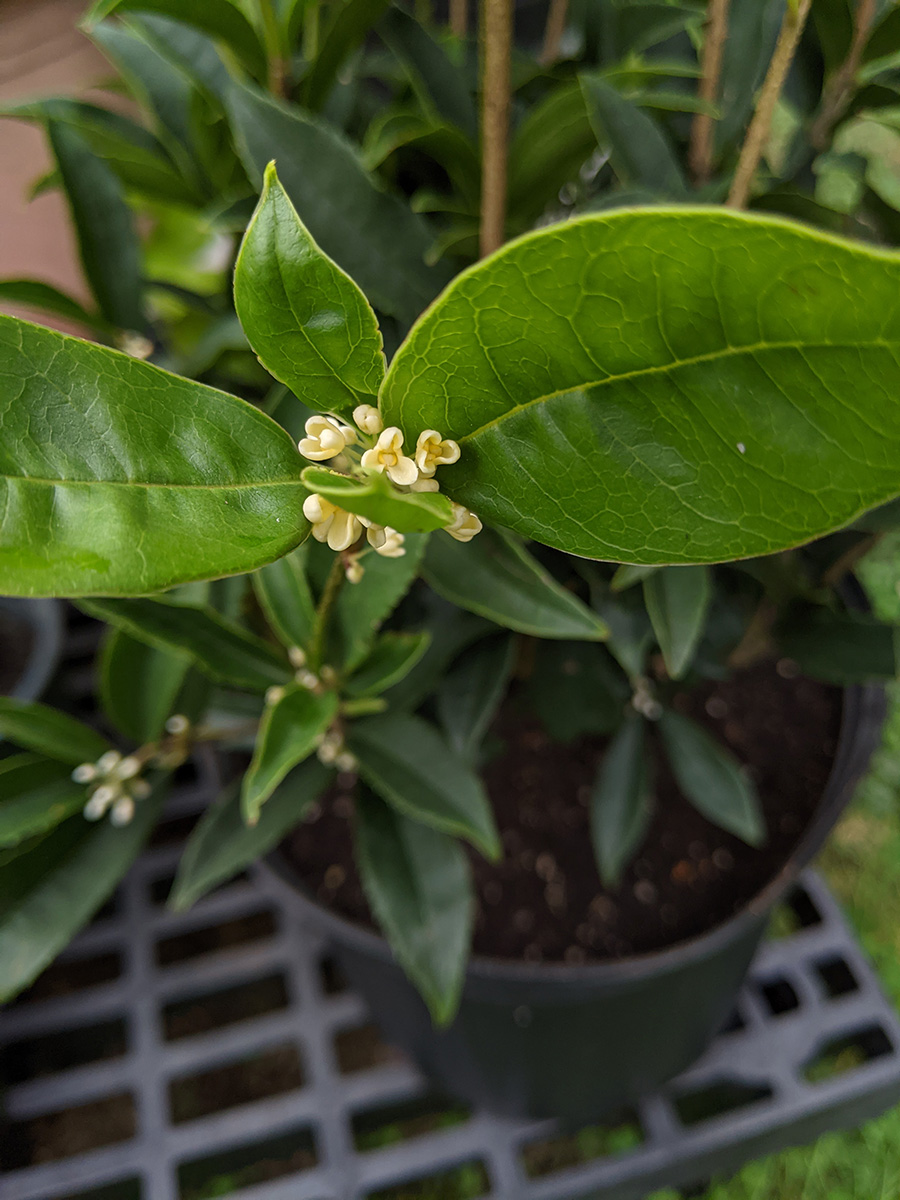 depending on where we were standing outside today, we could smell the osmanthus flowers. pound for pound, they have the most potent fragrance given how small the flowers are. in the evening i moved it inside given how much it's going to rain over the next 2 days, we don't want the newly transplanted osmanthus to get completely soaked.