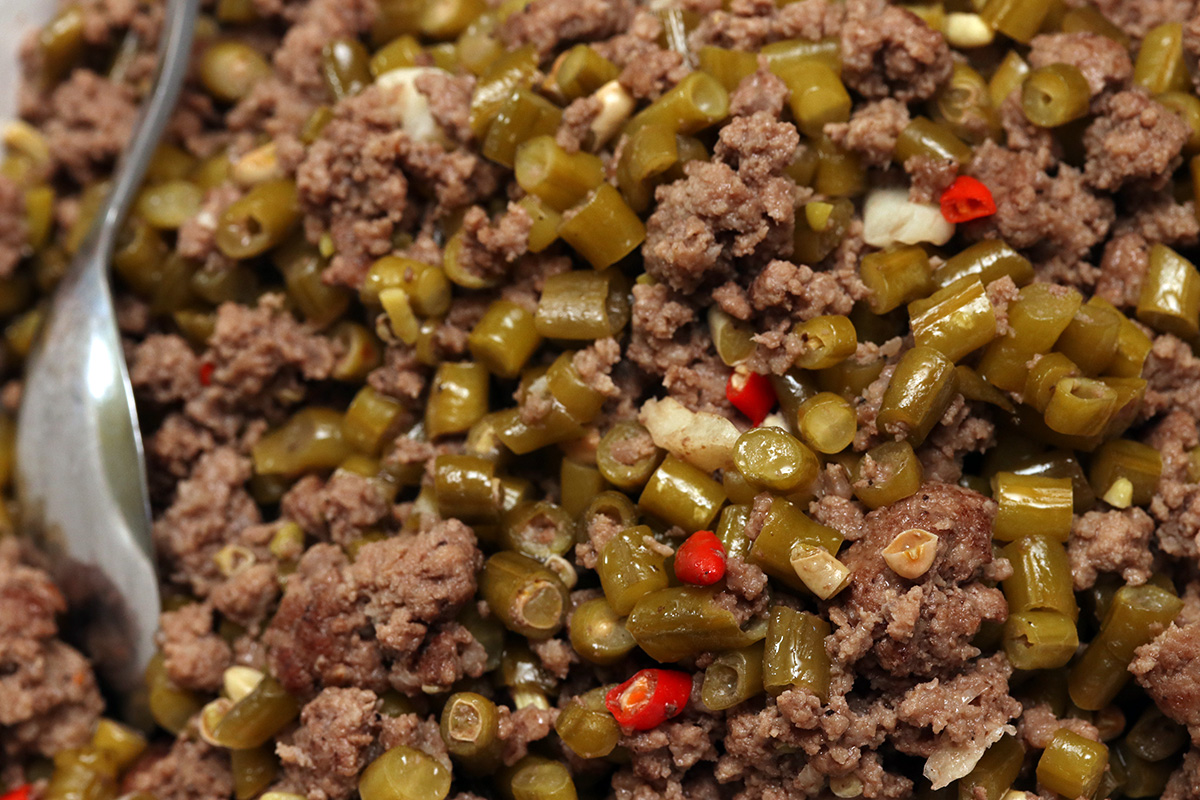 my mother cooked up another batch of fermented long beans for dinner. the beans tasted very good, sour yet chewy (sometimes the store bought variety aren't very fresh the beans are soft); the minced beef was a little too sweet though (my mother added sugar because she was afraid the beans would be too sour) and not salty or spicy enough.
