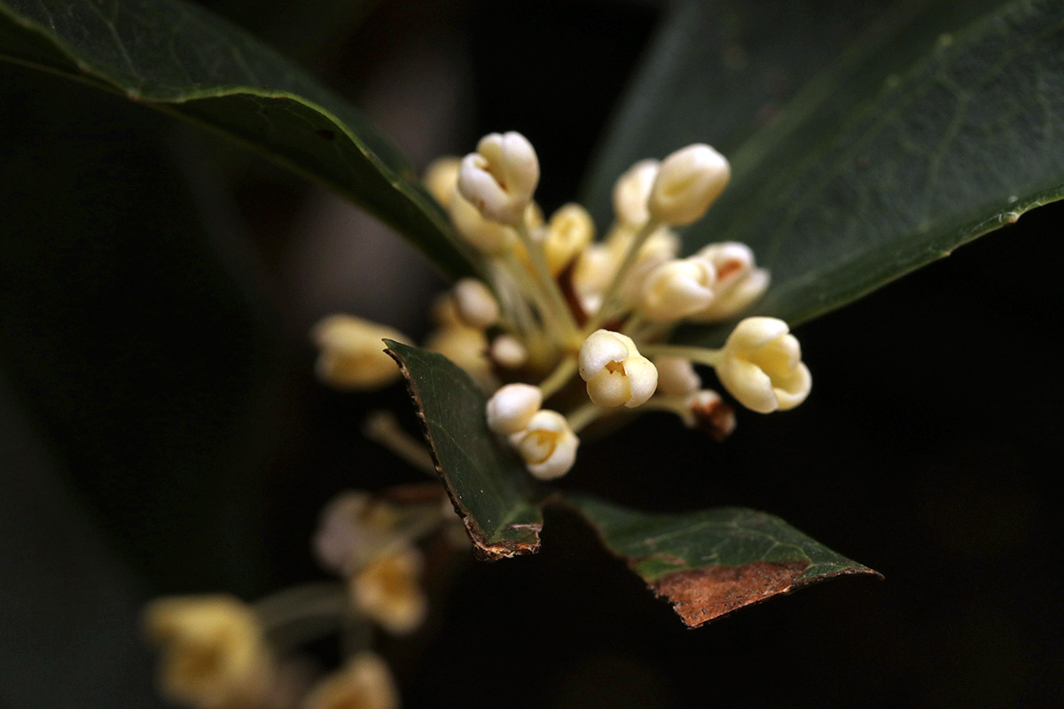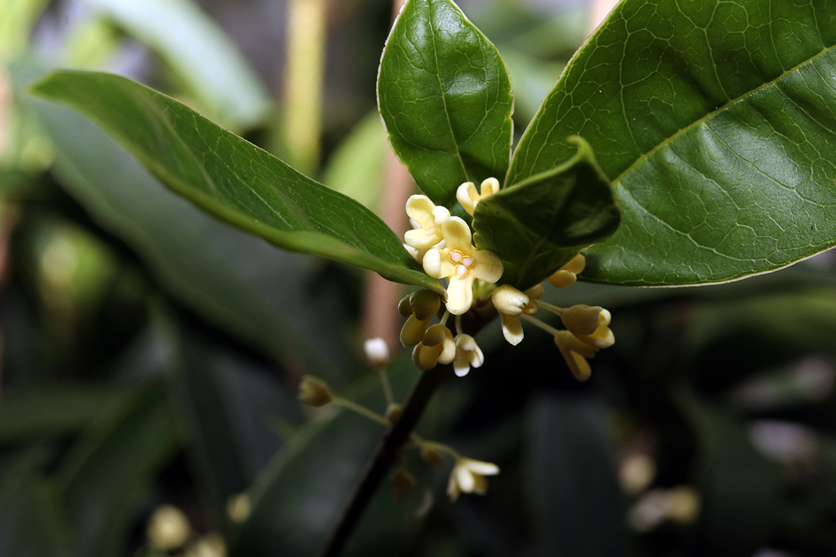first thing i noticed when we got inside the house was the smell of osmanthus flowers. i wish we could keep it indoors, since putting it outside seems like a waste of fragrance, but it'd get more sun outside. my father has been studying the plant and says there will be even more flowers compared to what we have now. the flowers seem to appear on the terminal end of branches, as well as on the bare stems between leaf nodes.
